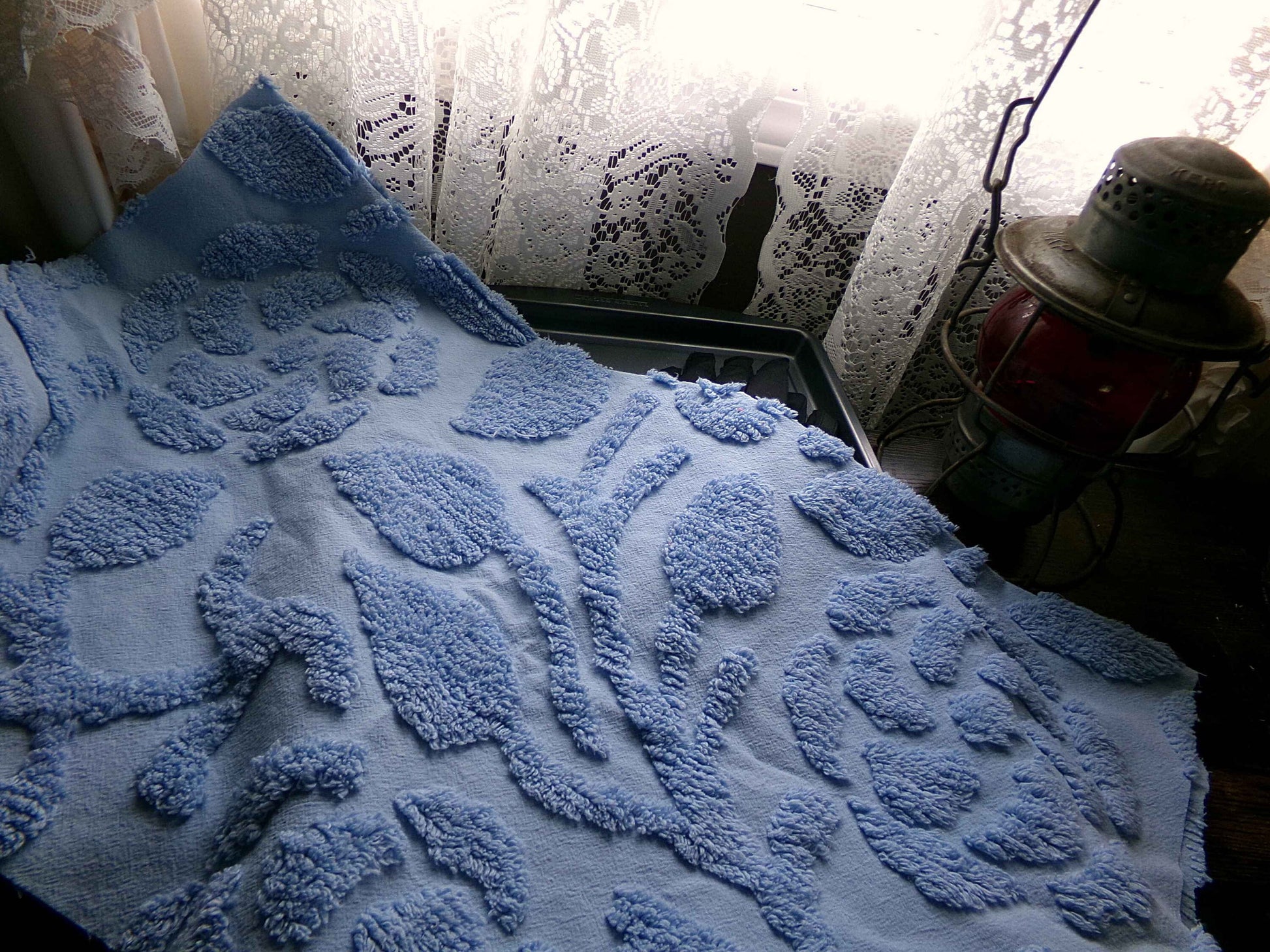 Large, sculpted serene blue rose blooms bring a soothing essence on this 28" x 24" inch piece of vintage chenille fabric. Dramatic sweeping leaves add a touch of elegance to the design. Ideal to infuse tranquility in DIY pillows, handmade chenille quilts & more.The fabric is very adaptive to light, so I took photos in high, low & medium settings to show this. 100% cotton, strong & easy to sew withw h a t - t o - k n o w
