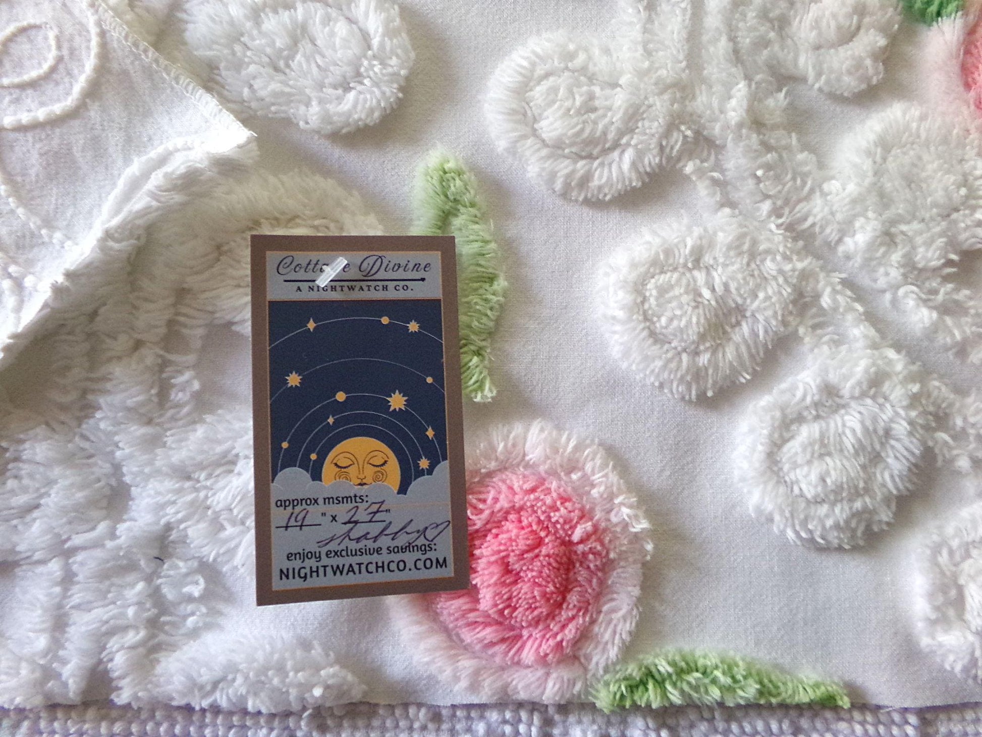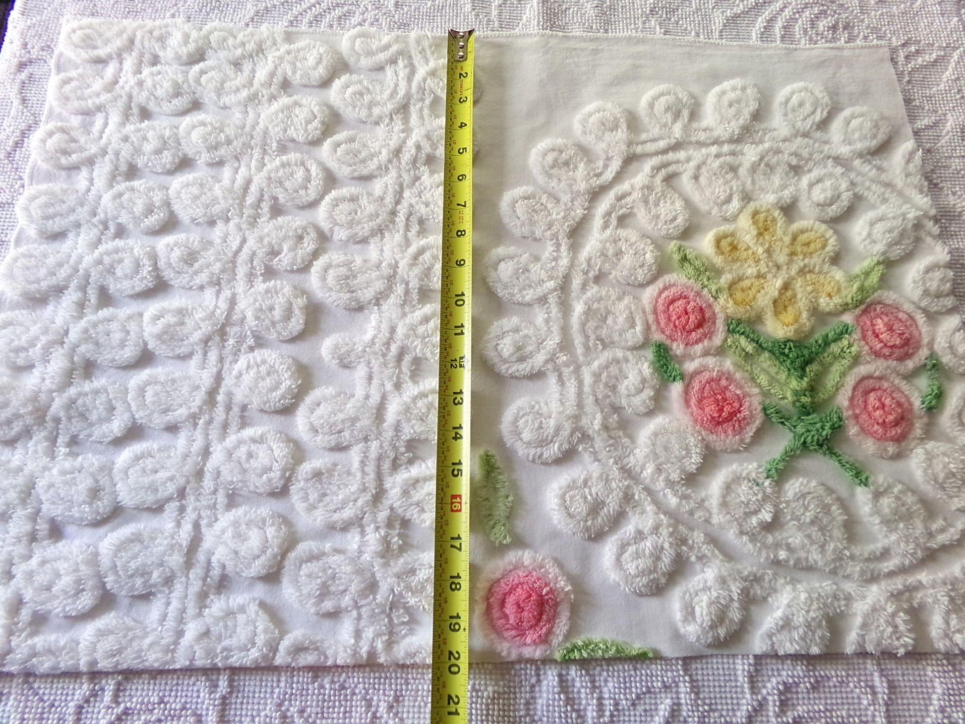 What a beautiful piece of vintage chenille fabric, in a white "bridal cake" floral design which presents tufts of swirling white curlicues that emphasize an offset floral motif with four pink rosettes & a yellow daisy flower.Measures 19" x 27" inches. 100% cotton. Few minor pinholes & skipped tufts, common to this design (final img).