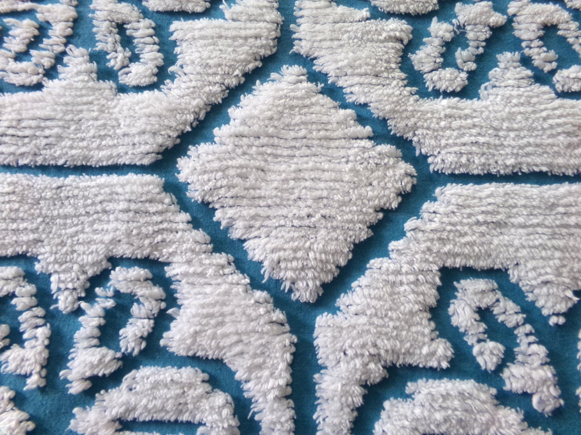 Love the color on this piece of chenille fabric - it's in a deep, sea glass blue with dense white tufting. The reverse side offers an equally interesting design. If you like this pattern, I also have the same fabric in red, pink, and purple.Approx 20" x 25" piece, irregular. Sourced from a soft cotton blend vintage chenille bedspread, circa 1960s era. Common to this pattern, you'll notice natural skips to the tuft work. A great fabric for coastal theme designs - from quilts to small wall hangings and accent pillows.