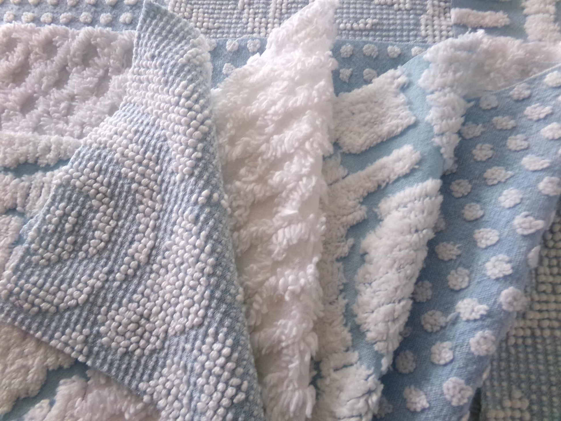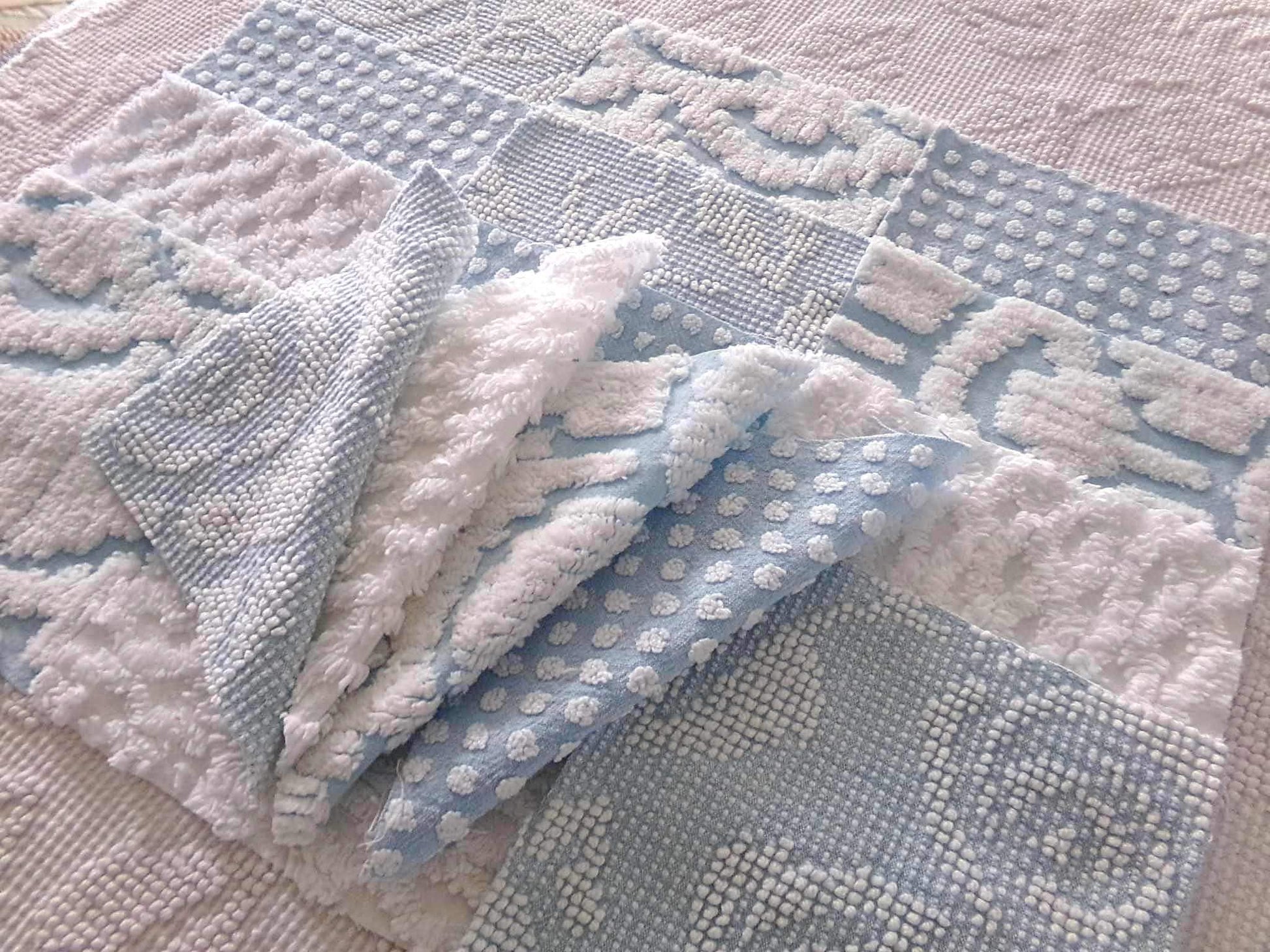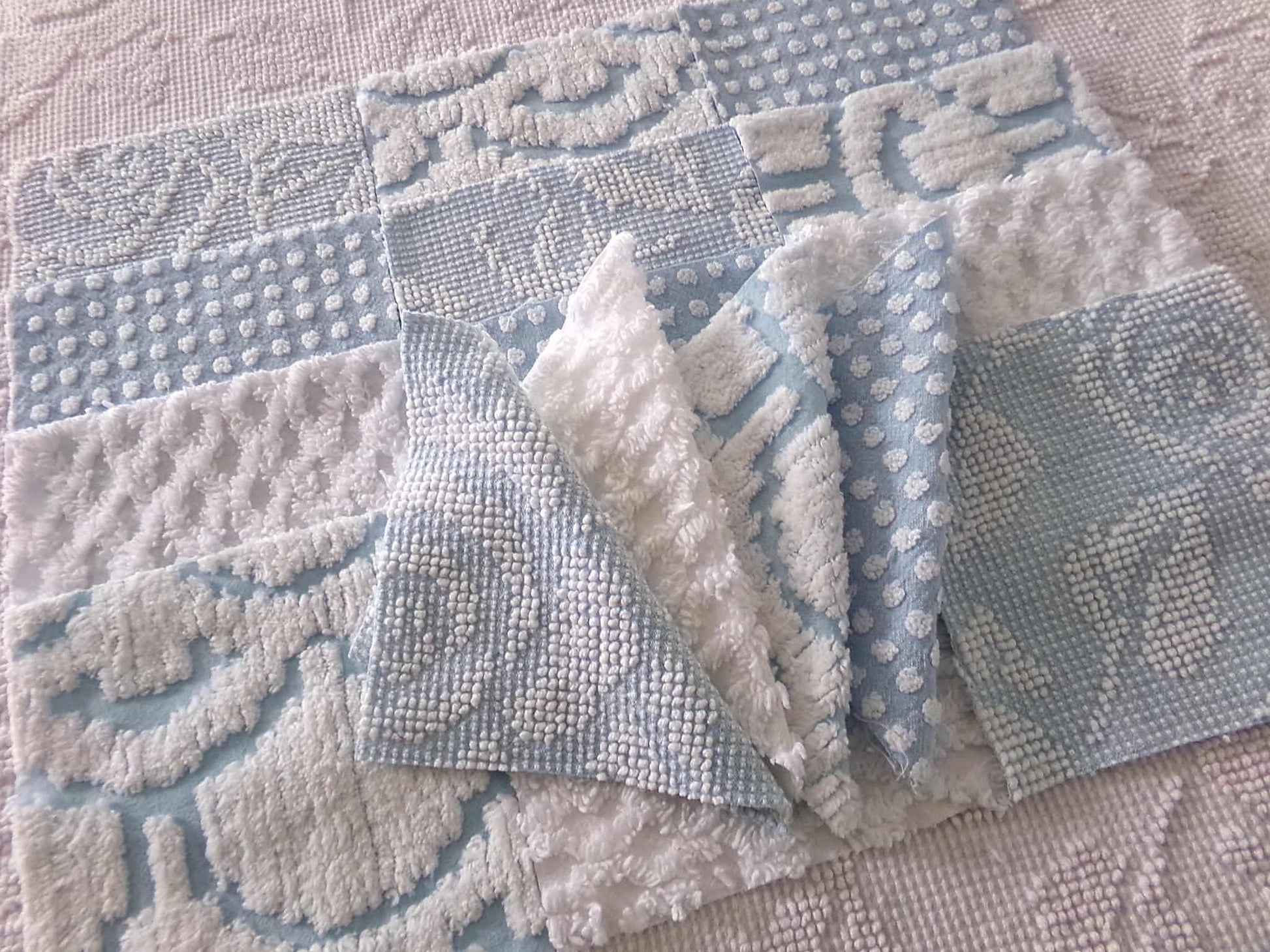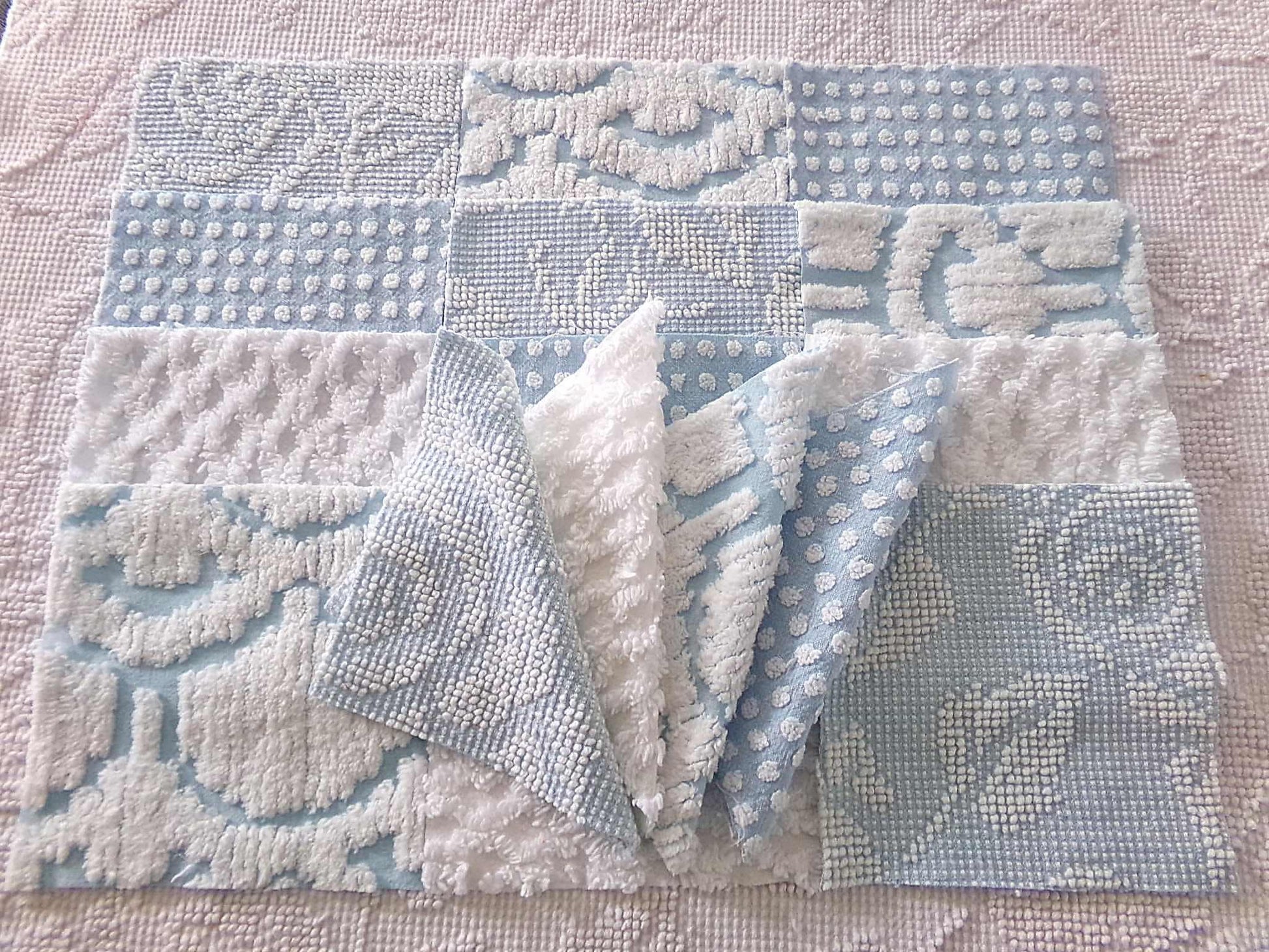 "Seaside Chill" ... These classic chenille fabric squares were assembled to emphasize cool tone blue & white colors in a variety of textures. Ideal in coastal themed designs or anywhere you need a fresh, breezy presence.You'll receive 4 of each pattern: white lattice, white dot on blue, sculpted white "clouds" on blue; blue & white woven hobnail.