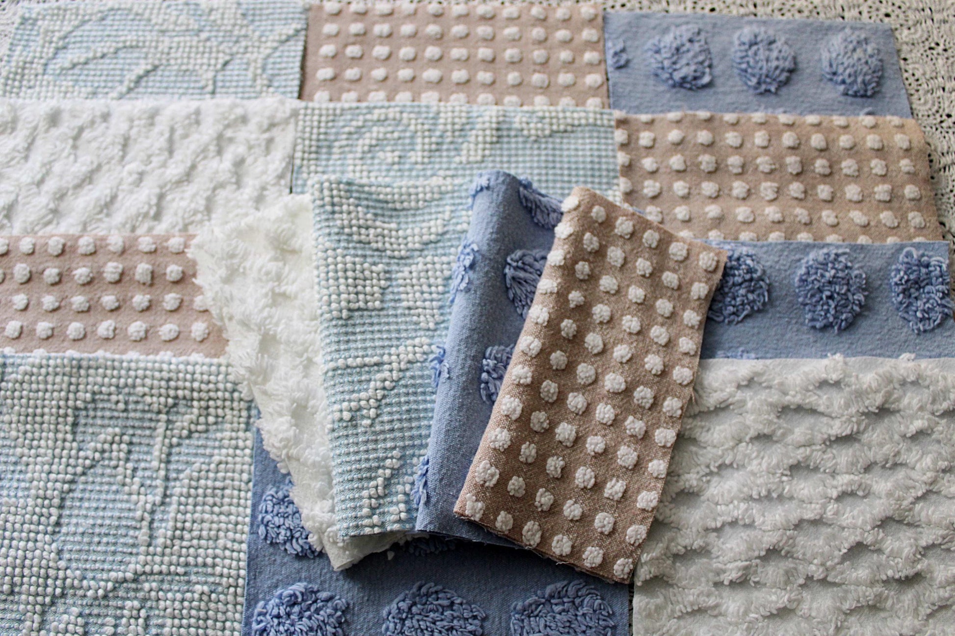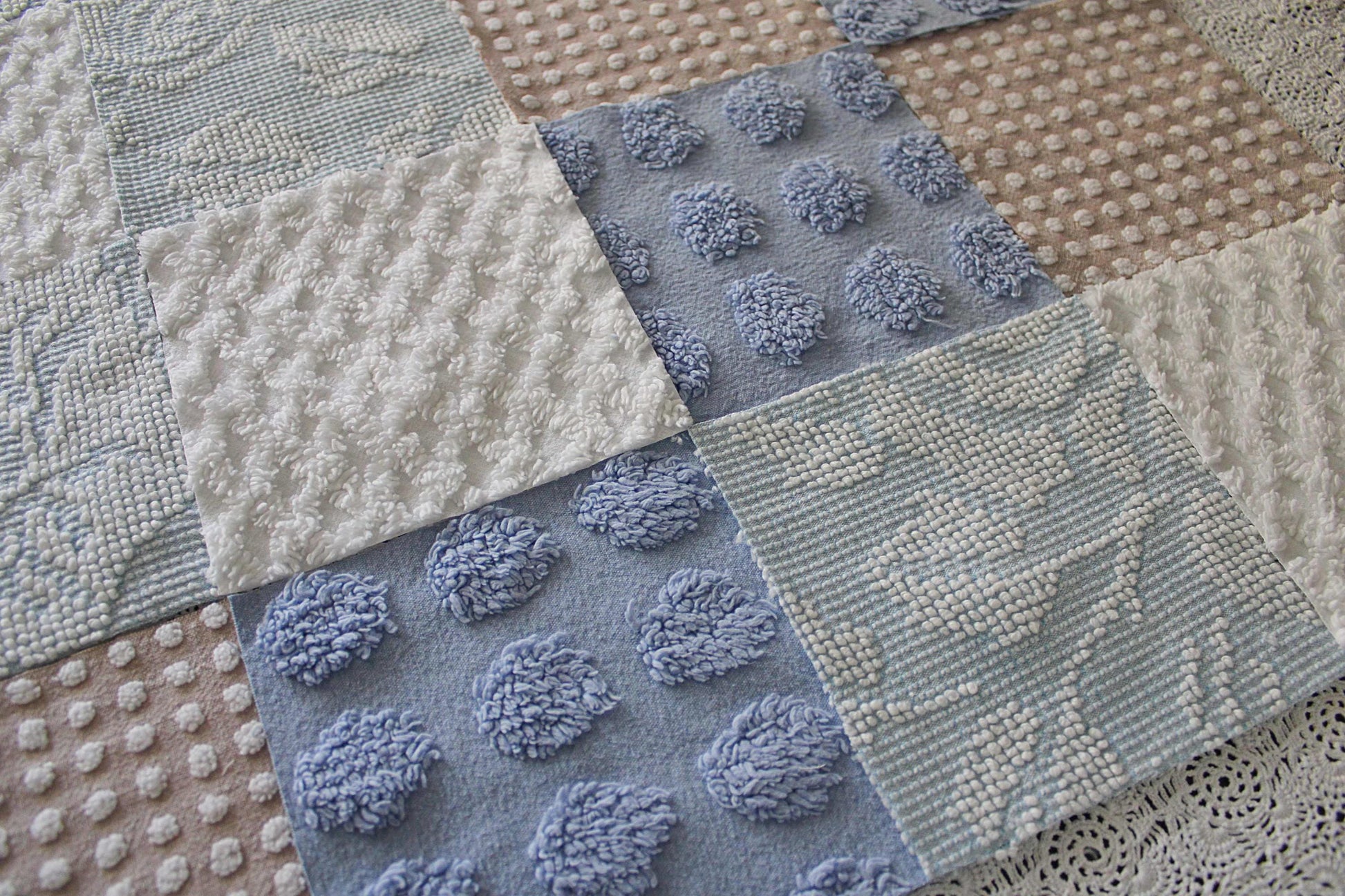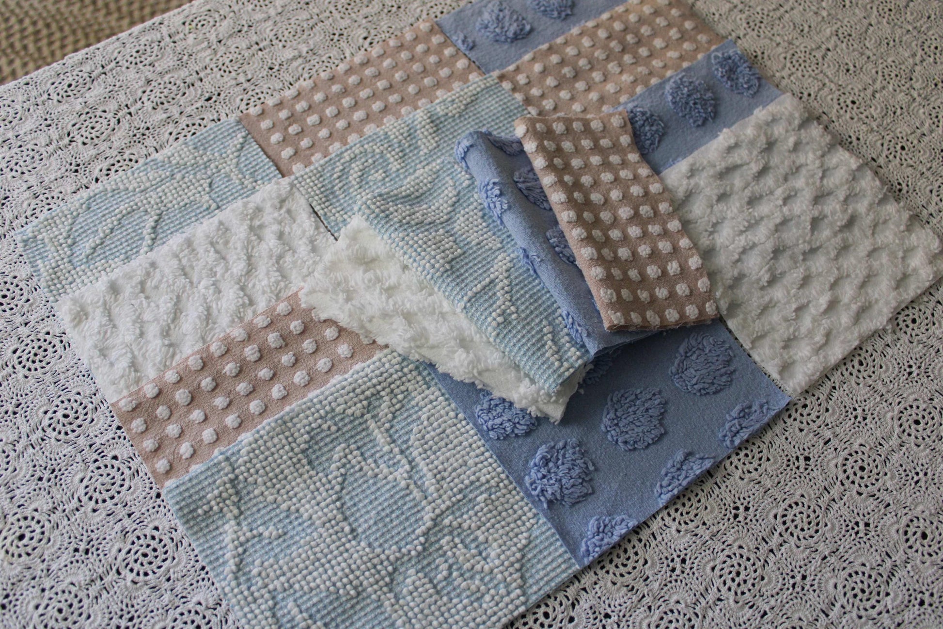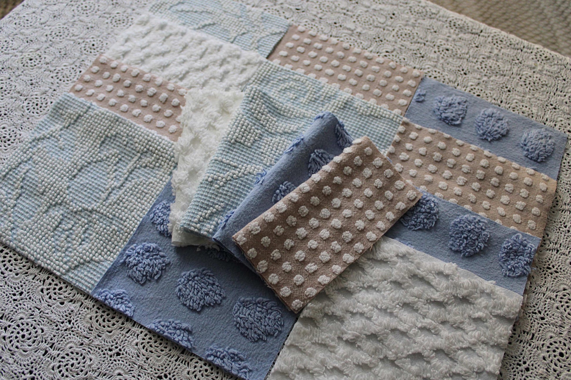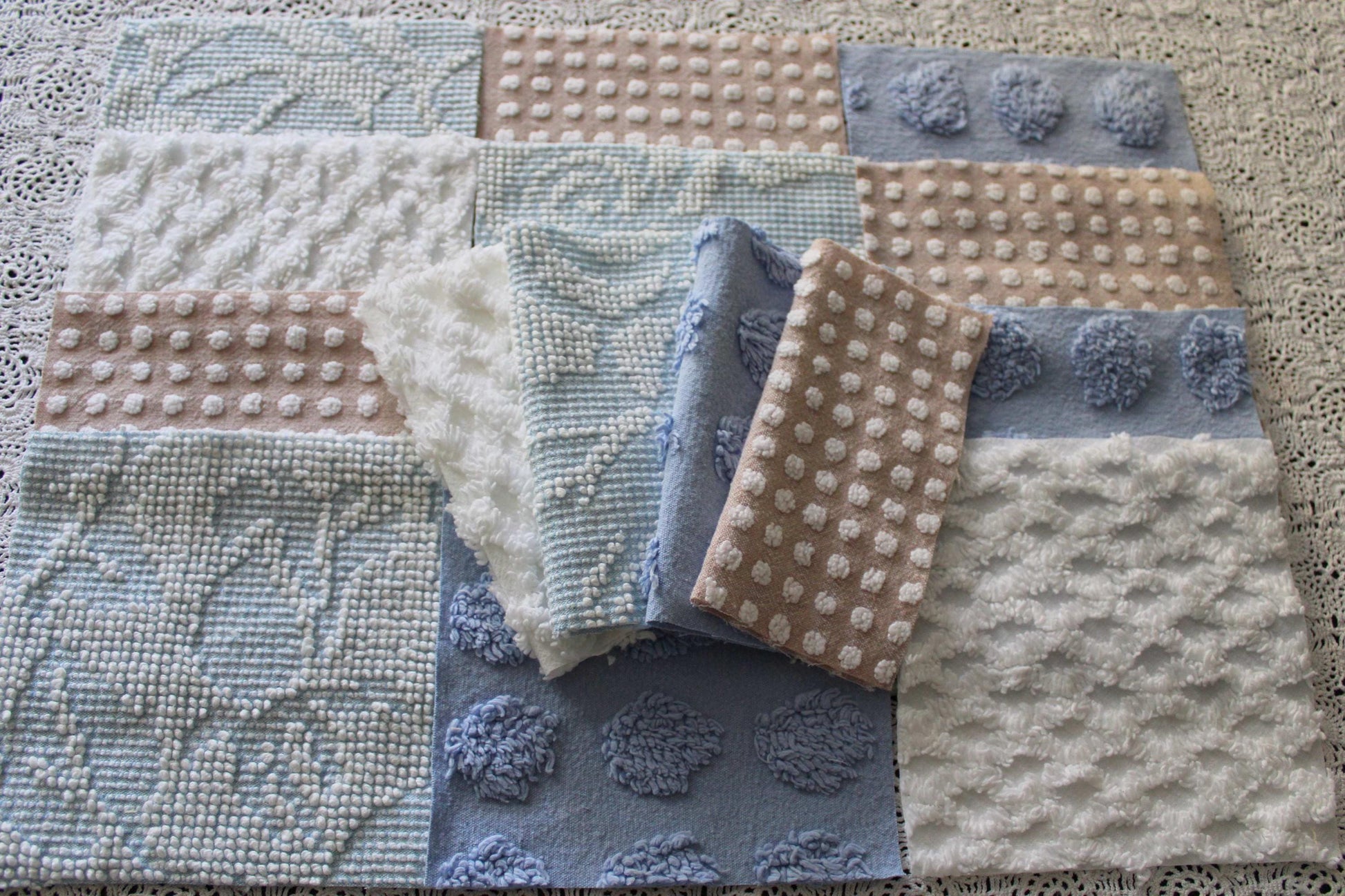 Serene Shores...A peaceful set of chenille fabric squares in blues and whites with a hint of sand to lend a calming energy to any project...all cut from a selection of original vintage chenille bedspreads. A great set to inspire or enhance your creative design.