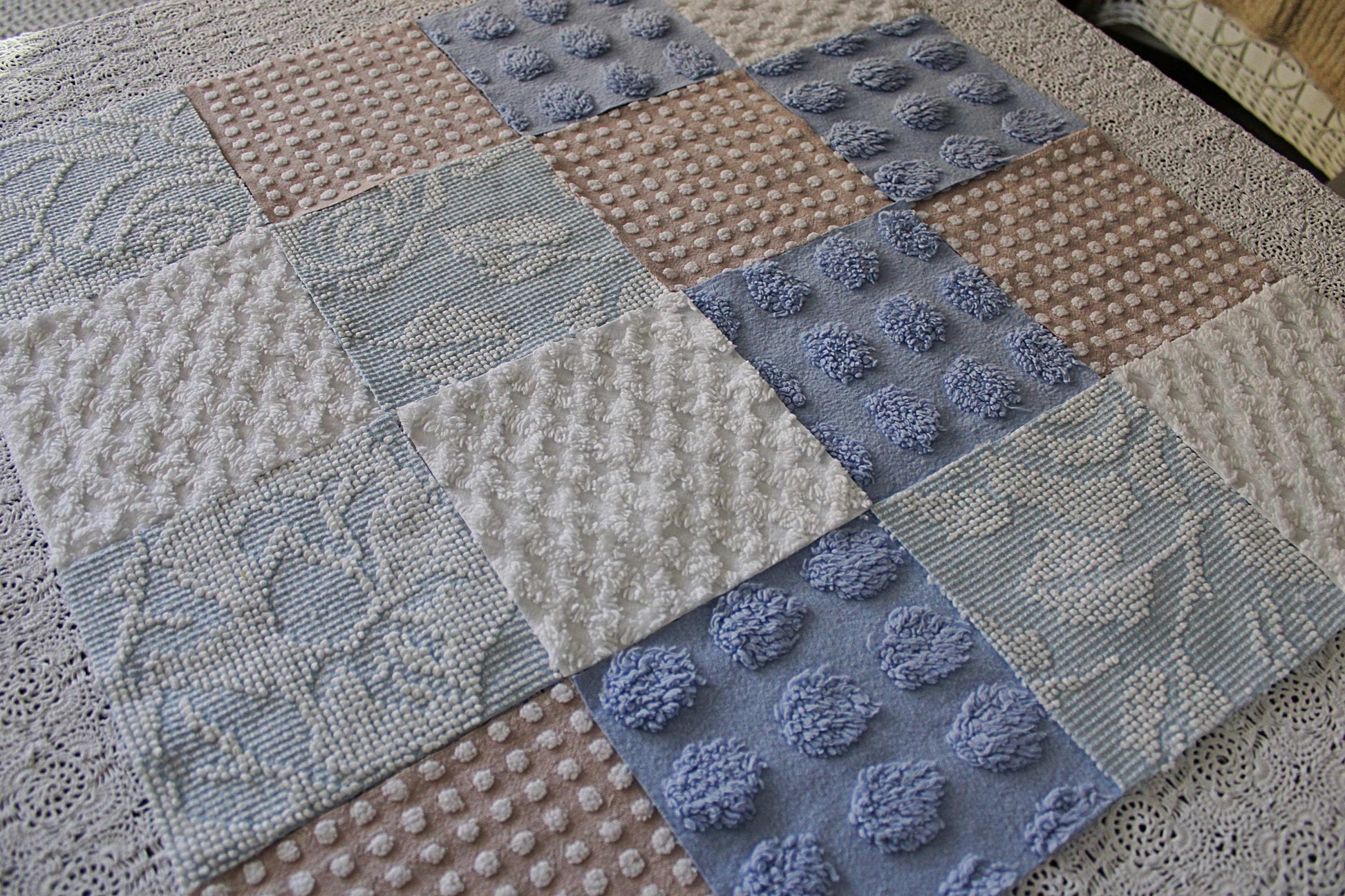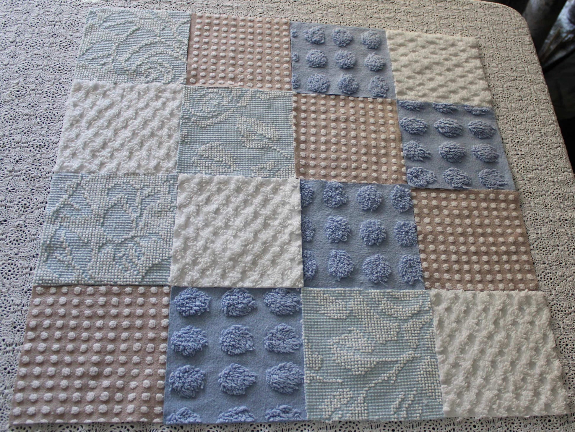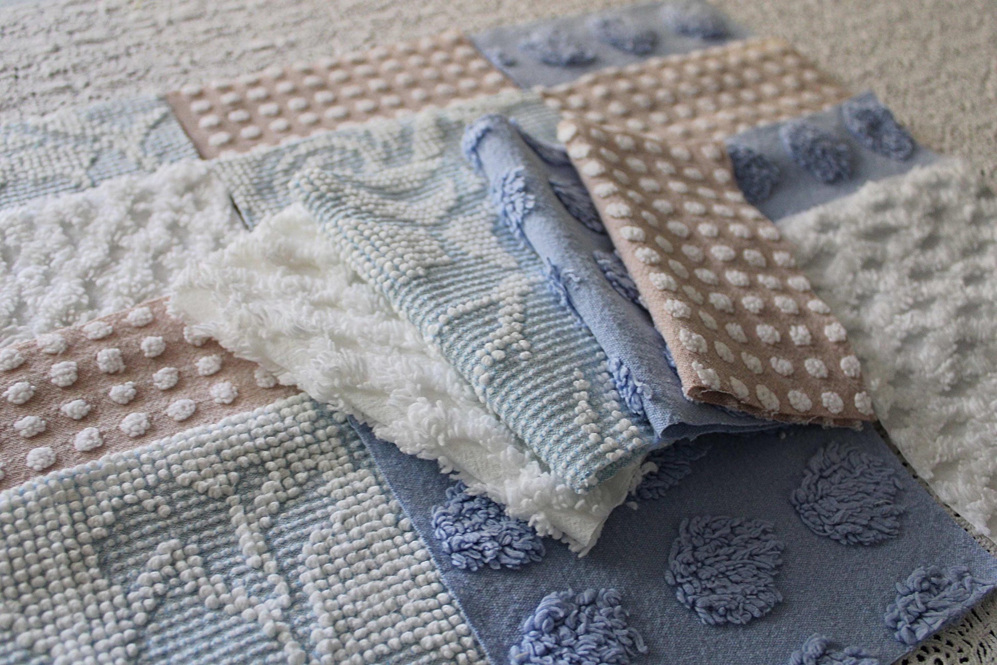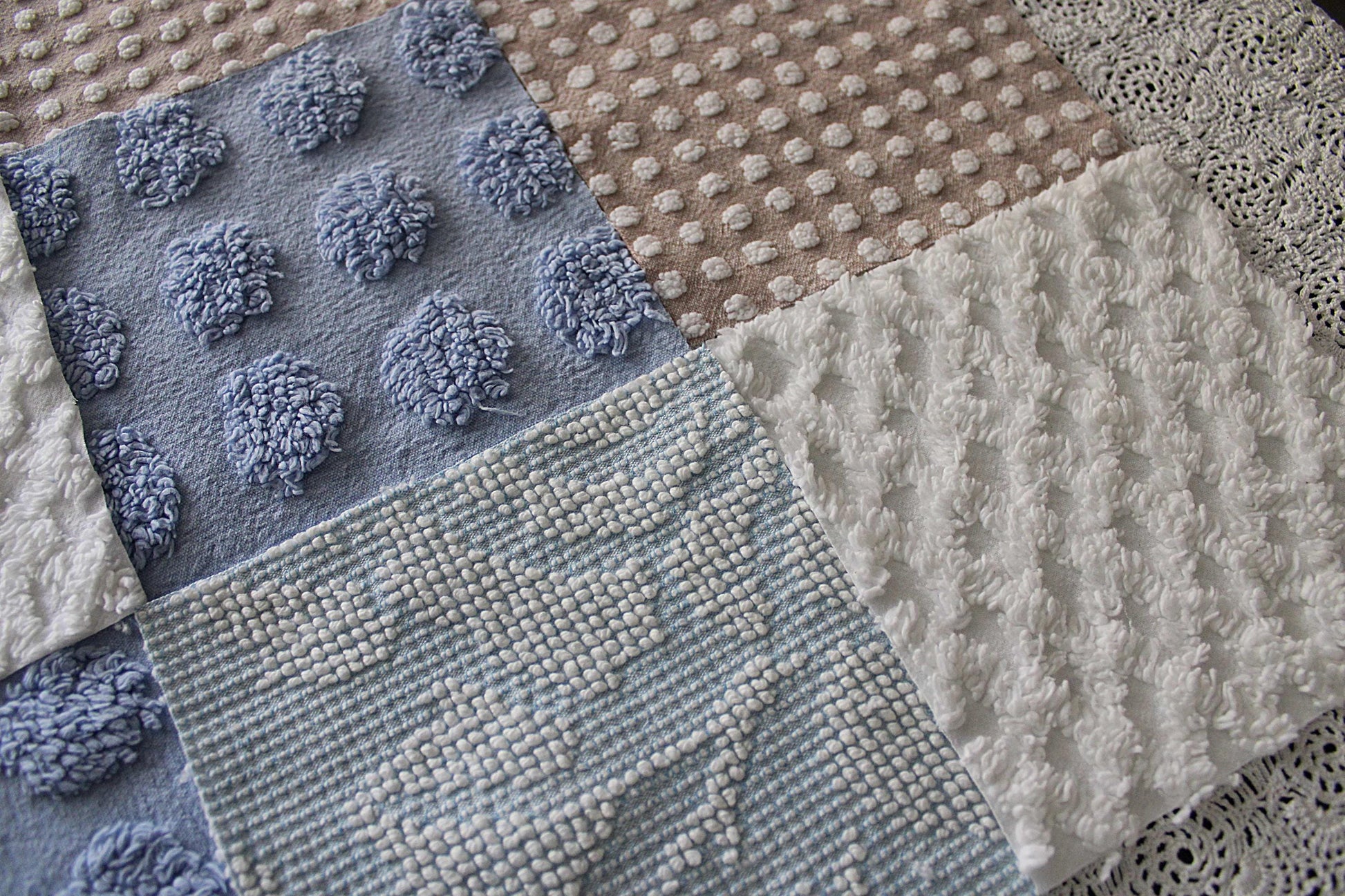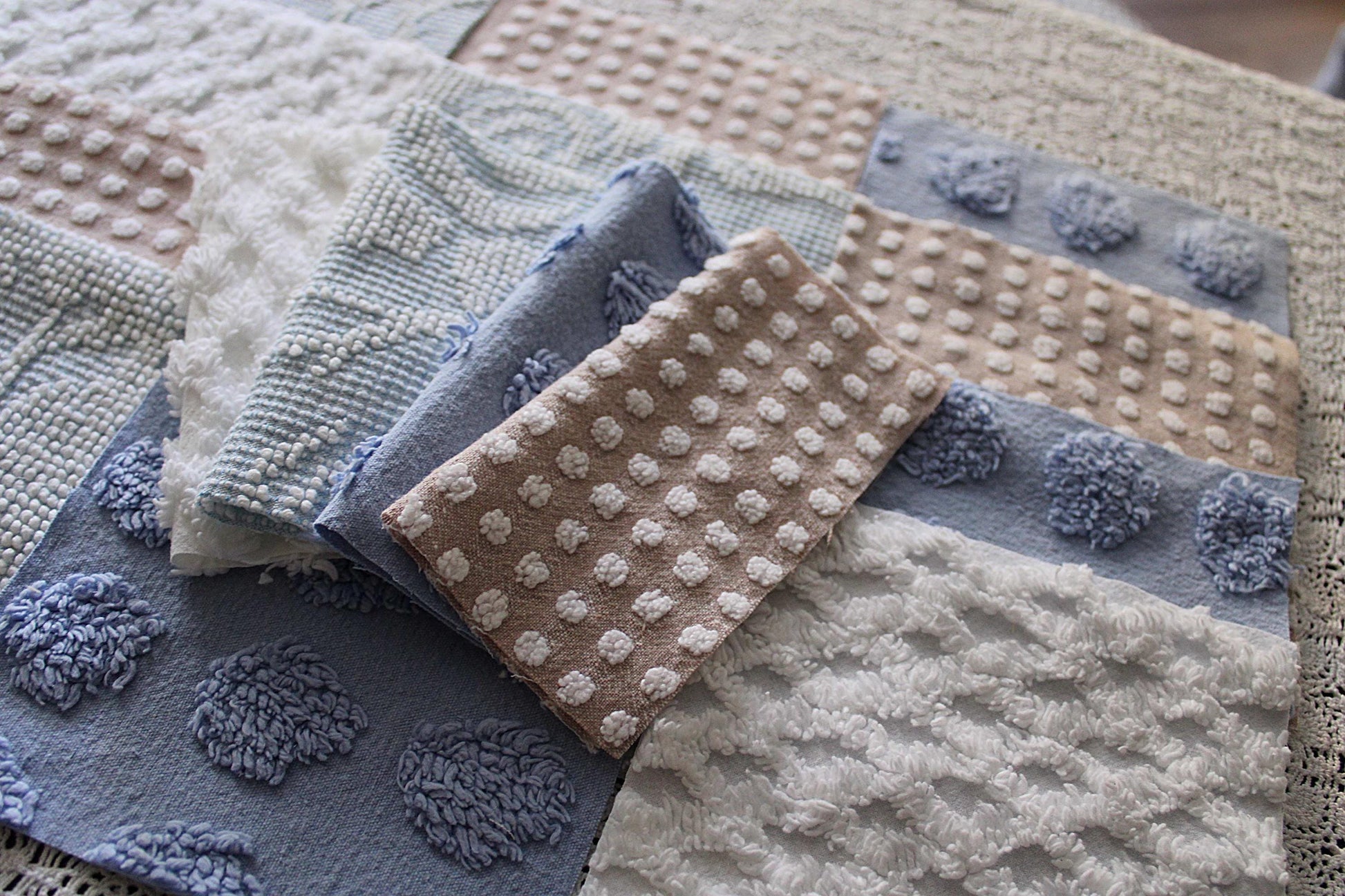 Serene Shores...A peaceful set of chenille fabric squares in blues and whites with a hint of sand to lend a calming energy to any project...all cut from a selection of original vintage chenille bedspreads. A great set to inspire or enhance your creative design.