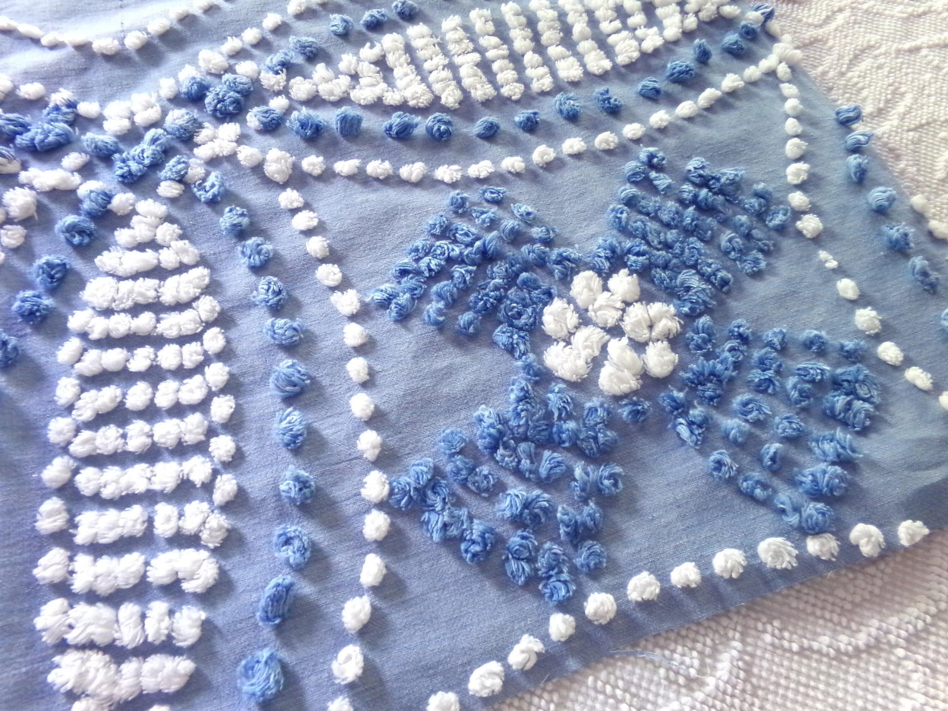 Stunning handiwork is on full display in this gorgeous piece of antique chenille fabric, featuring a prominent blue bow & white handtufted design. Imagine the work someone put into this amazing fabric. Sourced from a late 1930s era all cotton chenille bedspread.Suggested to handle with care as this is *very thin* old cotton - after all, it is nearly 100 years old. Measures approx 36" x 18" inches. Shabby attributes may include natural fabric slubs, a few light pinholes & skipped tufting as to be expected due to the linen's age. 100% lightweight cotton. Ideal incorporated into DIY statement pillows.