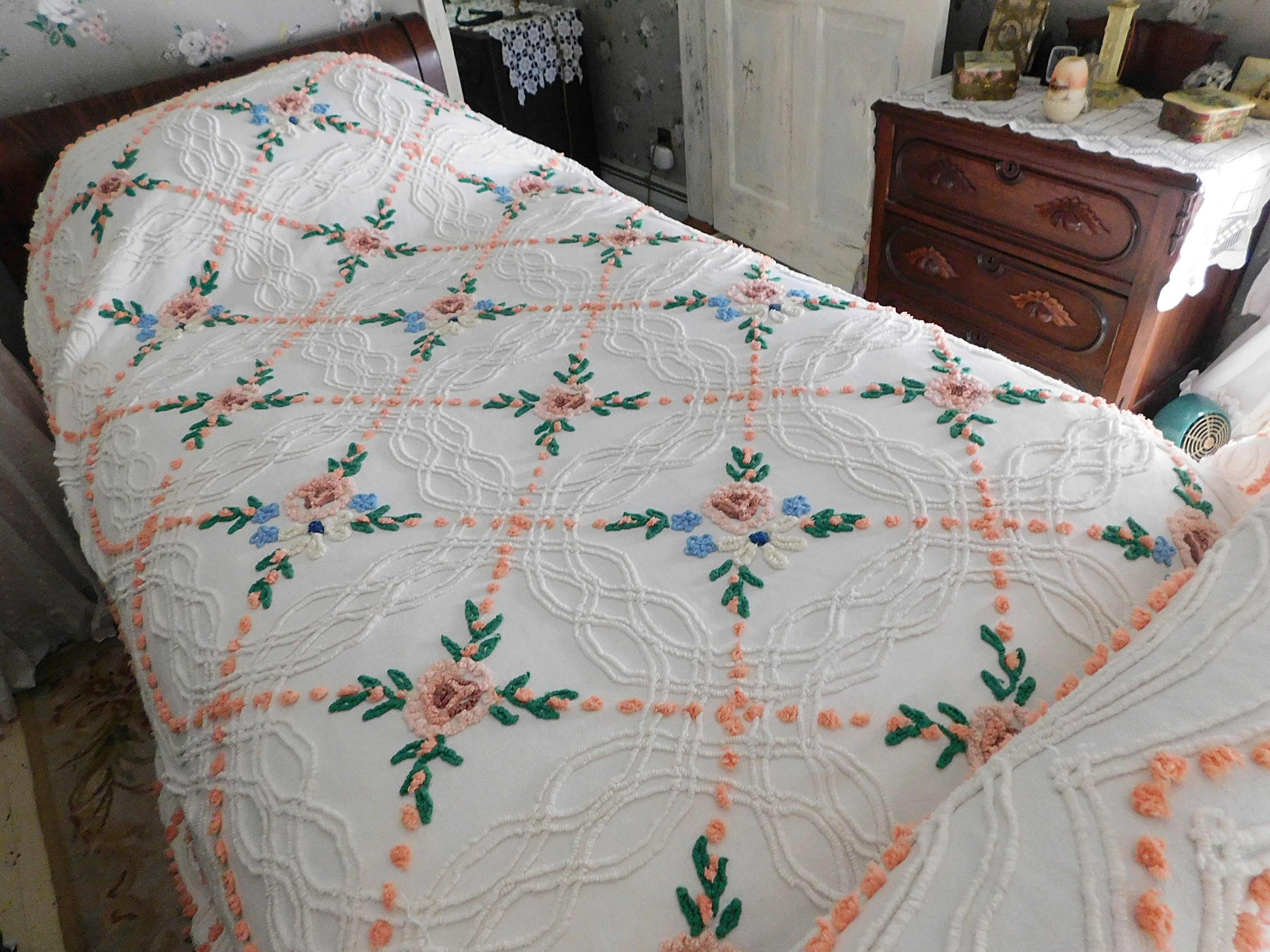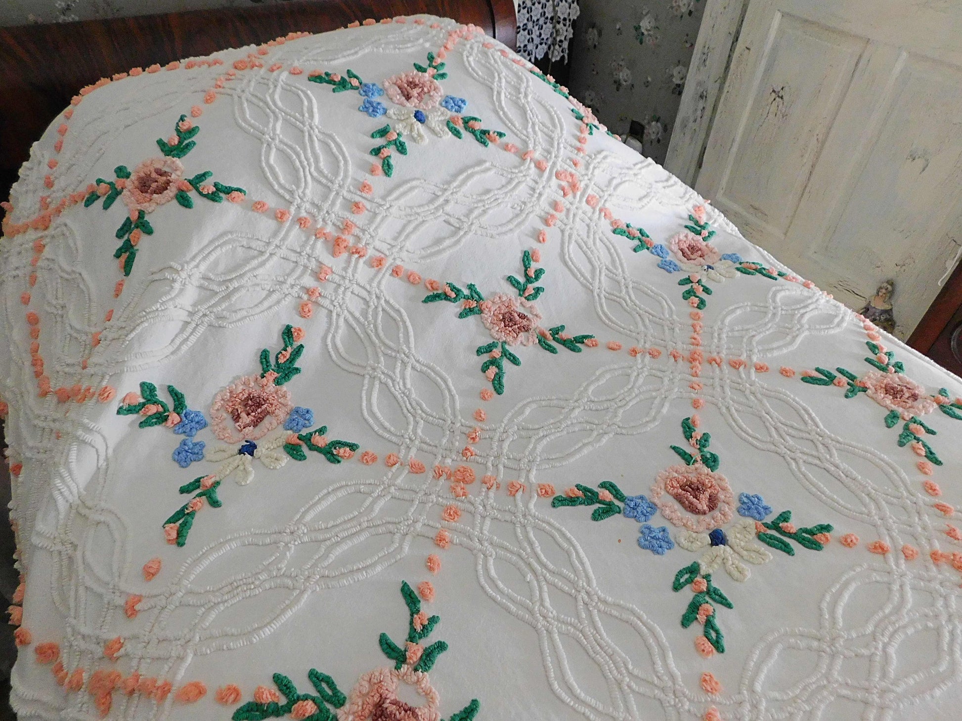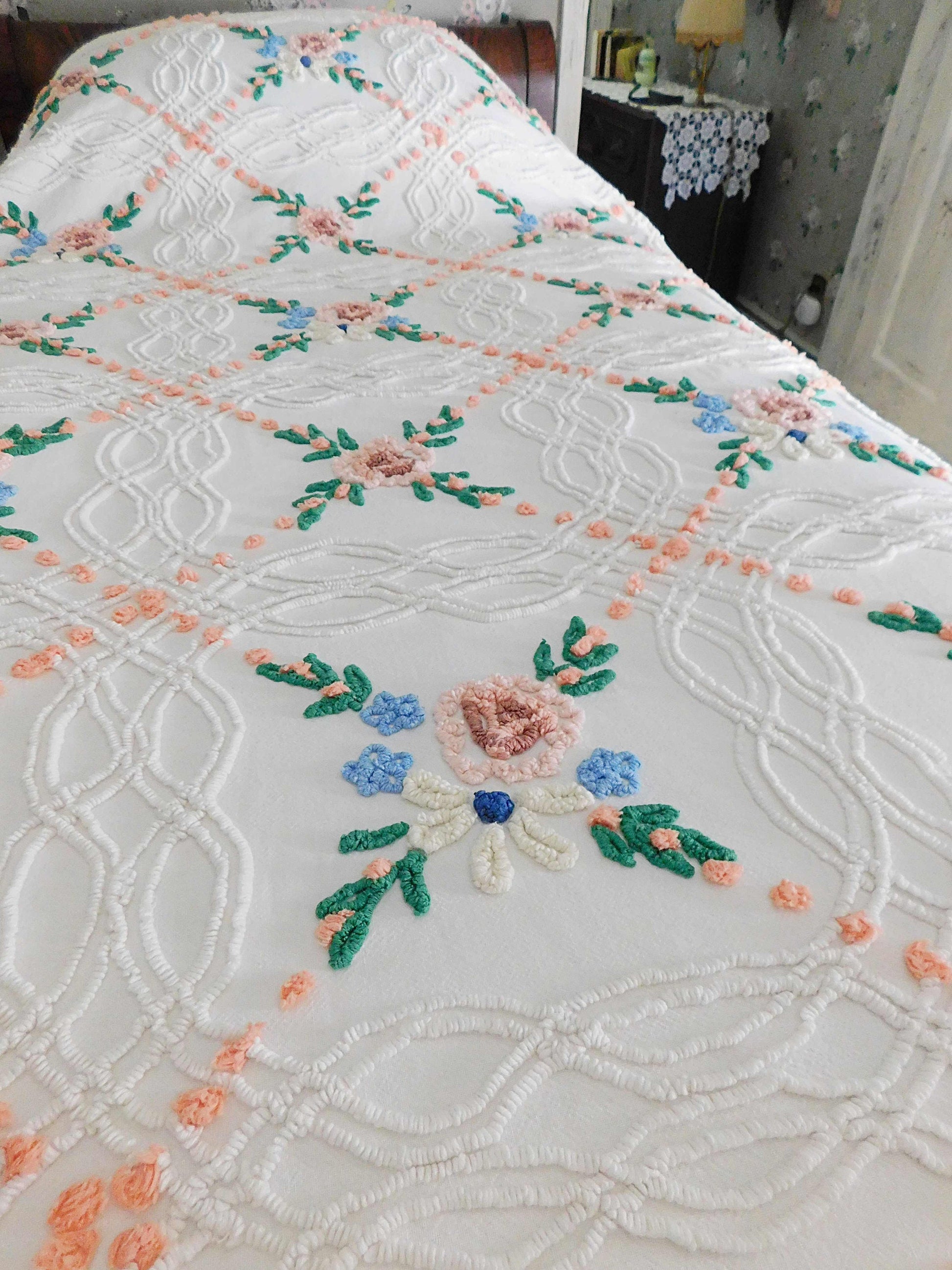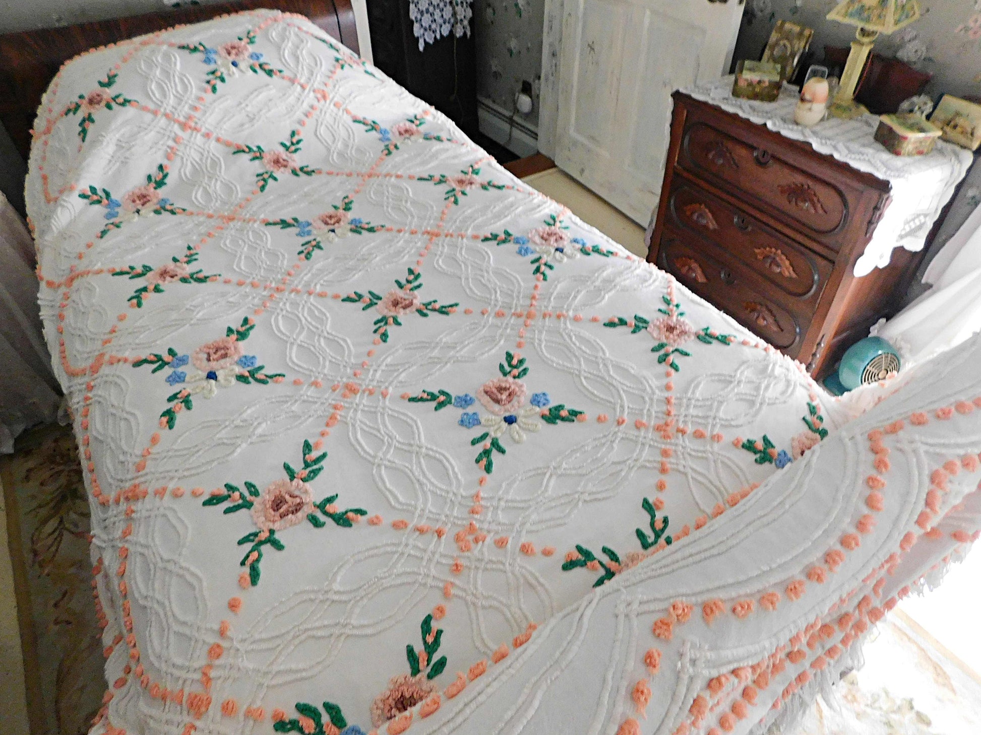 Such a beautiful twin sized chenille bedspread in a very popular pattern by vintage maker, Cabin Crafts. A lovely repeating floral pattern in what resembles daffodils, roses and baby's breath is intersected by pretty peach pops on a warm white background.Hard to find TWIN size makes it the perfect coverlet for summer. Measures around 76"W x 101"L. In good vintage pre-loved condition having a few small scattered marks such as seen final img. Accent fringe along the sides has typical-to-its-age tousling which adds to the shabby charm.
