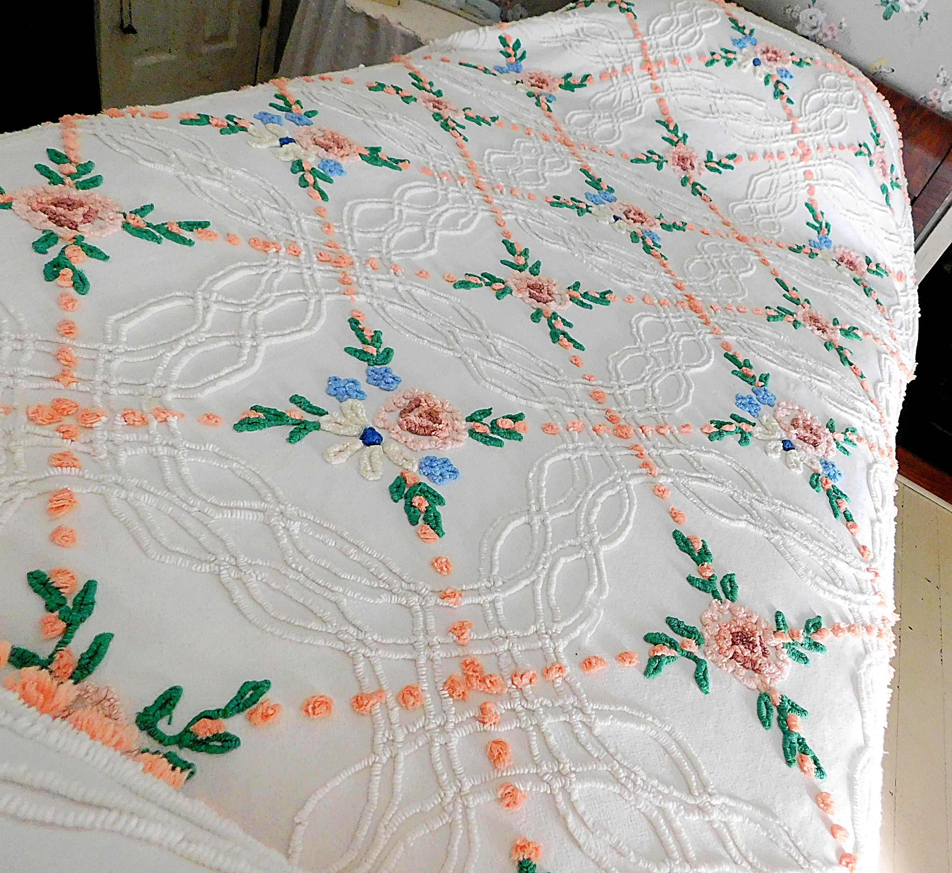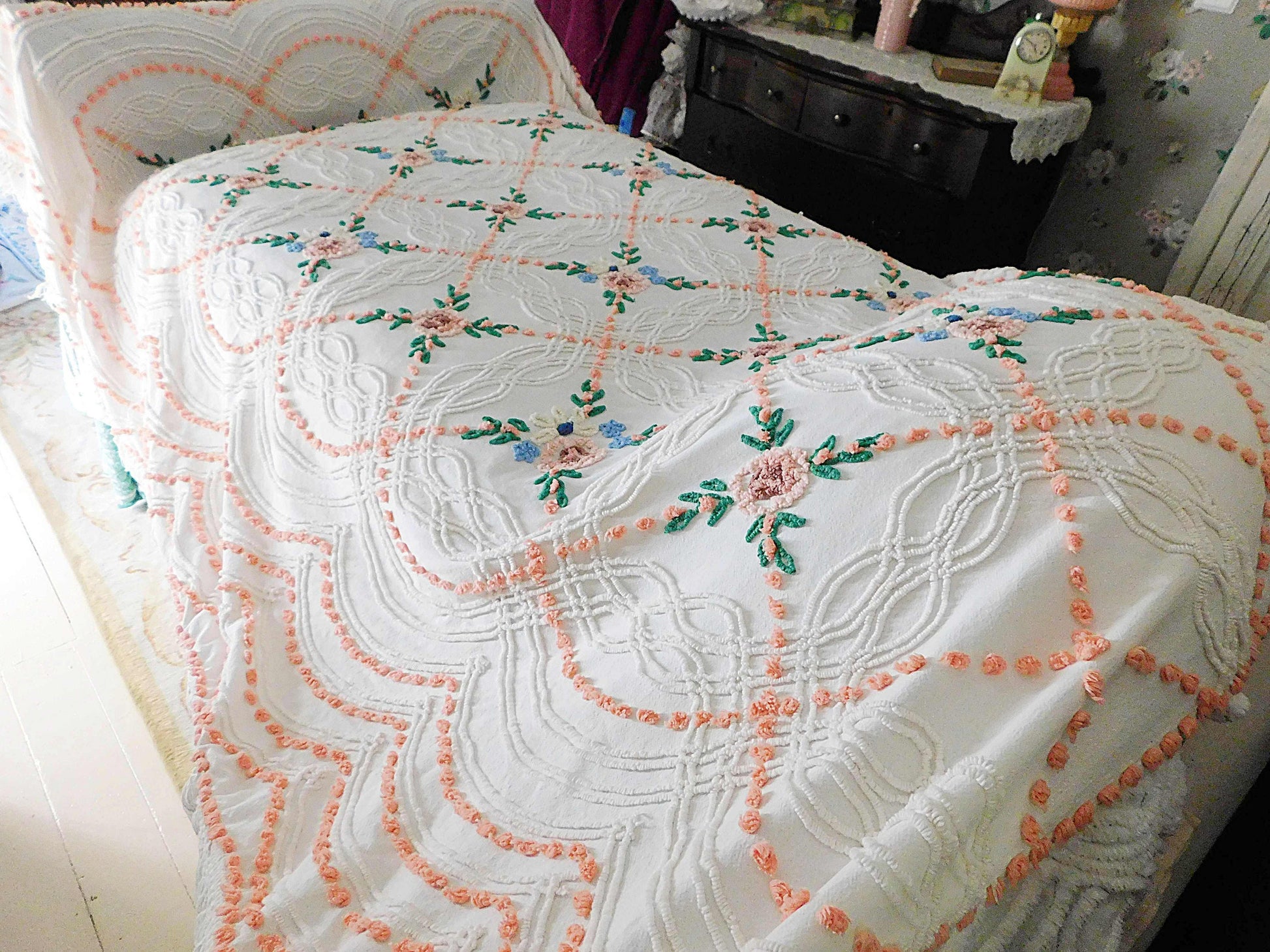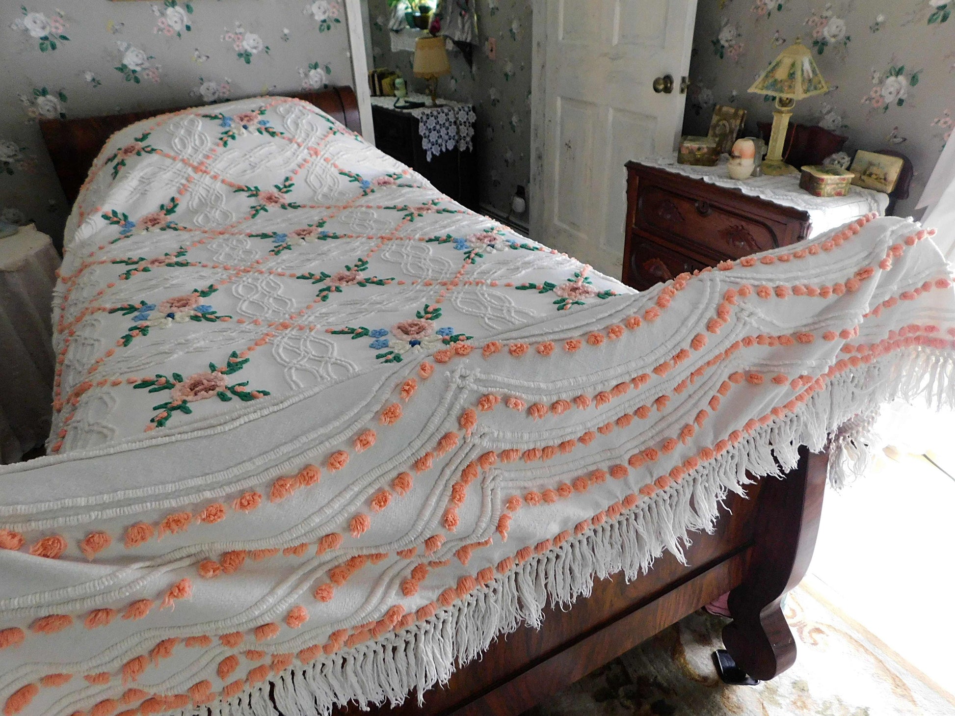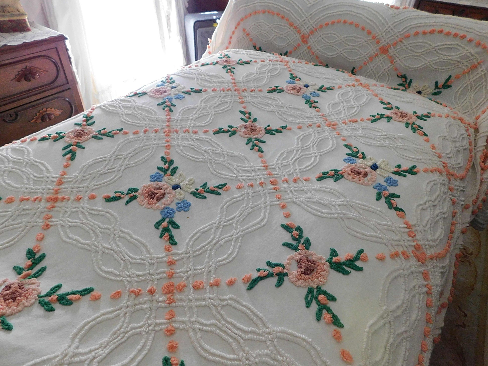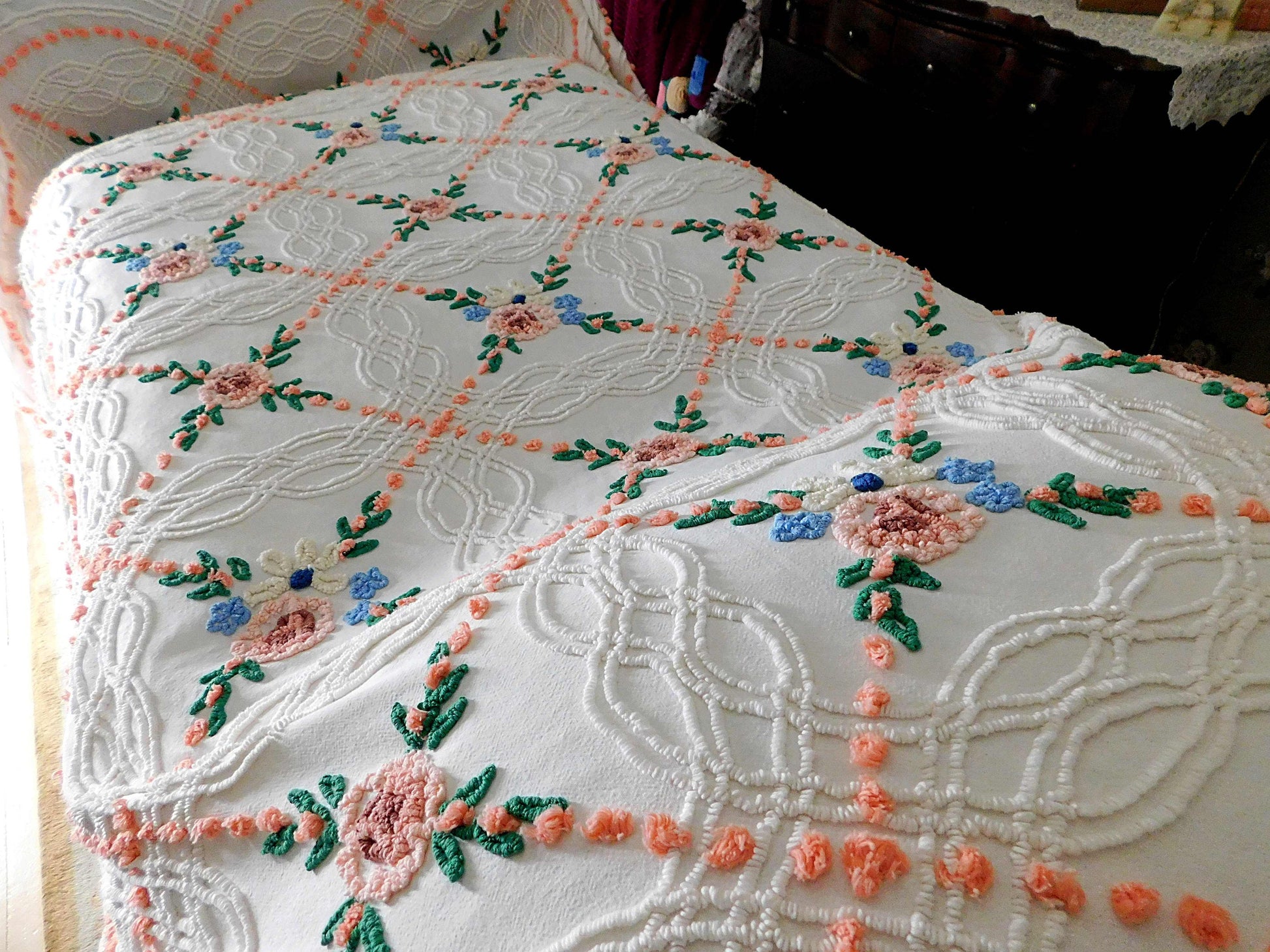 Such a beautiful twin sized chenille bedspread in a very popular pattern by vintage maker, Cabin Crafts. A lovely repeating floral pattern in what resembles daffodils, roses and baby's breath is intersected by pretty peach pops on a warm white background.Hard to find TWIN size makes it the perfect coverlet for summer. Measures around 76"W x 101"L. In good vintage pre-loved condition having a few small scattered marks such as seen final img. Accent fringe along the sides has typical-to-its-age tousling which adds to the shabby charm.