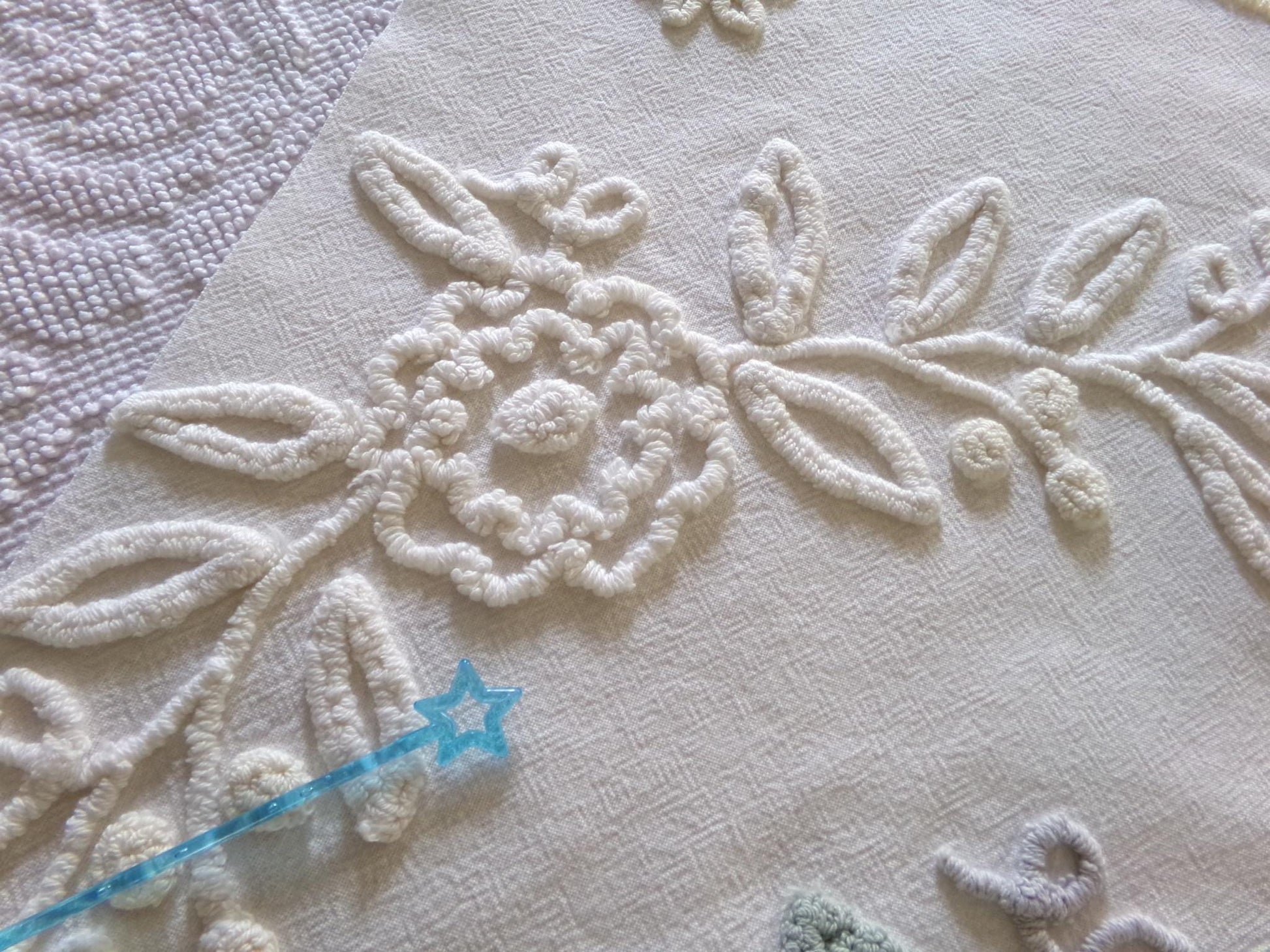 Wouldn't this vintage fabric make a pretty shabby chic style accent pillow? It features a lovely needletuft rose floral design on antique cream - so old fashioned & classic cottage style.Approx 21" x 21" inch piece. Lightweight cotton. There are a few minor marks, small pinholes (final img).