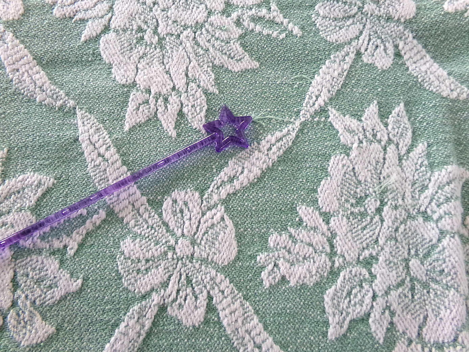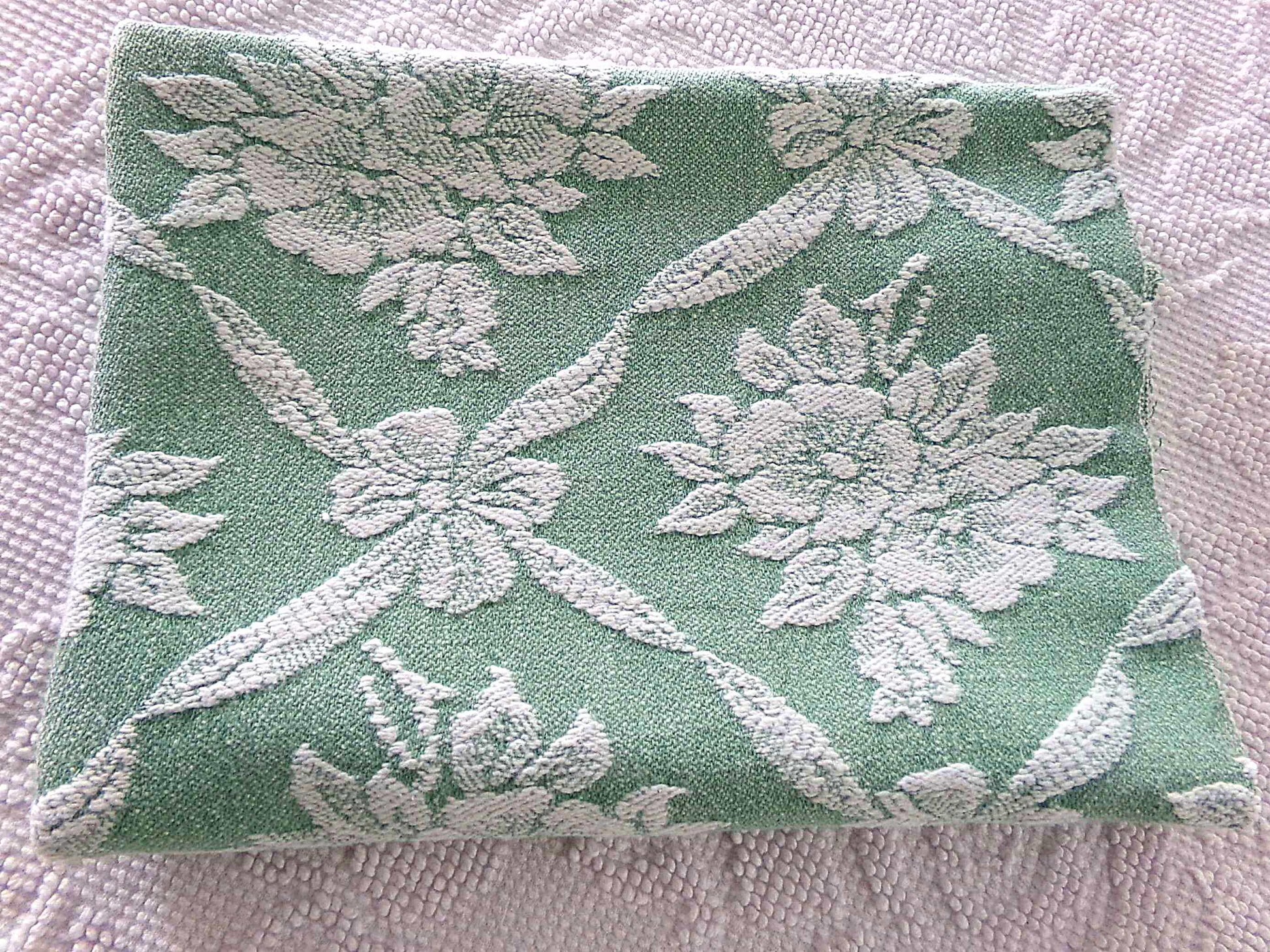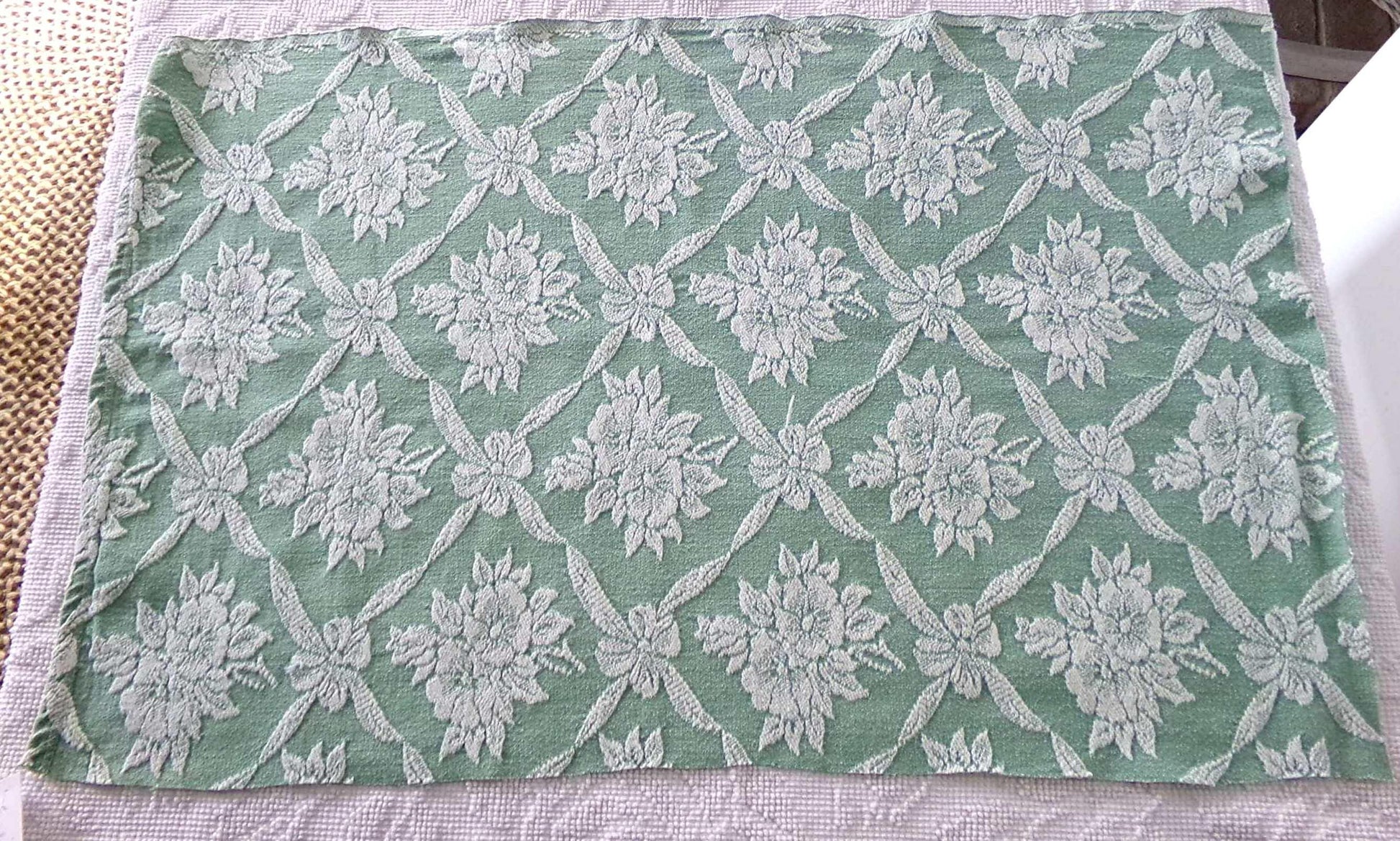 Take your project to the next level of beautiful with this jadeite rose vintage woven fabric piece. This fully reversible design was made by Bates Bedspreads.Approx 20" x 30" inch piece. Lighter weight, easy fabric to work with; an ideal choice to incorporate into DIY pillows, handmade quilts & small bags. Small age spot such as seen final img. Most woven fabric of this era typically shows light pulls to the weave.