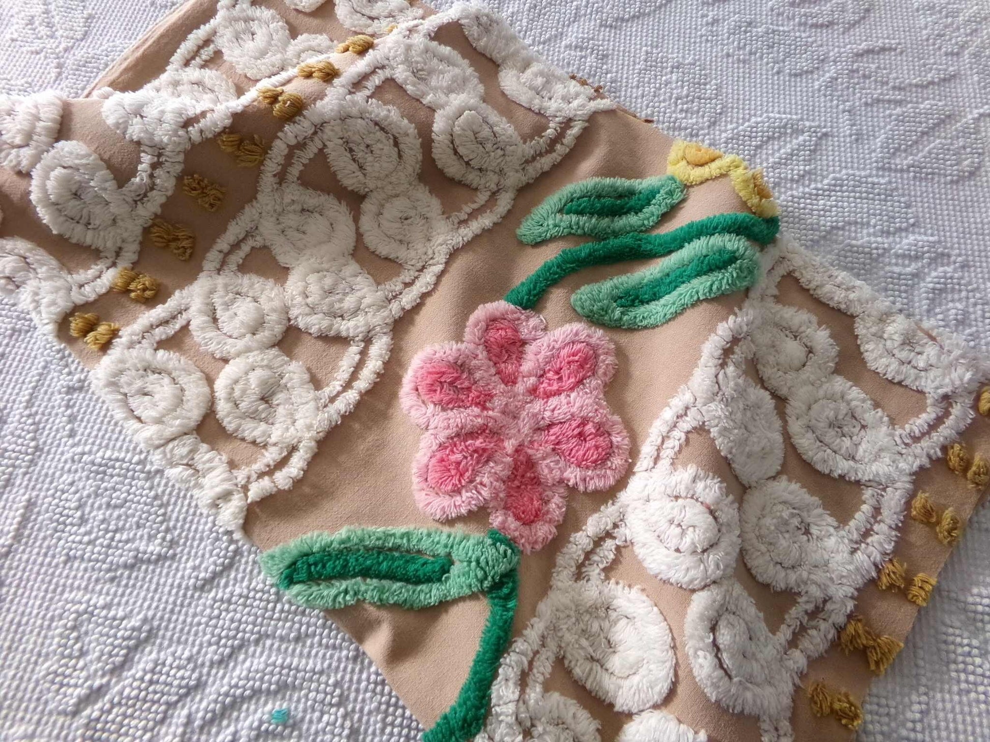 Boho style shabby sweet piece of vintage chenille fabric in a great color that is seldom seen - a honey caramel. Three colorful flowers - 2 pink and 1 yellow - are accented by contrast curlicues.Fabric measures approx 21" x 24" inches. 100% lightweight cotton, circa early 1940s era. Shabby attributes include a few pinholes & skipped tufts, etc. common to the material (see final imgs). Pretty in quilts, DIY pillow designs, or even incorporated into a wall hanging.