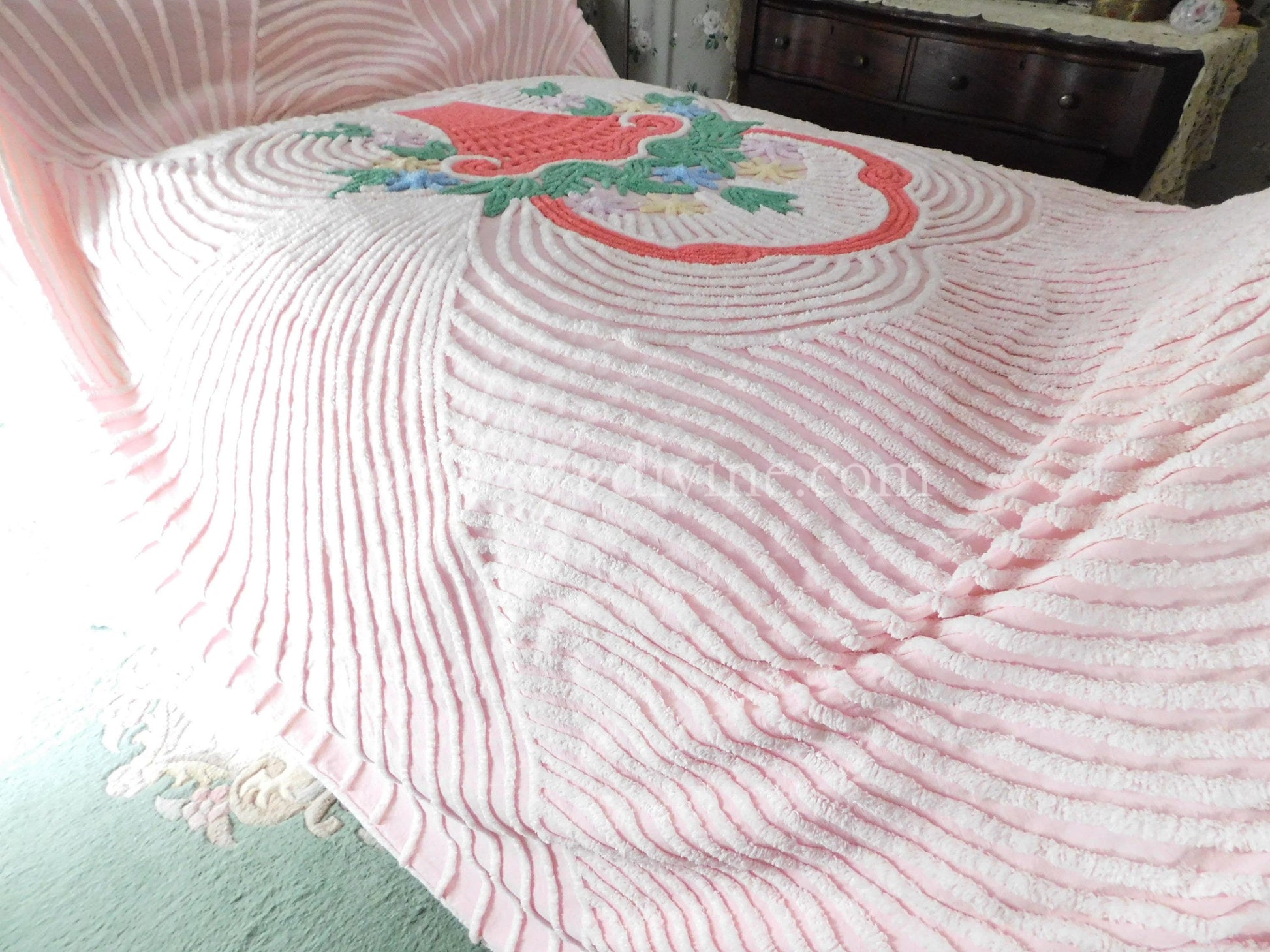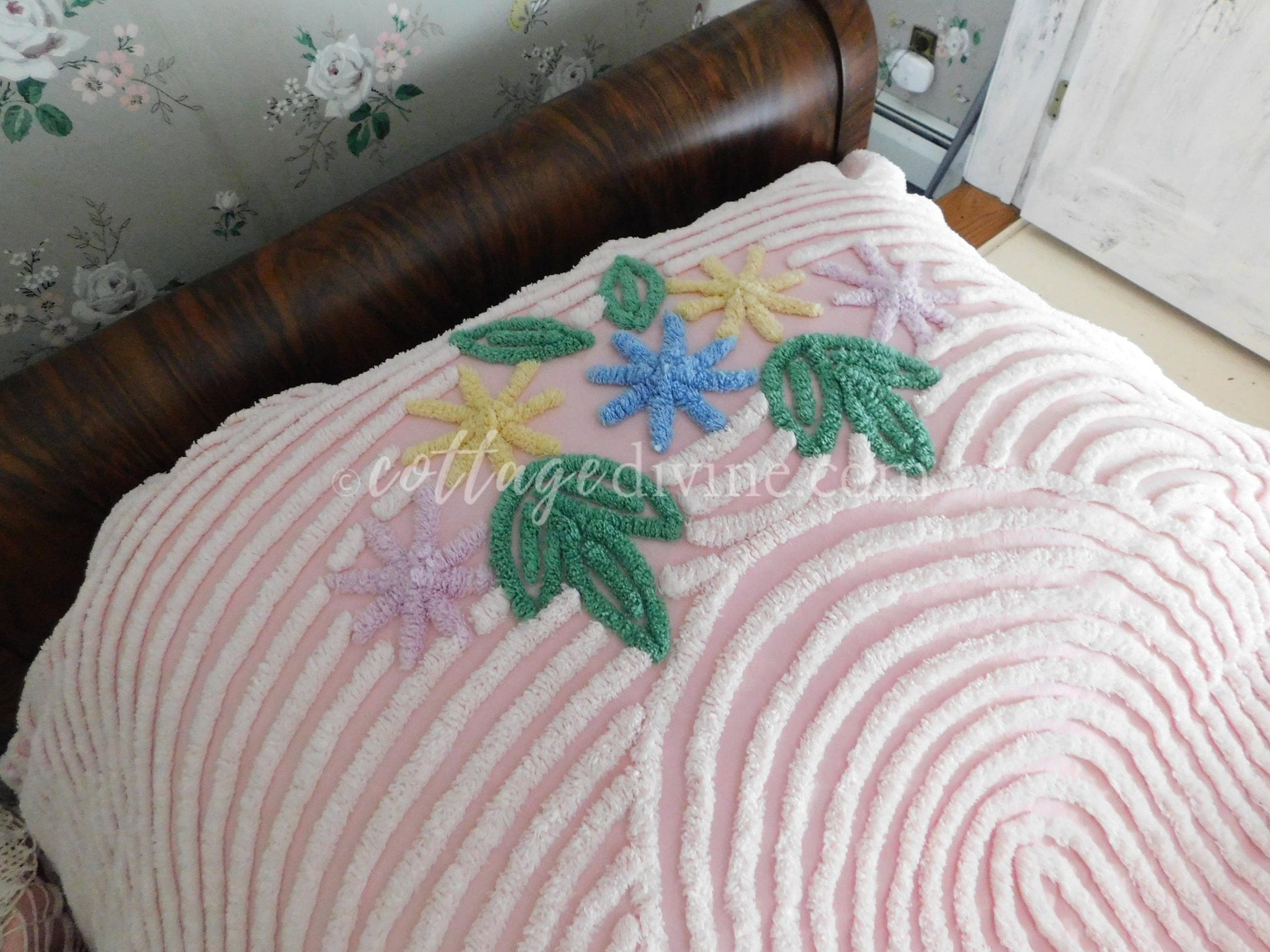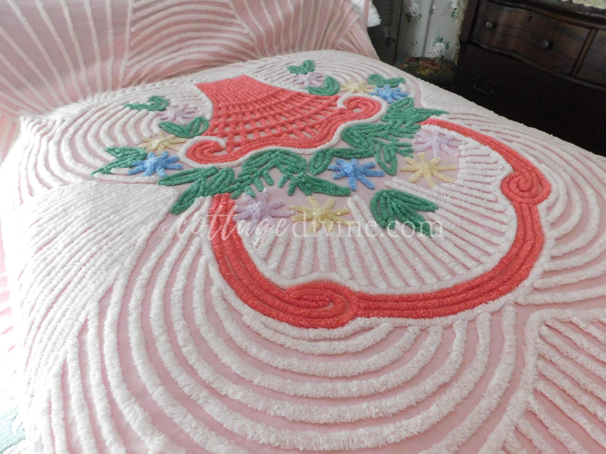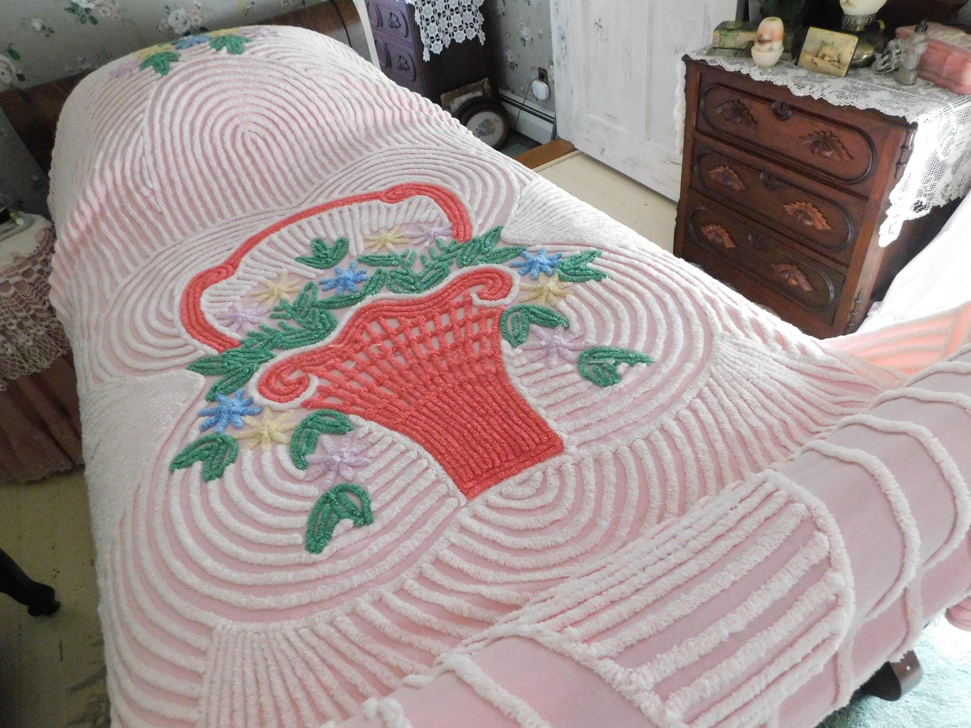 Love this shabby cottage chic full size vintage chenille bedspread - it offers a girly pink background...white swirl tufting...a large flower basket and a lovely little chrysanthemum floral arrangement accenting the pillow tuck area.Full size, approx 88"W x 100"L. Shown on a twin bed; to see this spread staged on a full or queen bed, ask anytime. 100% mid-weight cotton, original from the 1940s. In very good vintage condition; there are a few pinholes which add to the shabby chic charm.