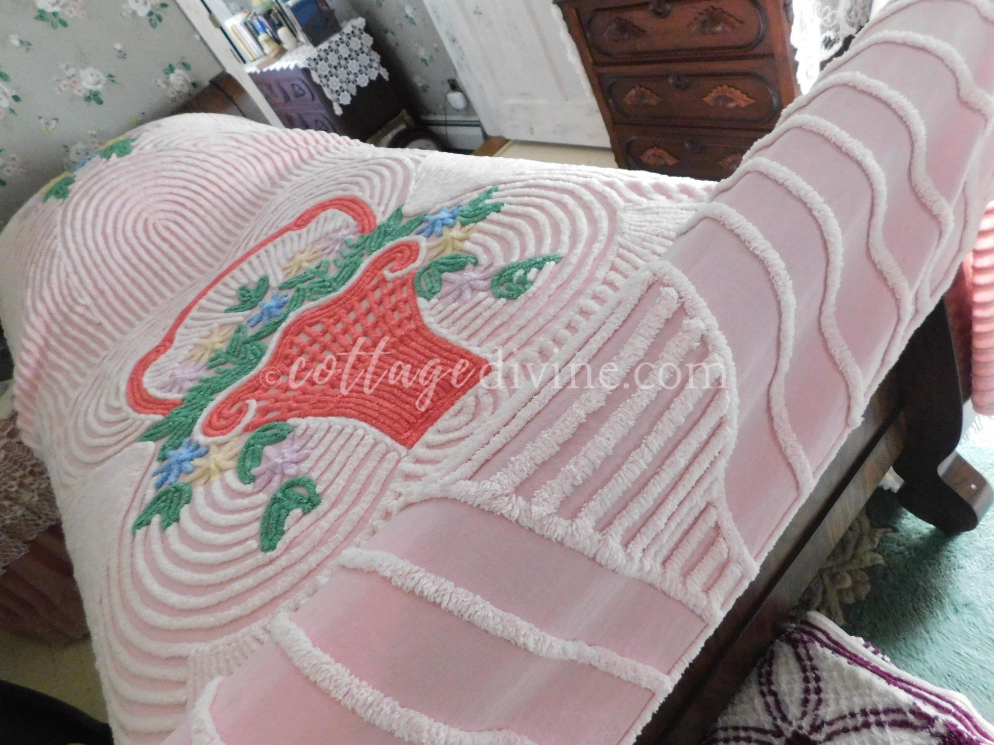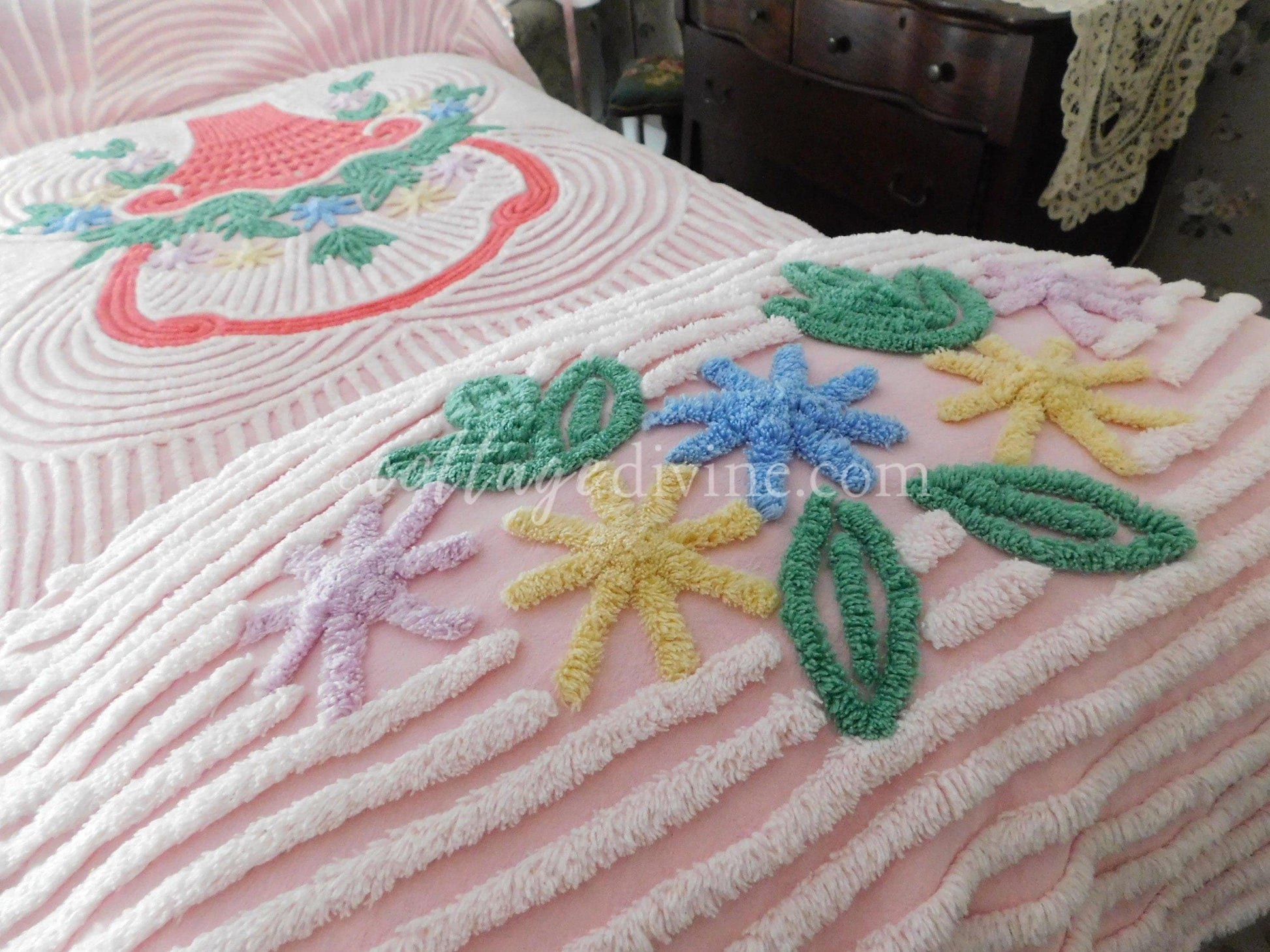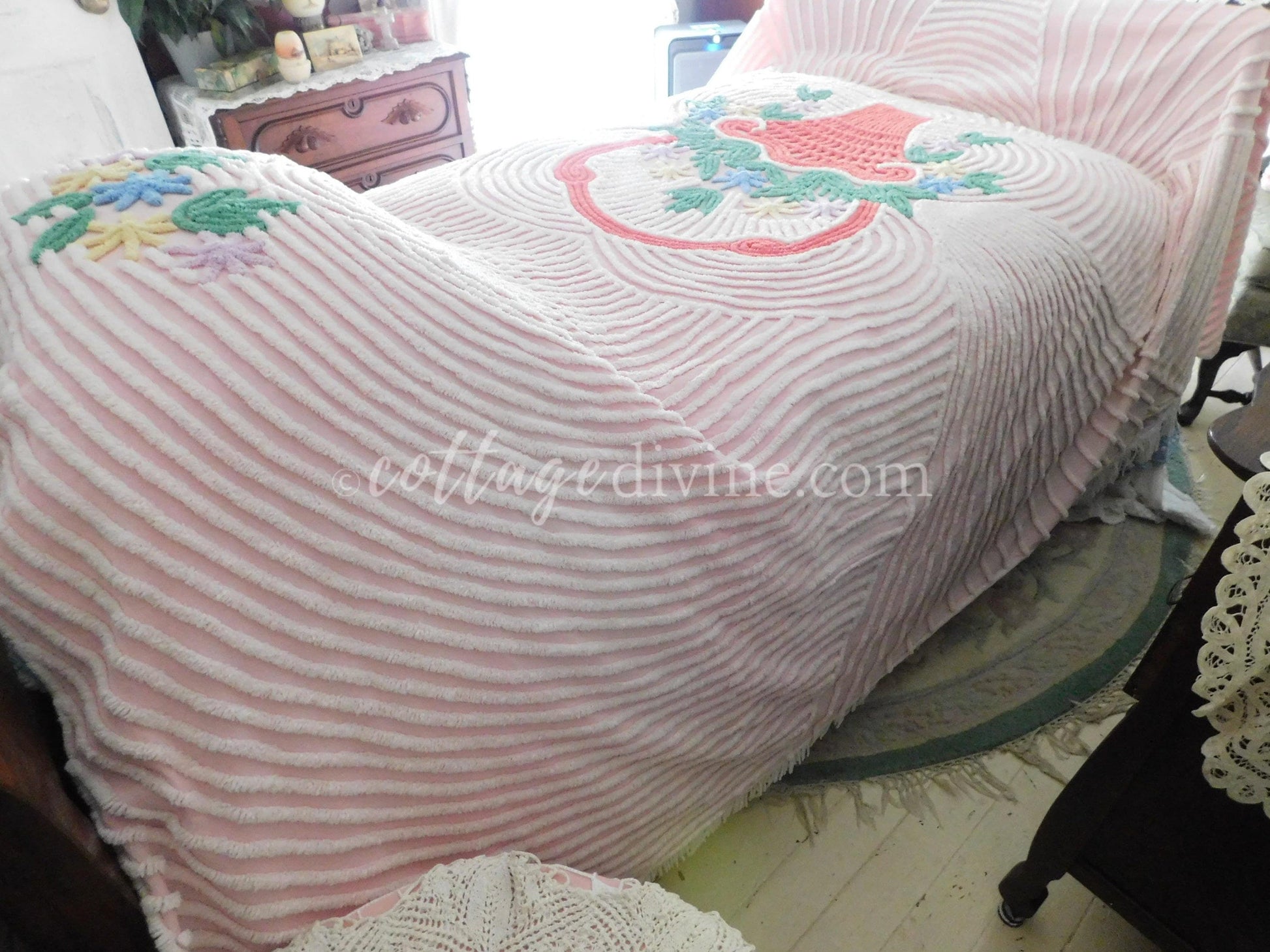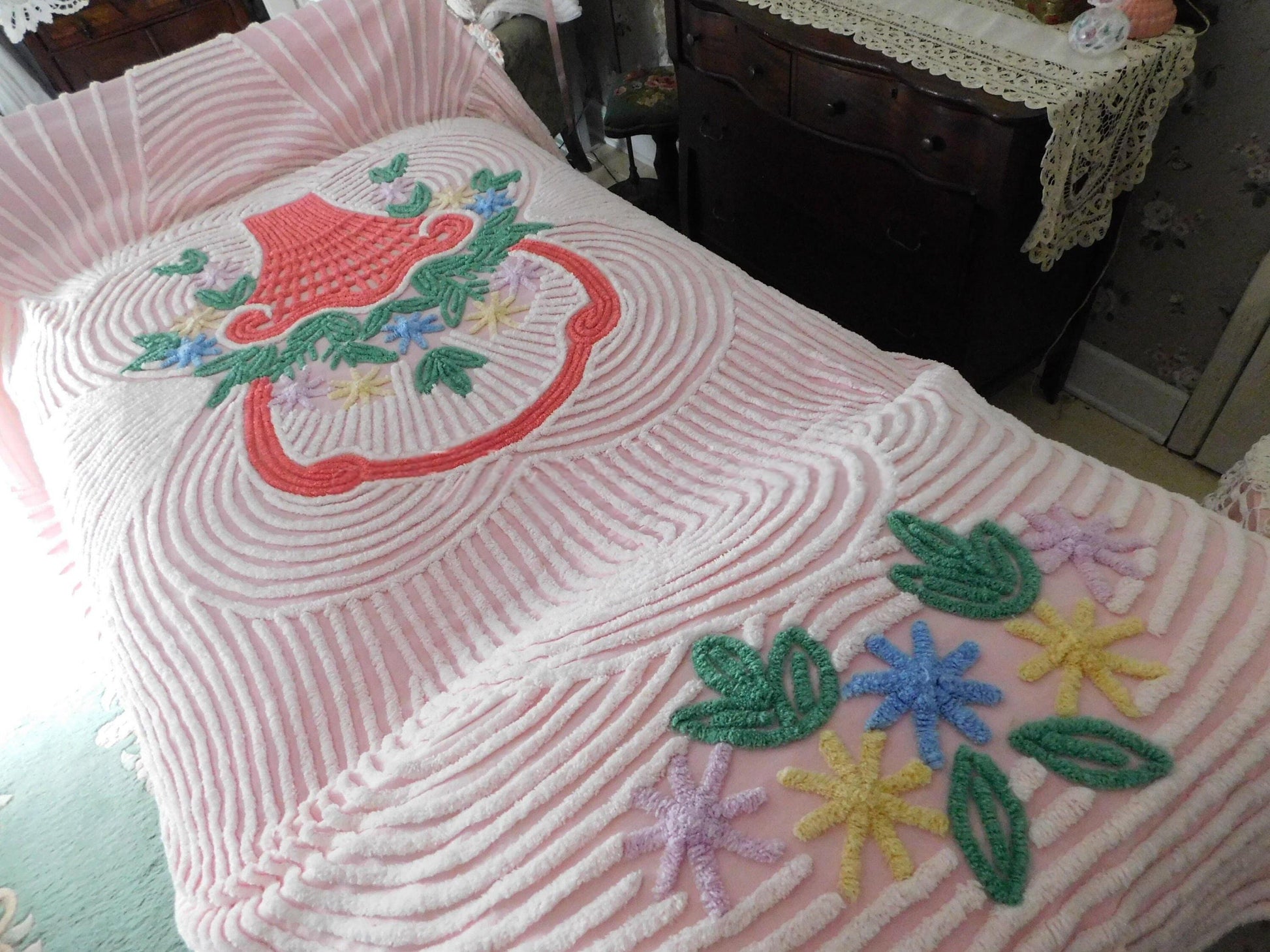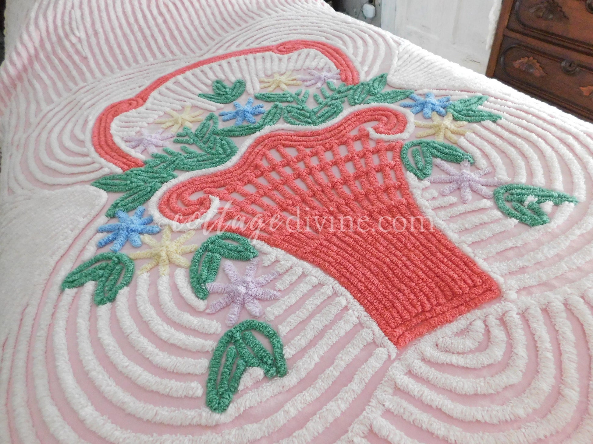 Love this shabby cottage chic full size vintage chenille bedspread - it offers a girly pink background...white swirl tufting...a large flower basket and a lovely little chrysanthemum floral arrangement accenting the pillow tuck area.Full size, approx 88"W x 100"L. Shown on a twin bed; to see this spread staged on a full or queen bed, ask anytime. 100% mid-weight cotton, original from the 1940s. In very good vintage condition; there are a few pinholes which add to the shabby chic charm.