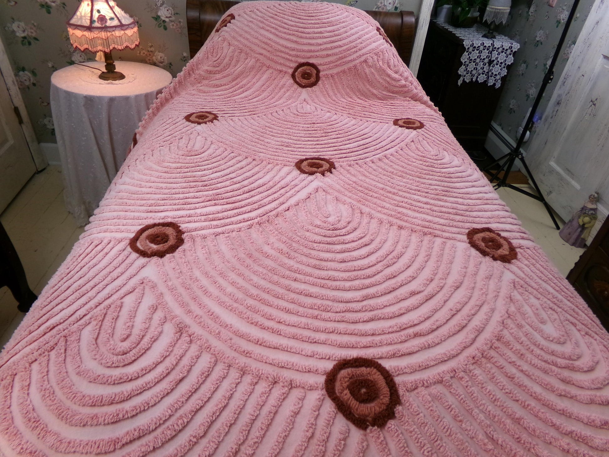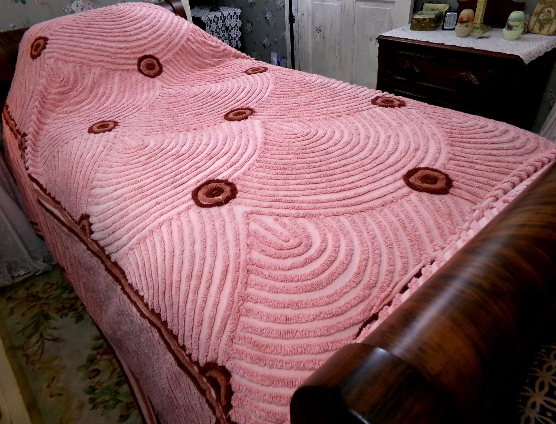 Shabby Chic Vintage Full Size Chenille Bedspread - Mauve Pink w/ Swag Art Deco DesignAmazing vintage chenille bedspread featuring a dramatic art deco style design in deep swag scallops with little round donut shape accents in a deep maroon. This eye catching bedspread exudes Old Hollywood style glamour.