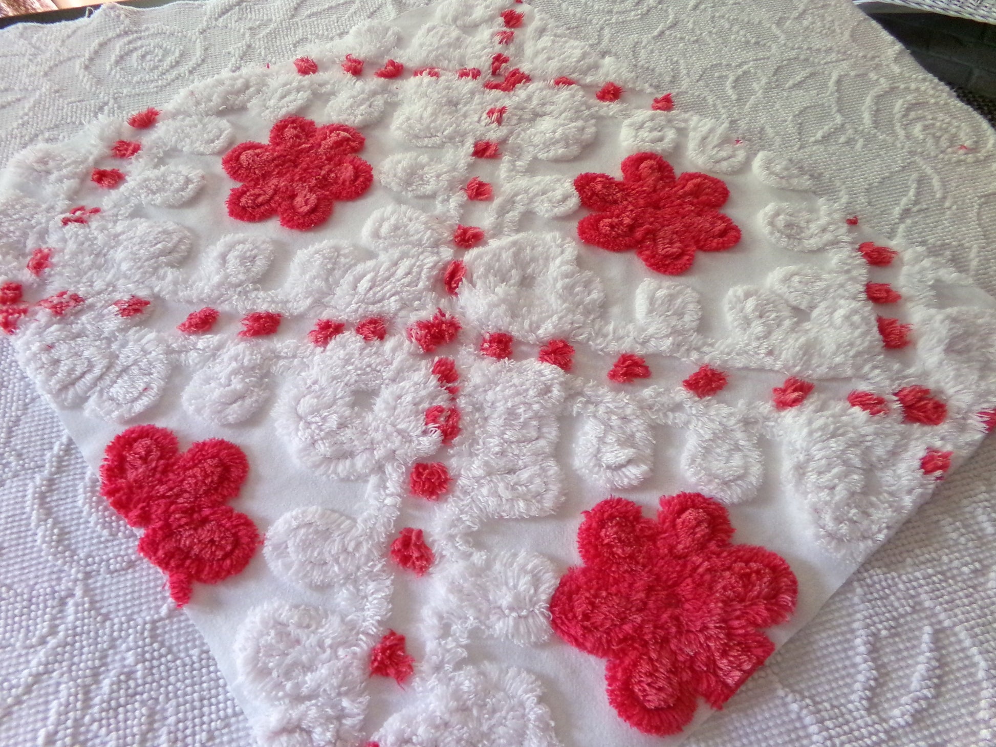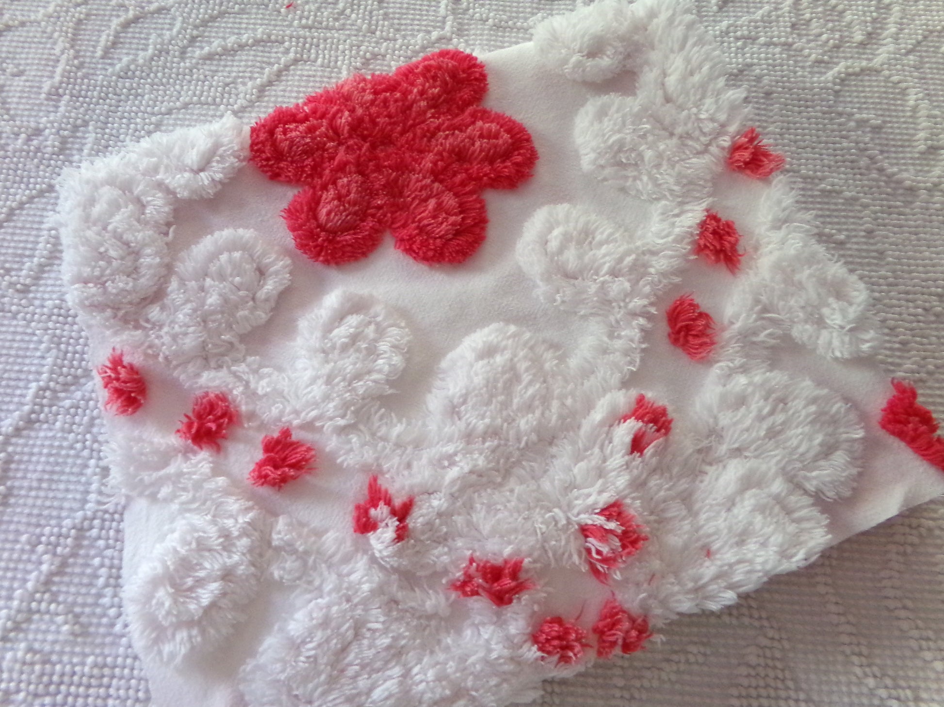 Adorable red flowers are surrounded by swirls & twirls of frosty white chenille tufting on this fun vintage chenille fabric piece.Measures about 18" x 21" inches. 100% cotton with fluffy chenille tufting. Common to the colorway, you may notice some frosting or fade to the red (see final img). Original vintage fabric from the 1950s era.