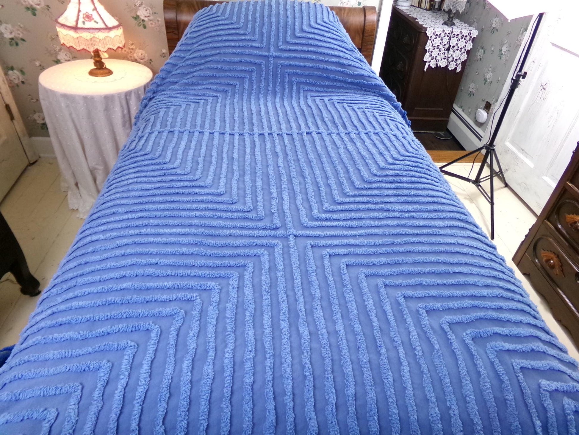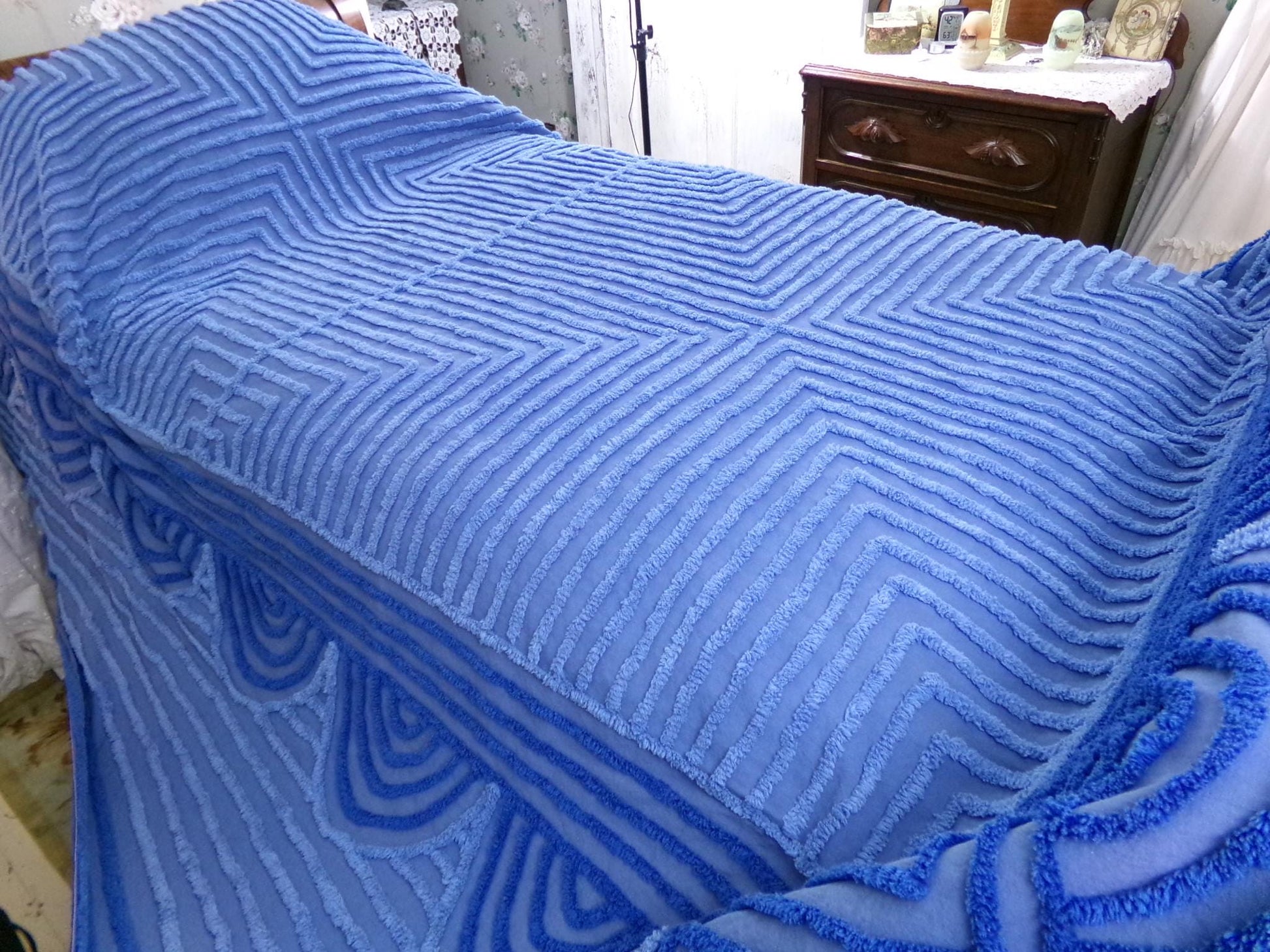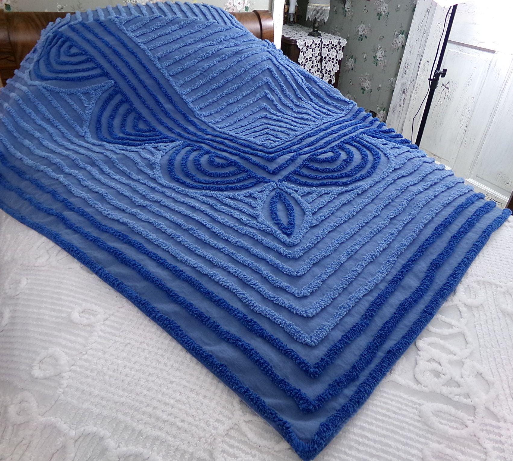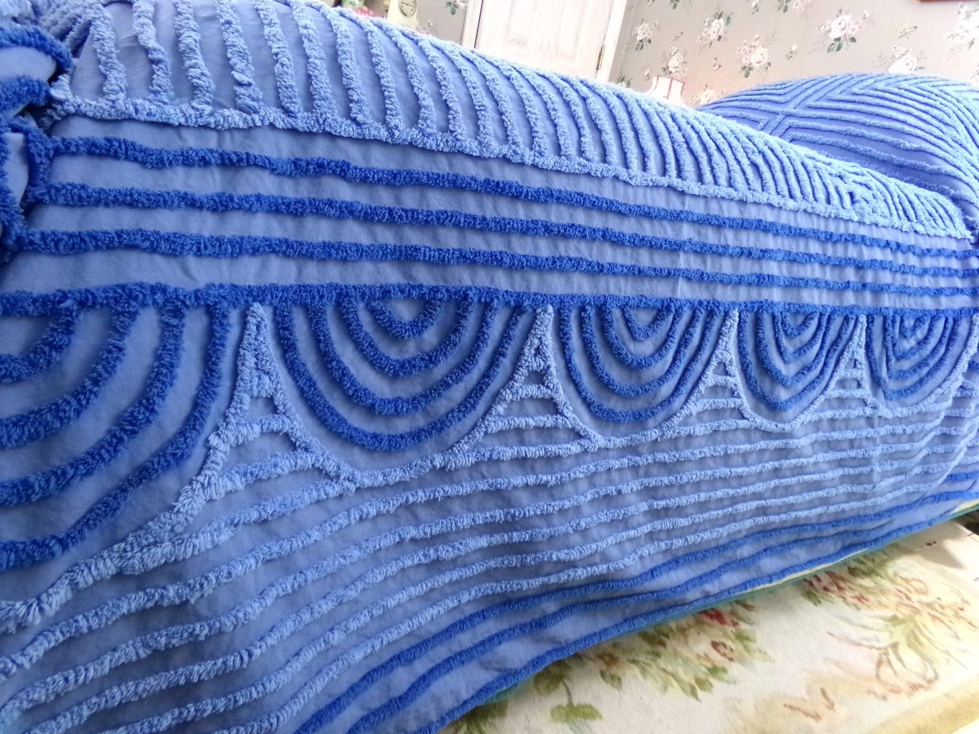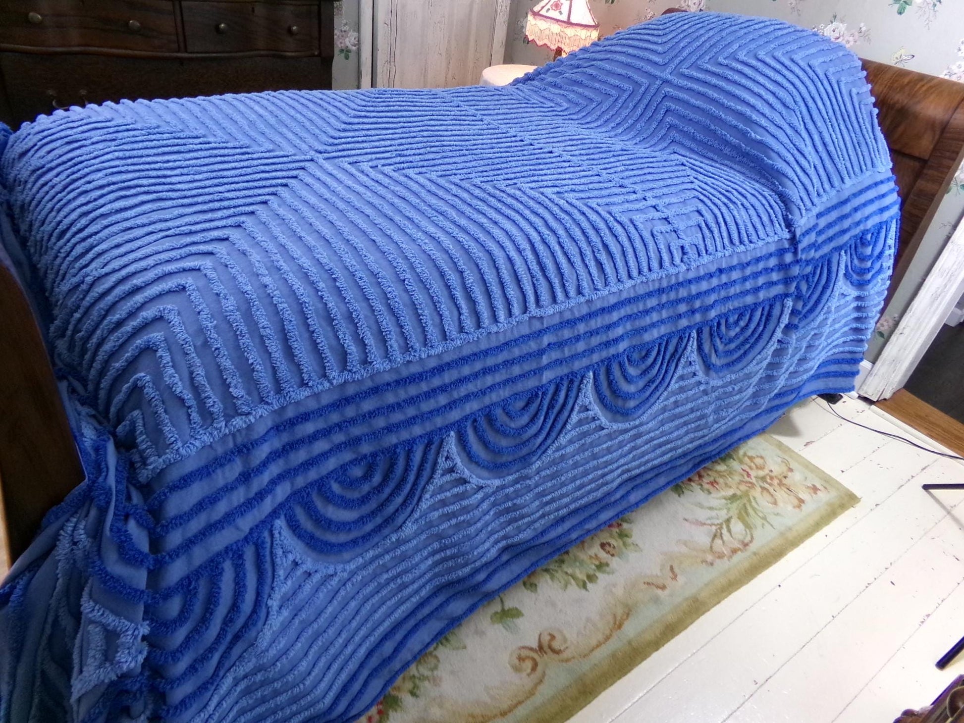 The shades of blue on this vintage chenille bedspread are so beautiful and soothing. It features an eye-catching geometric design with contrast swag scallops along the drop sides in a deep dreamy coordinating blue.The wonderful geometric design and gorgeous color give this bedspread a versatility, making it an effortless piece to incorporate in home decor themes from vintage to modern.