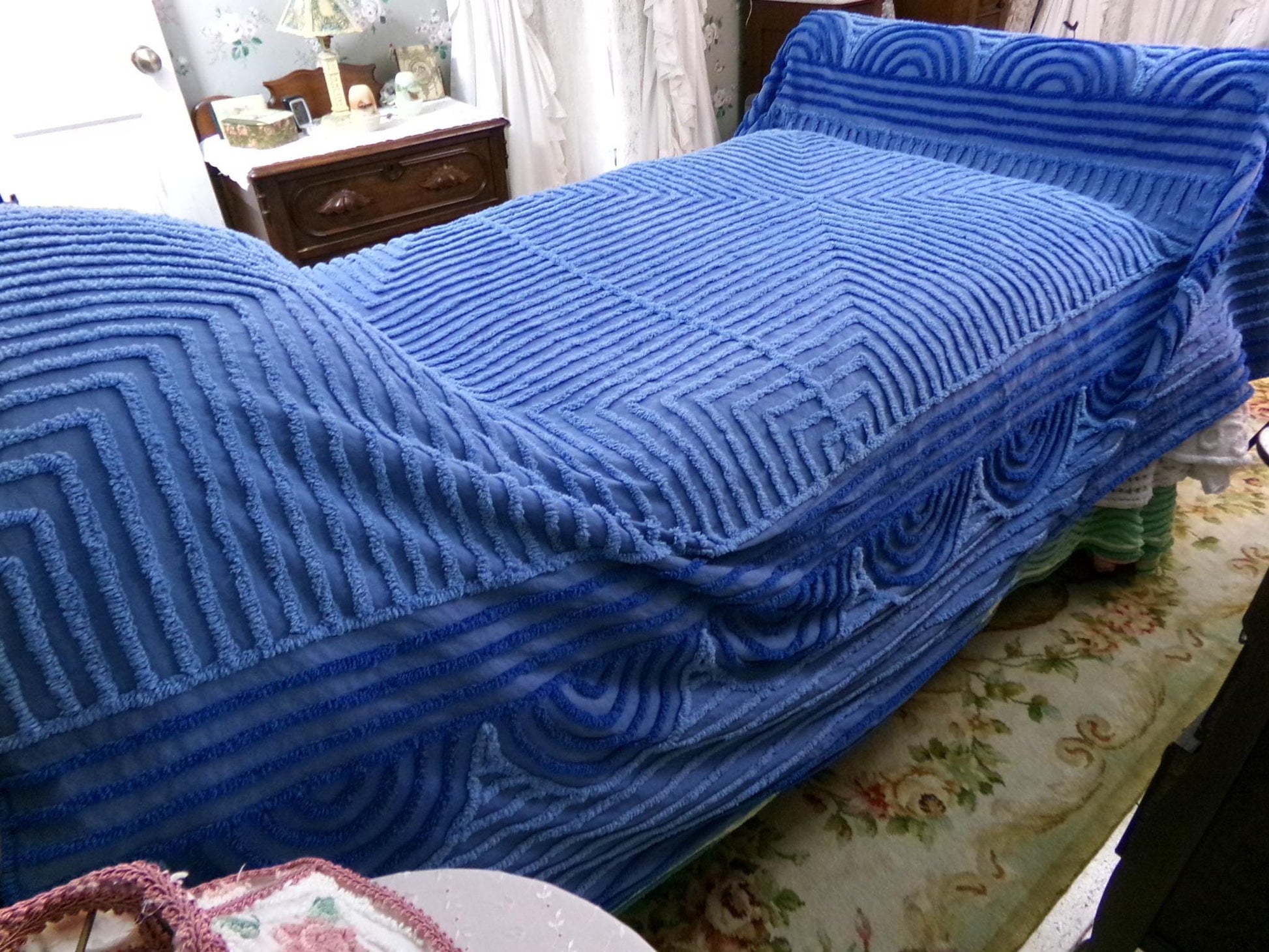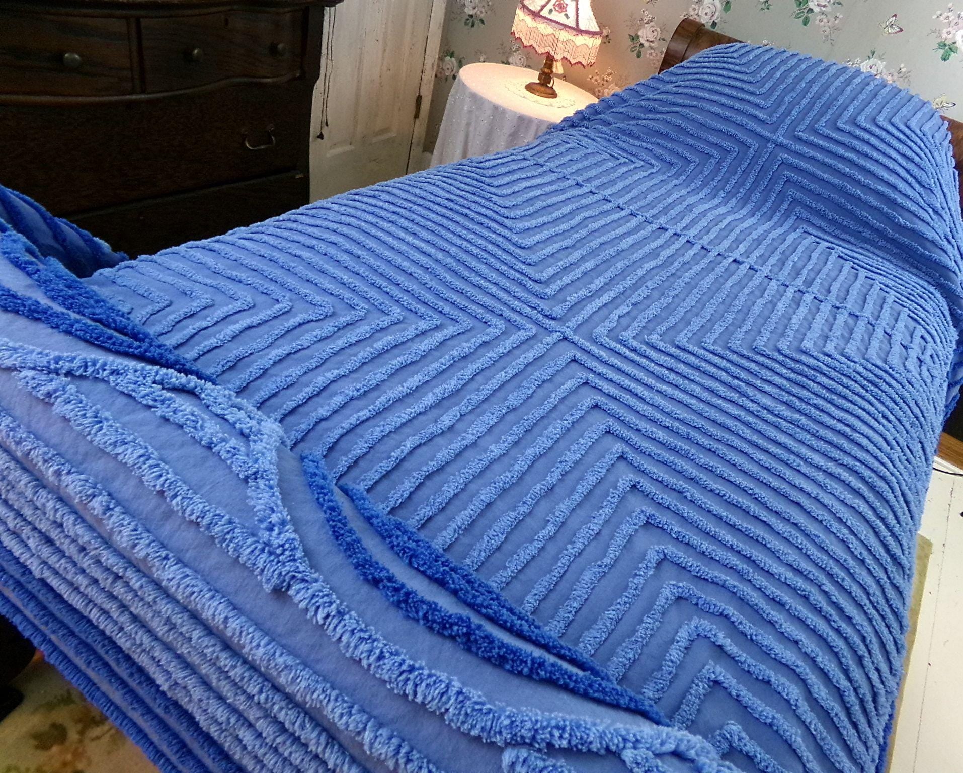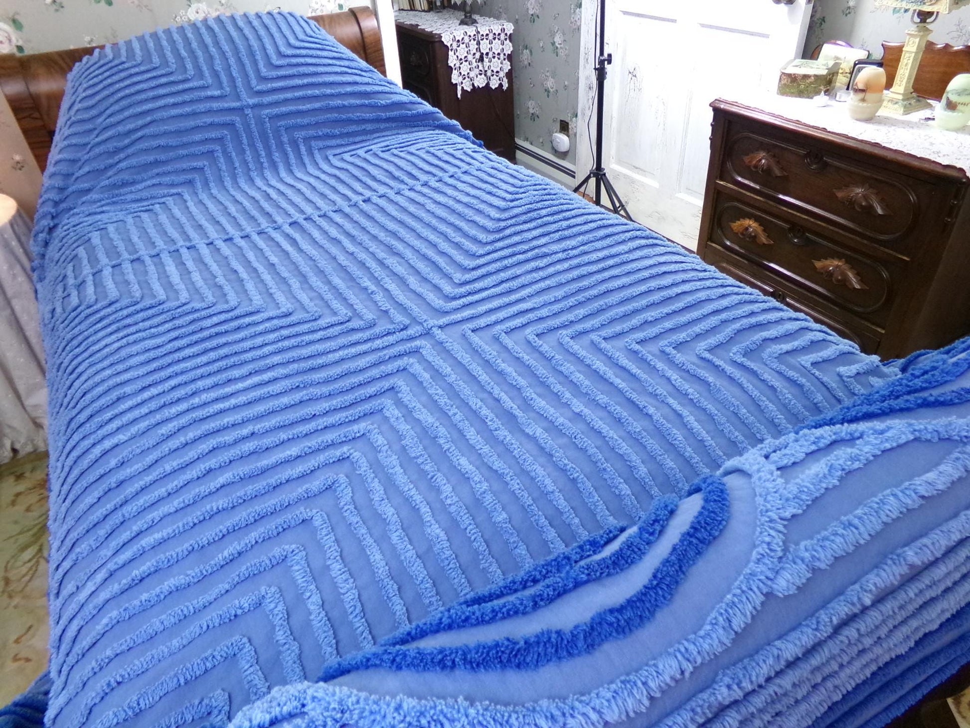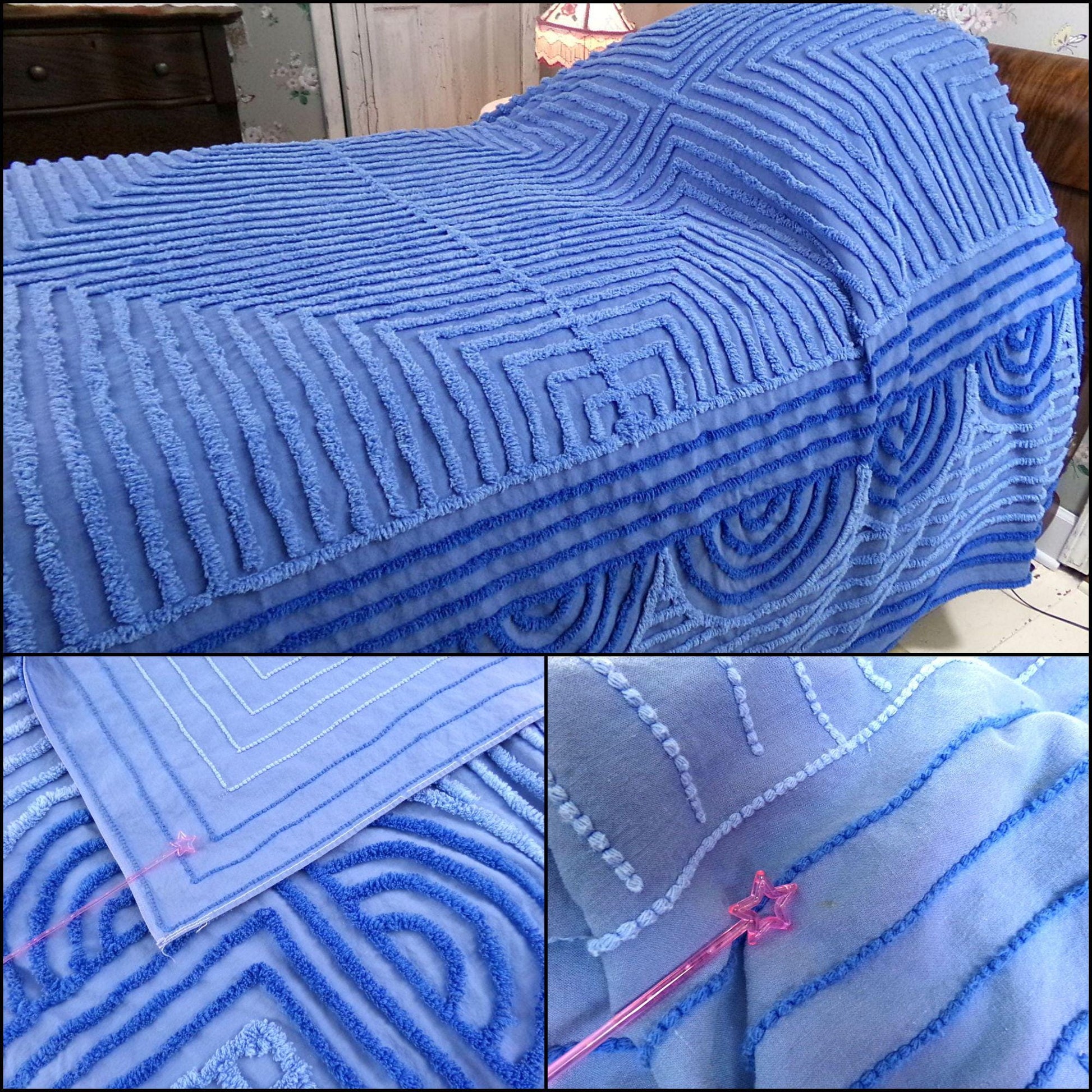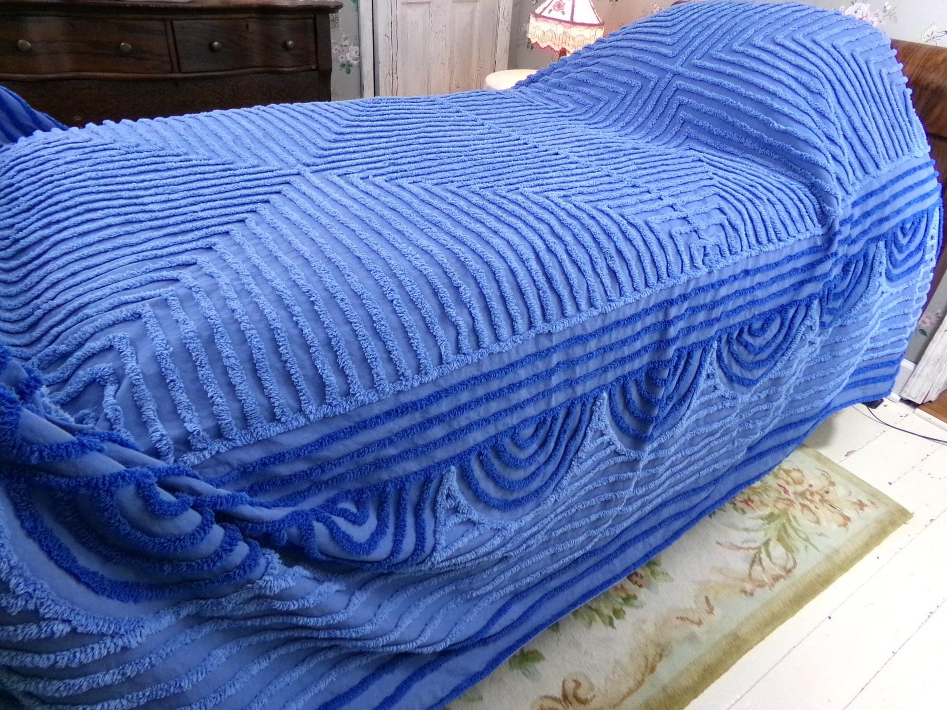 The shades of blue on this vintage chenille bedspread are so beautiful and soothing. It features an eye-catching geometric design with contrast swag scallops along the drop sides in a deep dreamy coordinating blue.The wonderful geometric design and gorgeous color give this bedspread a versatility, making it an effortless piece to incorporate in home decor themes from vintage to modern.