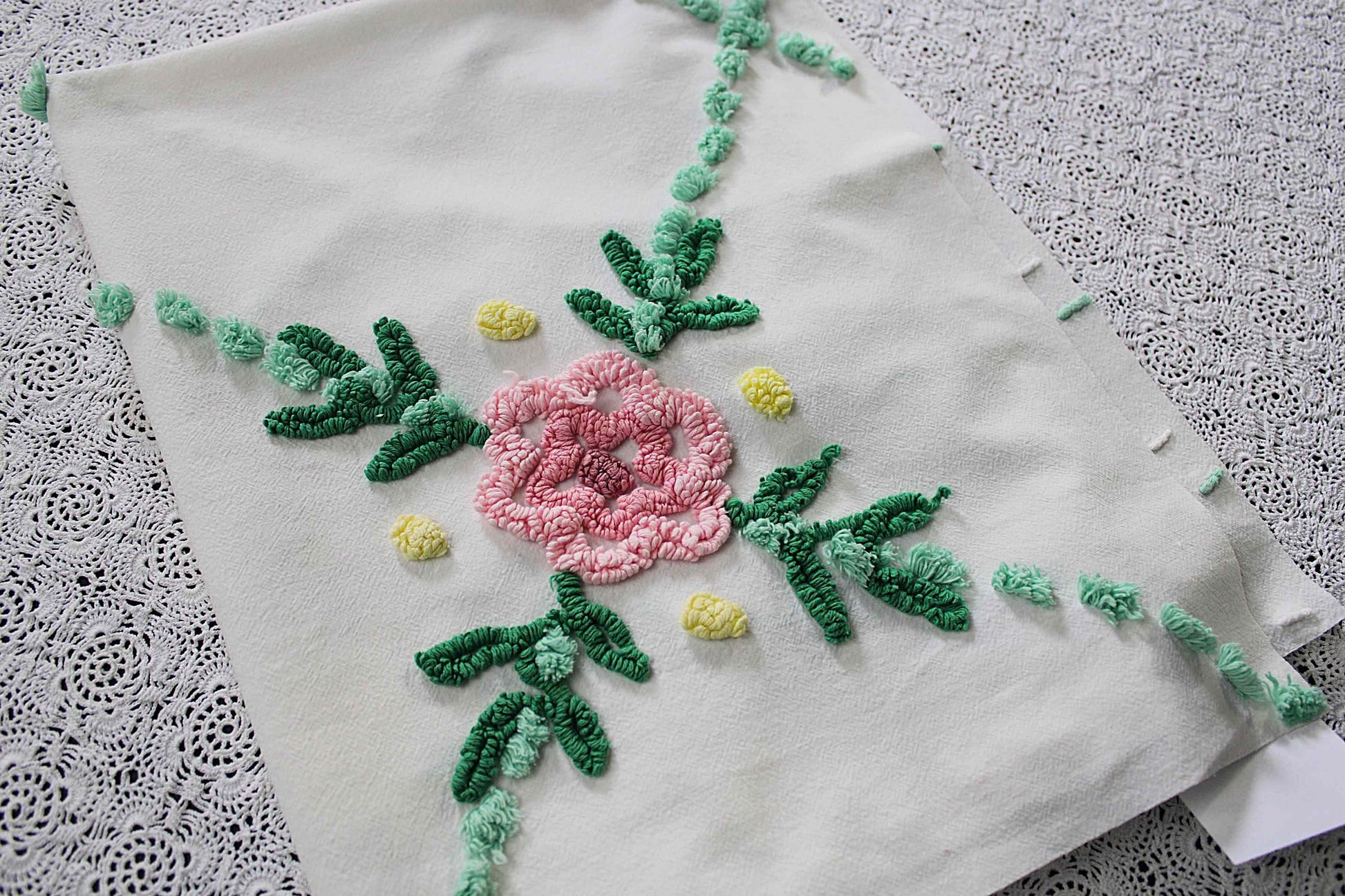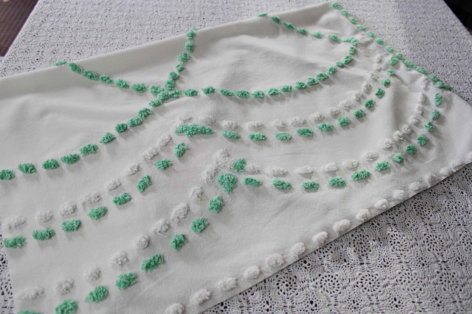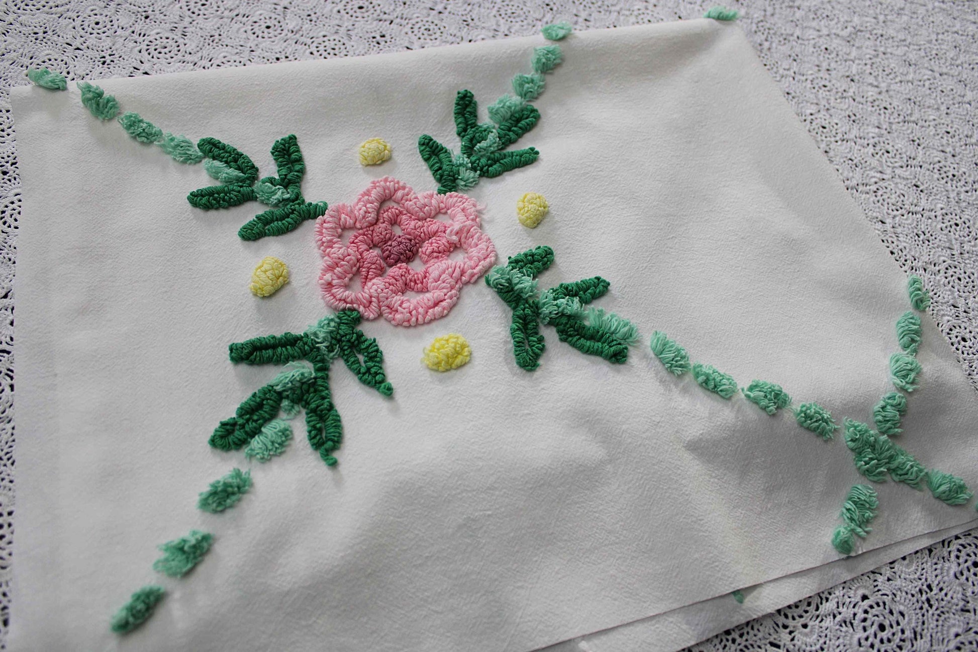 This pretty piece of vintage chenille fabric features a classic pink rose floral motif accented by jadeite green and white pops. Would be great inspo for a small accent pillow. Please be sure to study imgs showing msmts & placement of the floral motif, since it's situated to the side, not center, of the fabric.Approx 32" x 23" inch piece. 100% cotton, ultra lightweight, this will feel like an old school cotton sheet, with chenille tuft work.