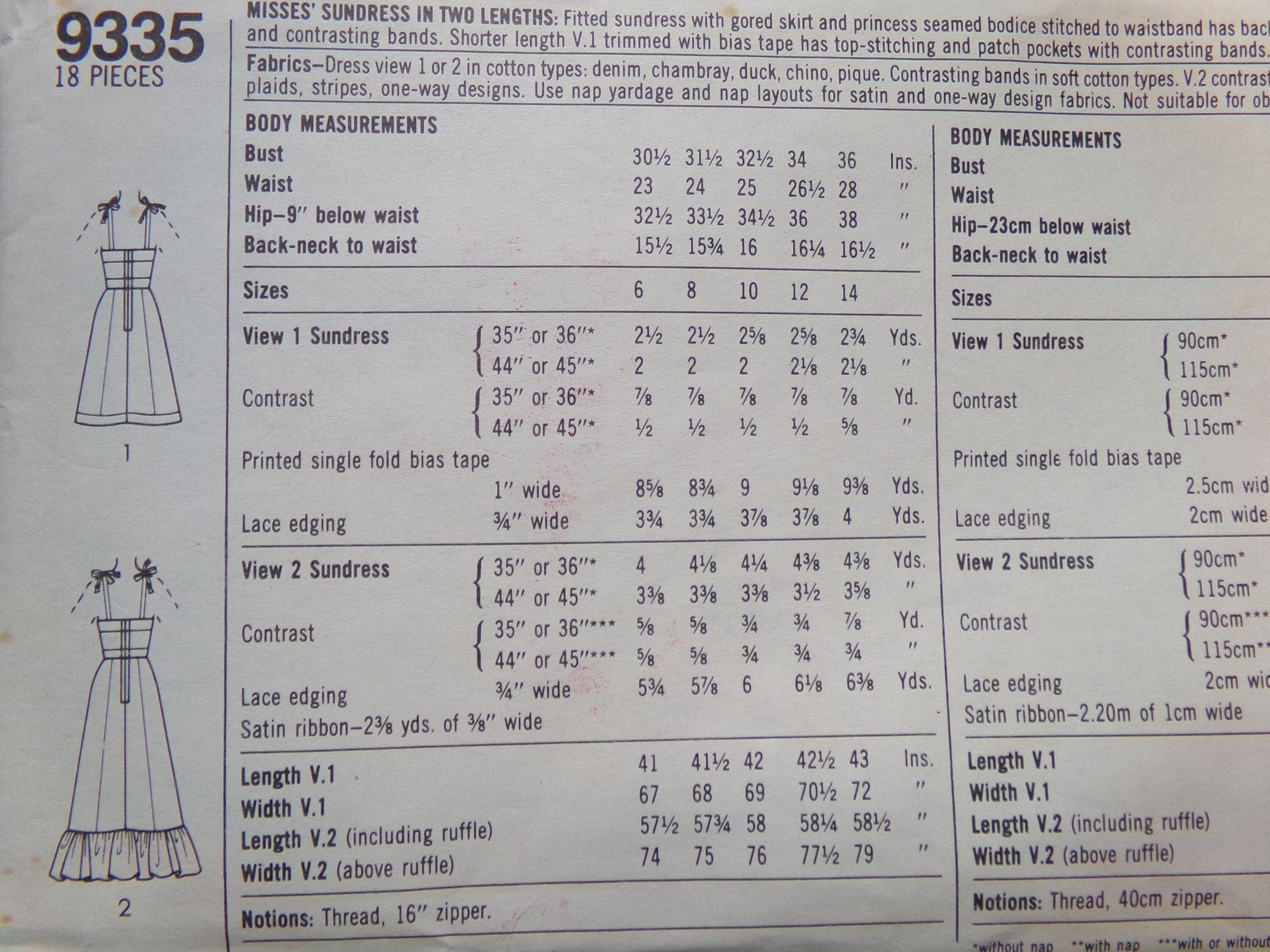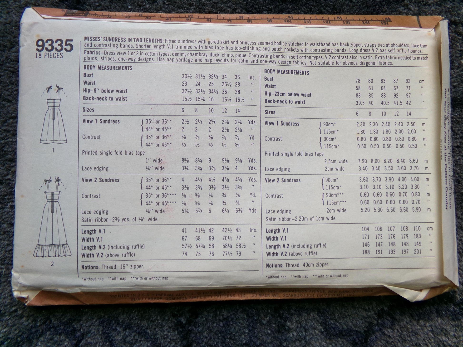 Rare vintage OOP Simplicity 9335 Juniors & Misses Gunne Sax Designer Couturier, fitted sun dress with gored skirt and princess seamed bodice stitched to waistband has back zipper, straps tied at shoulders, lace trim and contrasting bands.Shorter length V. 1 is trimmed with bias tape & has top stitching and patch pockets with contrasting bands. Long dress V. 2 has self ruffle flounce.