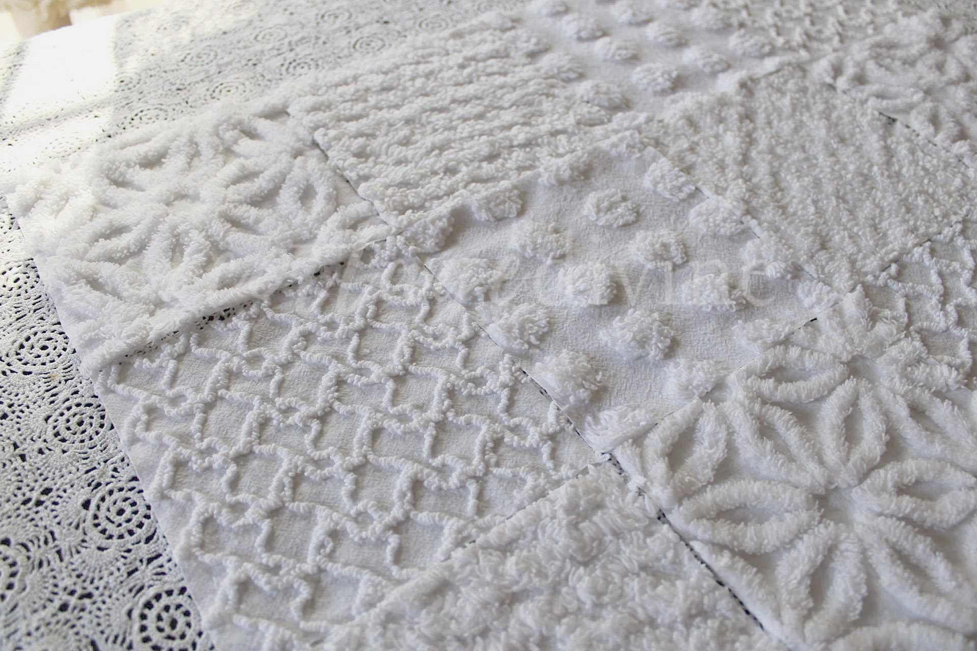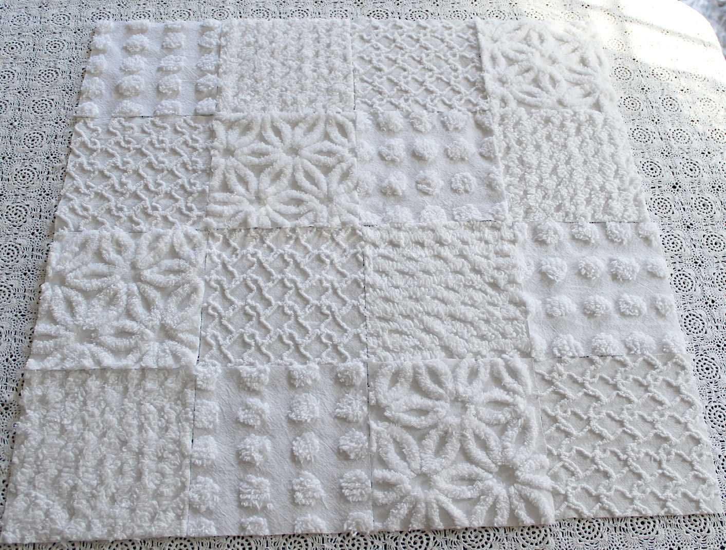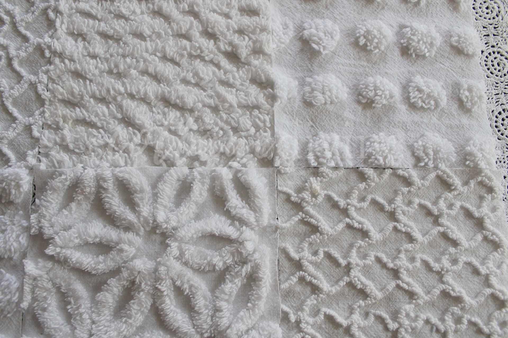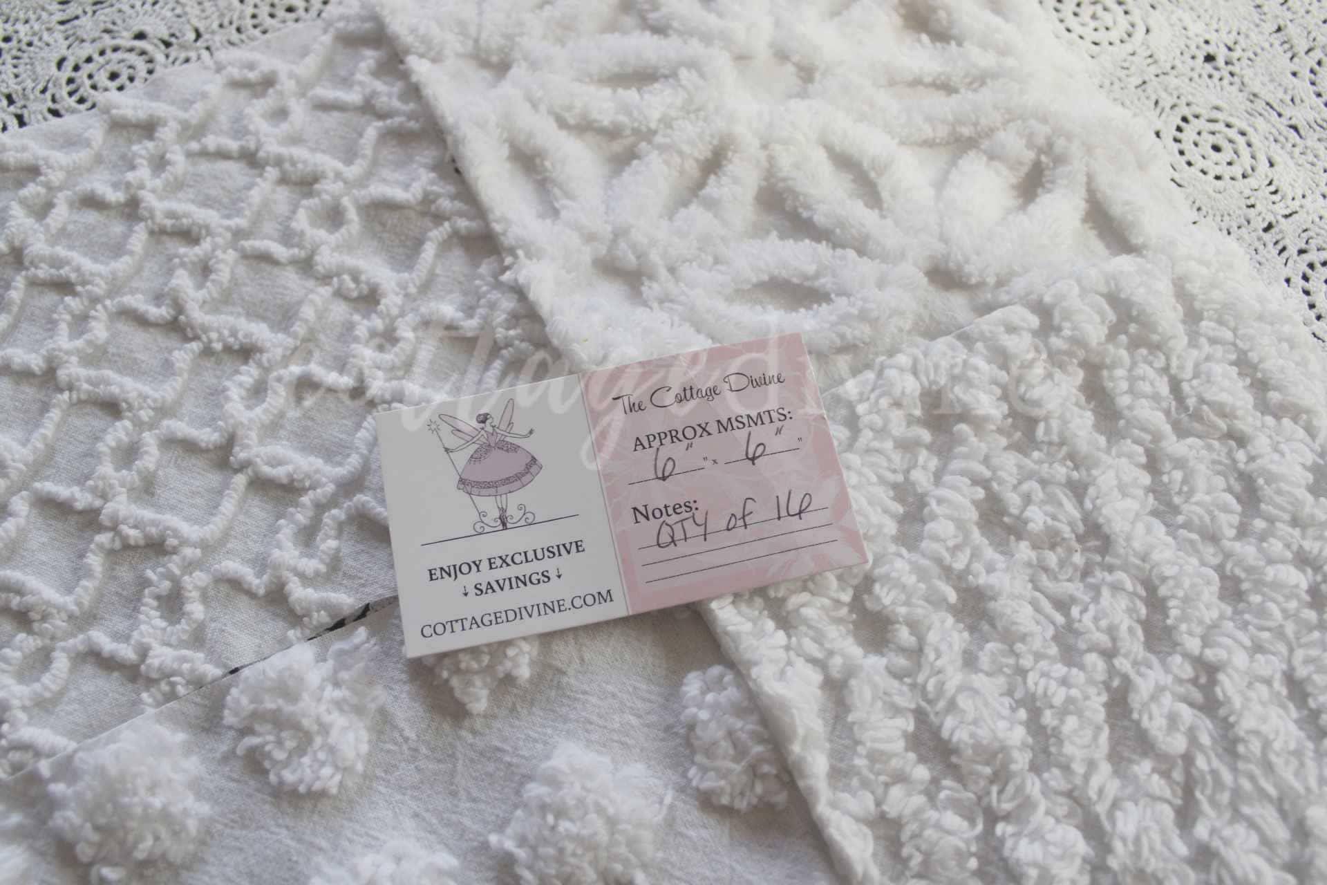 "Snow Angel" A simple, beautiful medley of 16 white chenille quilt squares that offer unique textural interest and an old farmhouse appeal.::total qty: 16 chenille quilt squares