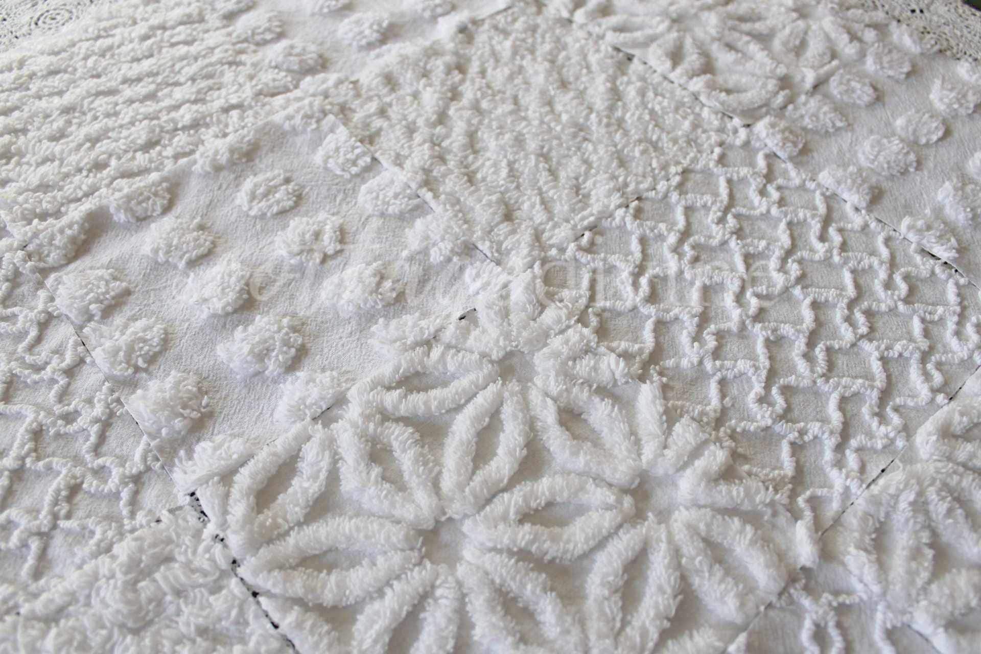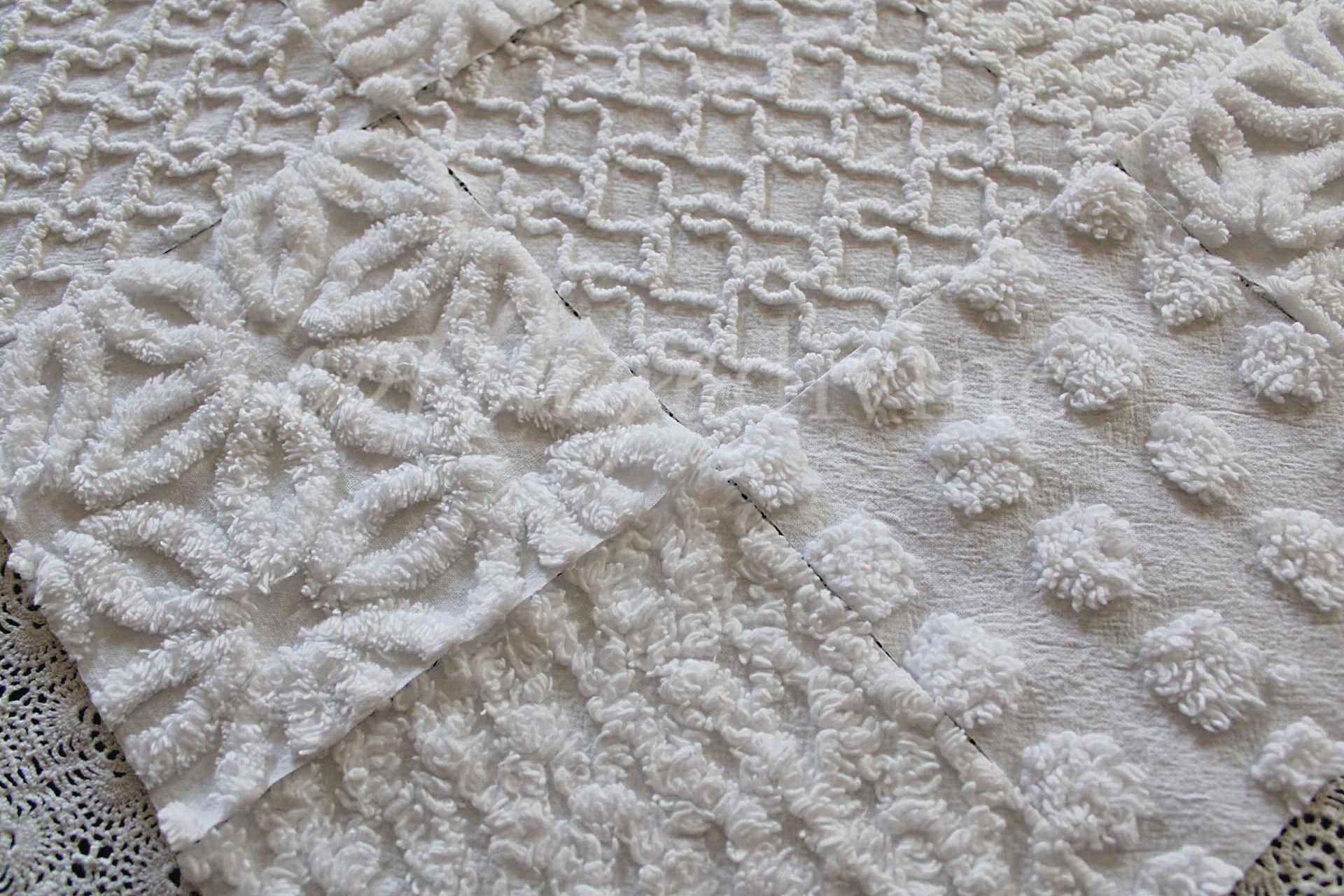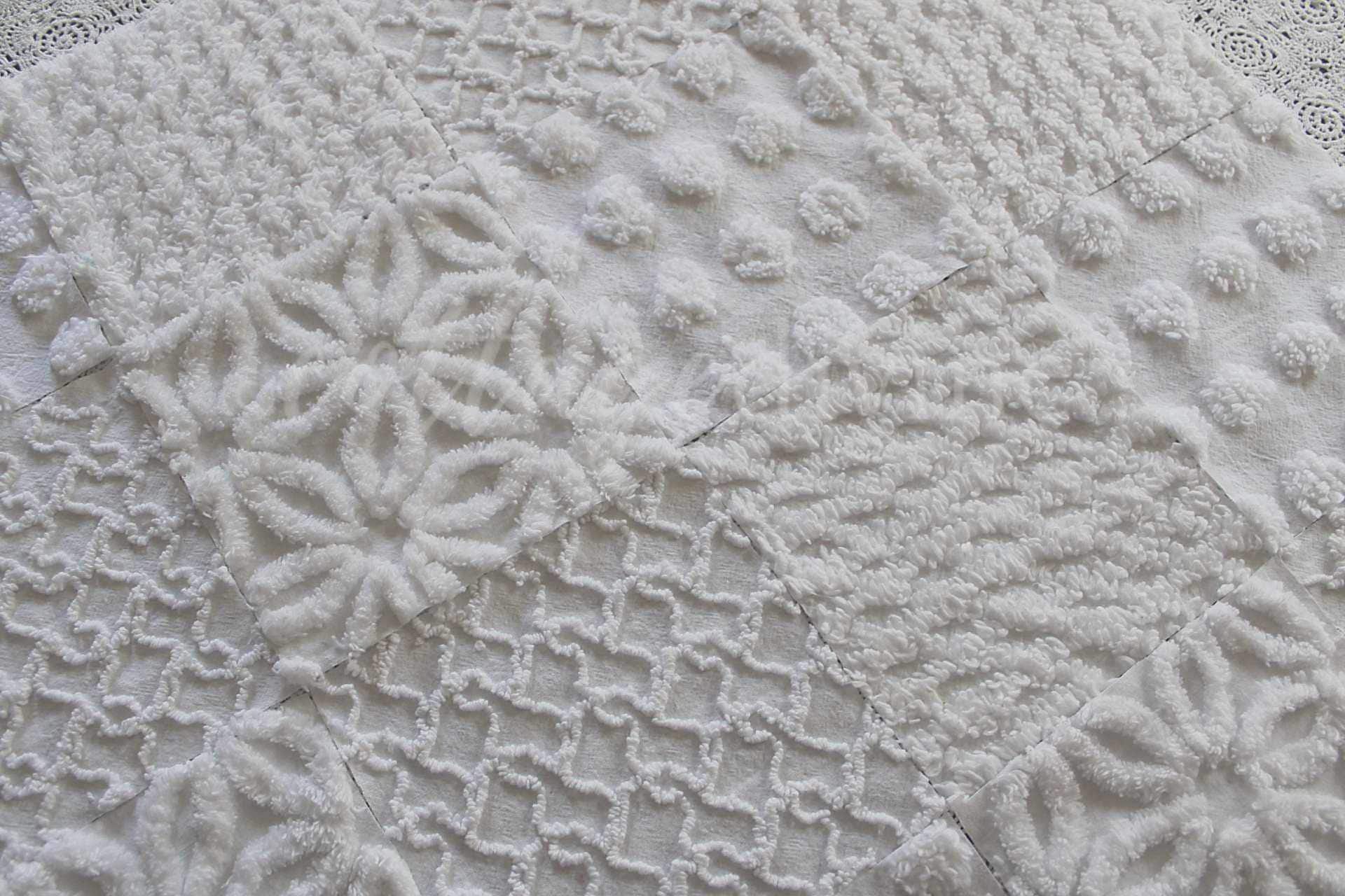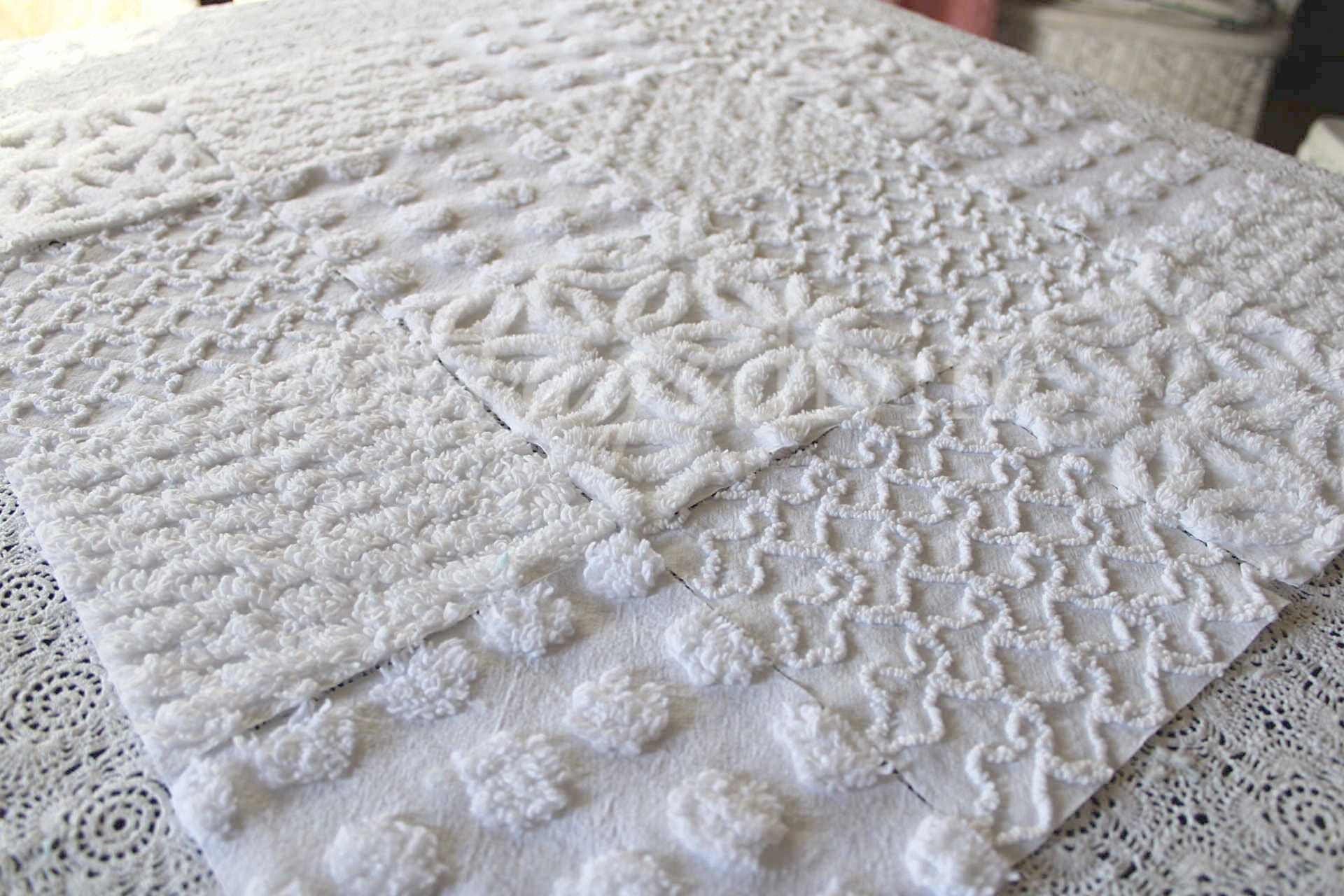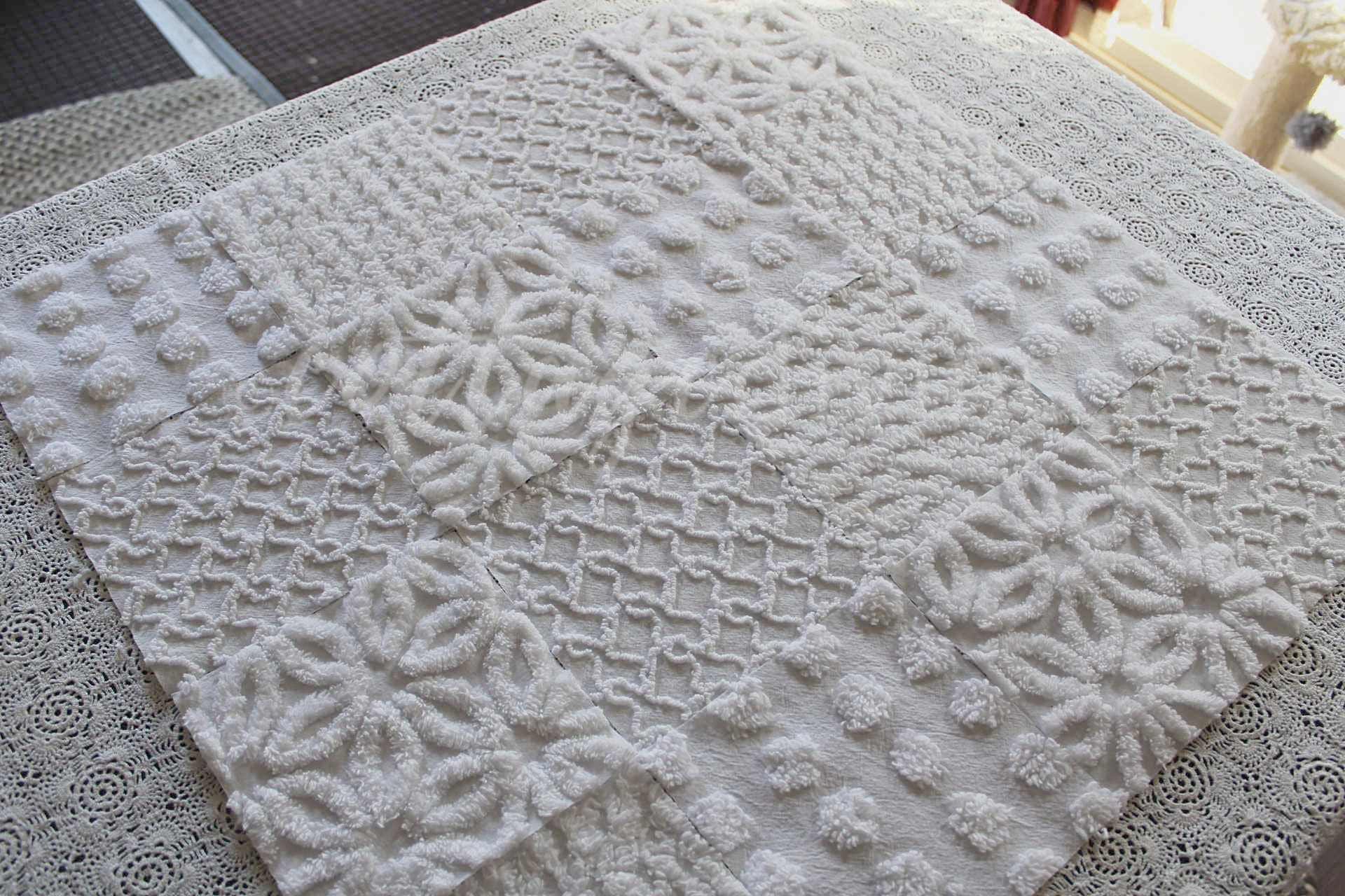 "Snow Angel" A simple, beautiful medley of 16 white chenille quilt squares that offer unique textural interest and an old farmhouse appeal.::total qty: 16 chenille quilt squares
