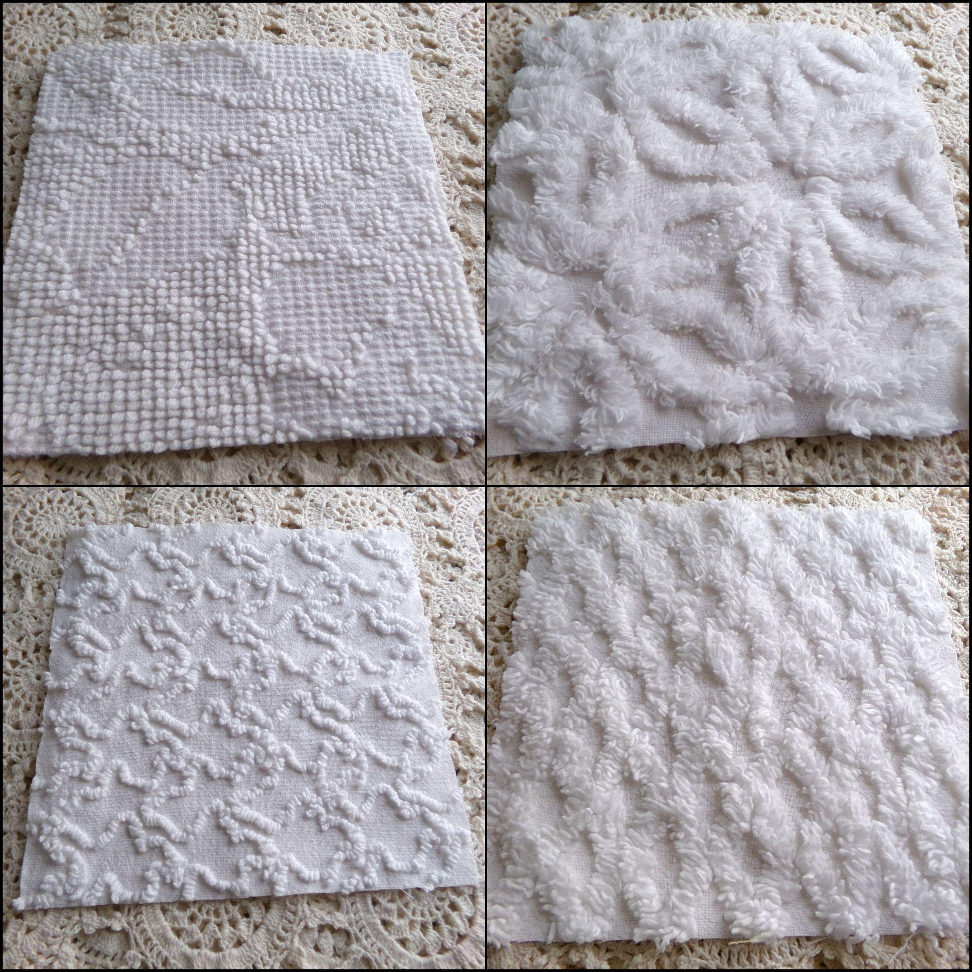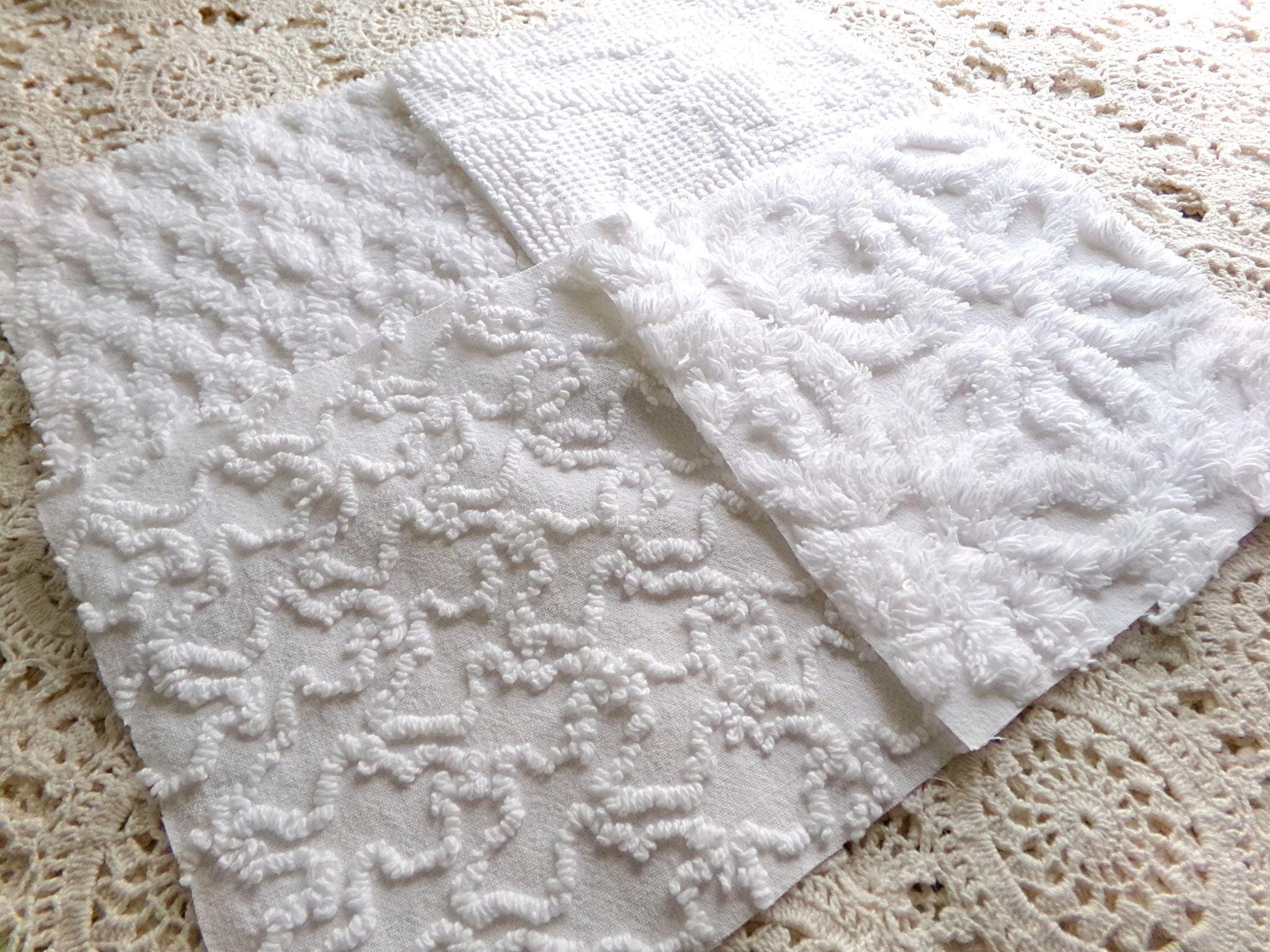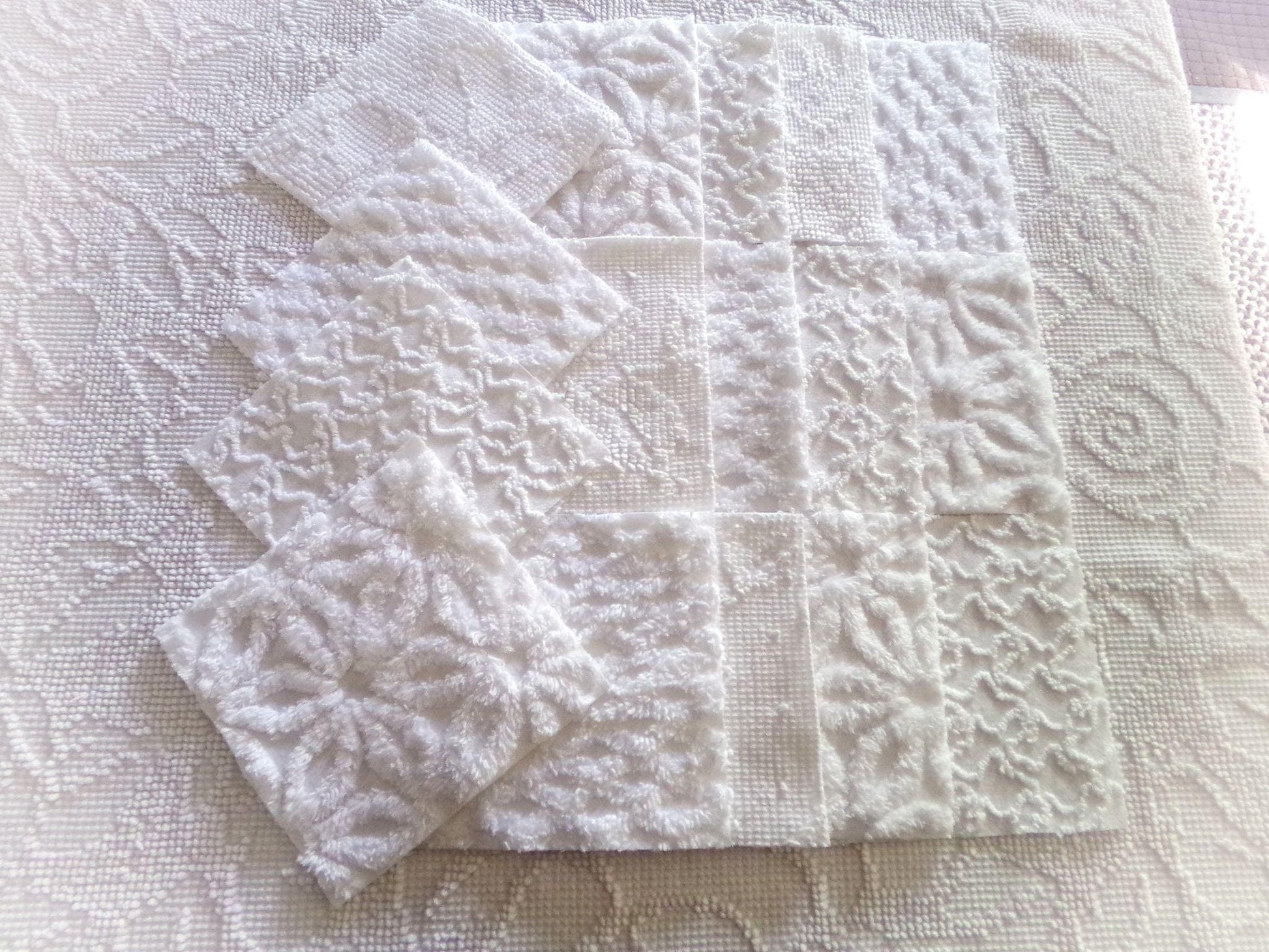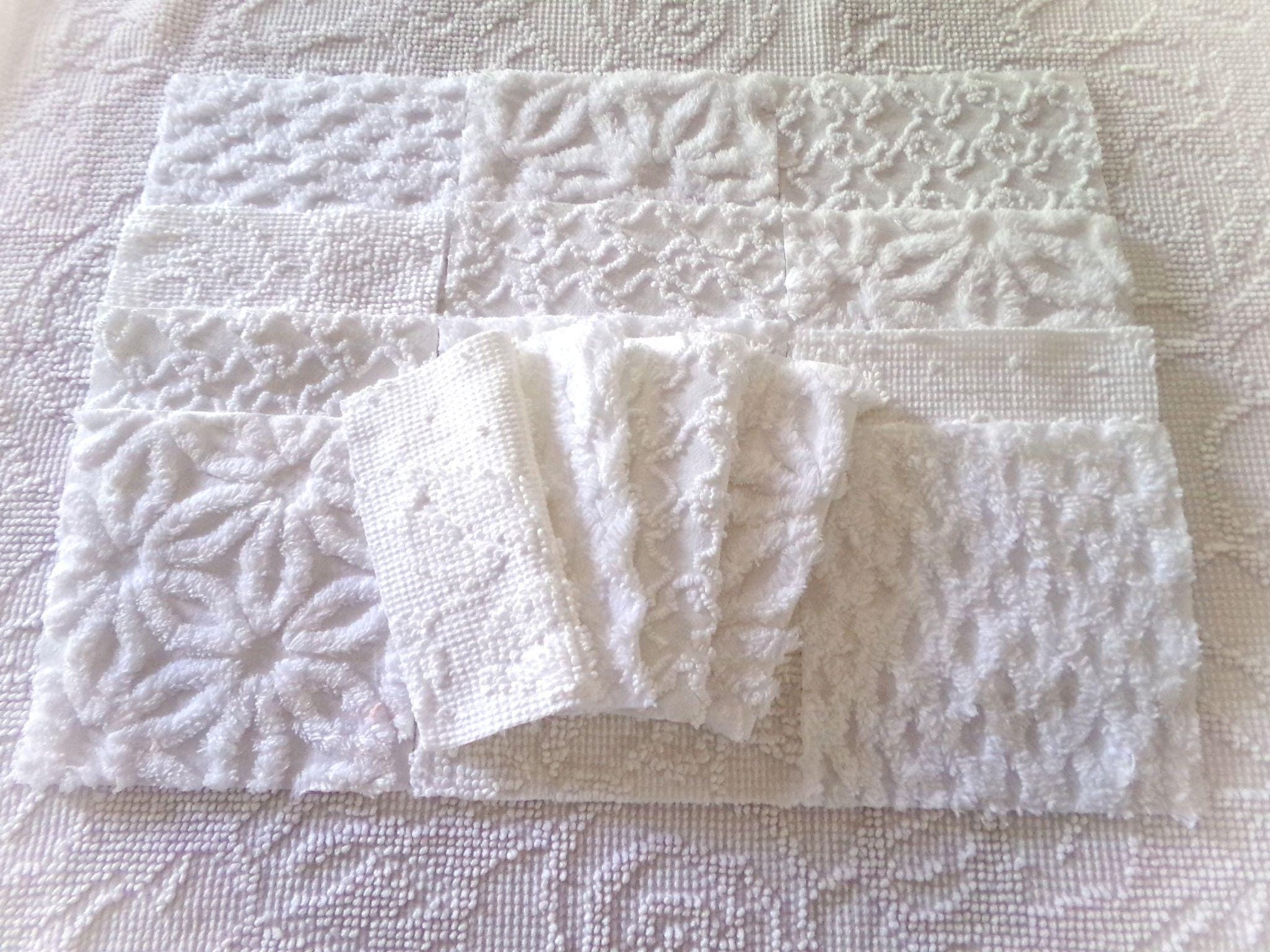 Here is a set of fresh "snow baby" white vintage chenille fabric squares in great textures to inspire or enhance your next creative design. Neutral, versatile & classically elegant.::total qty: 16 chenille quilt squares