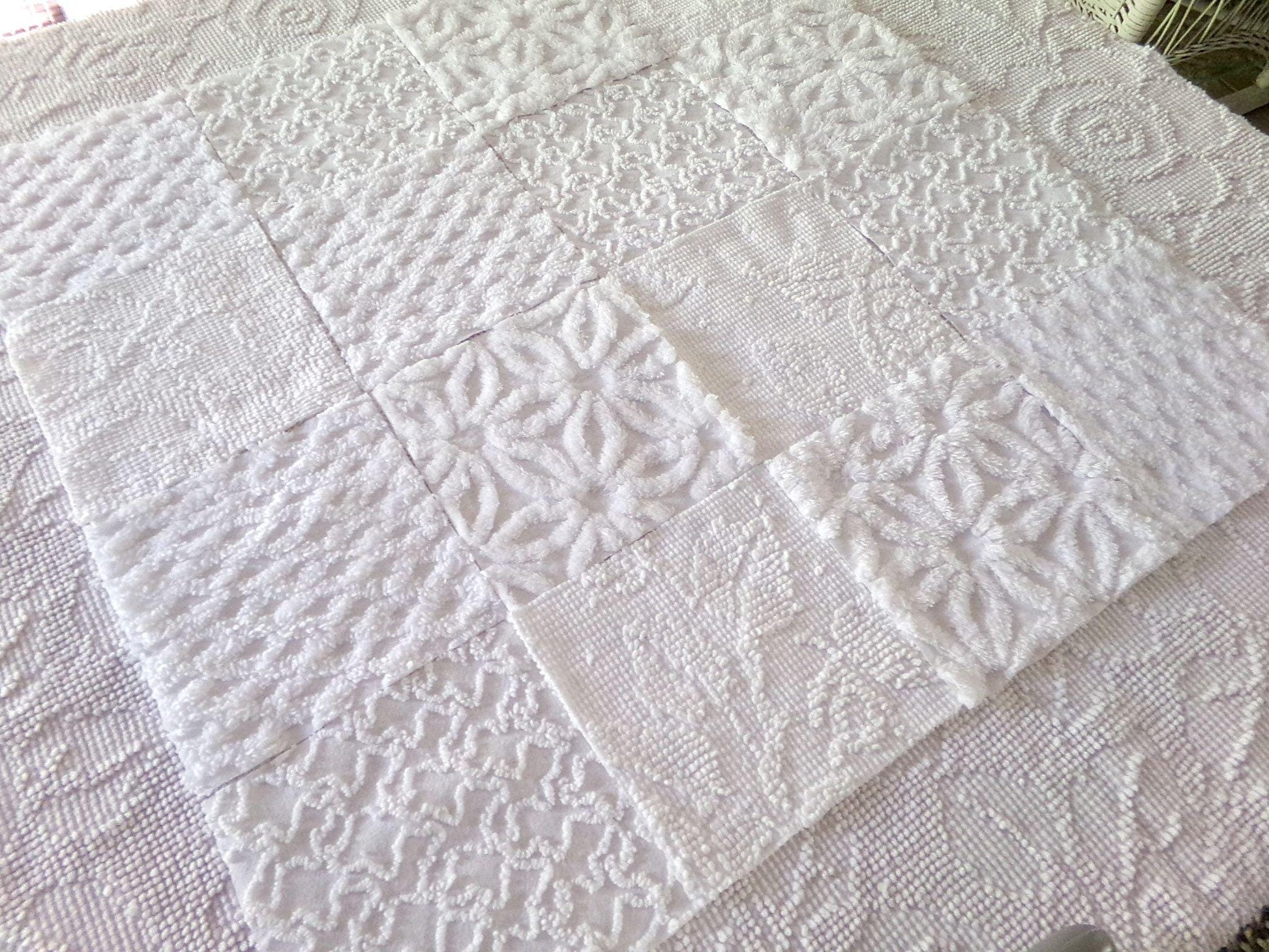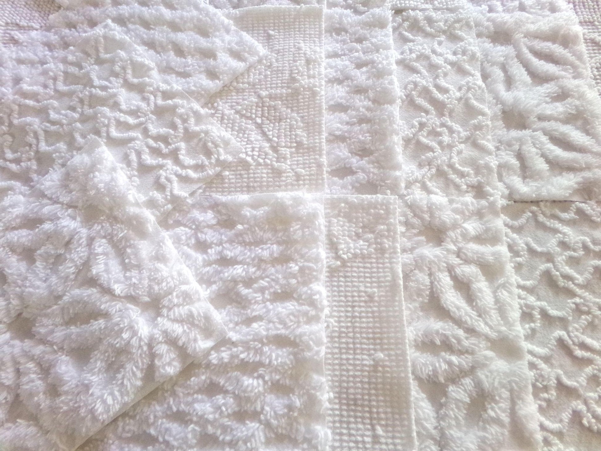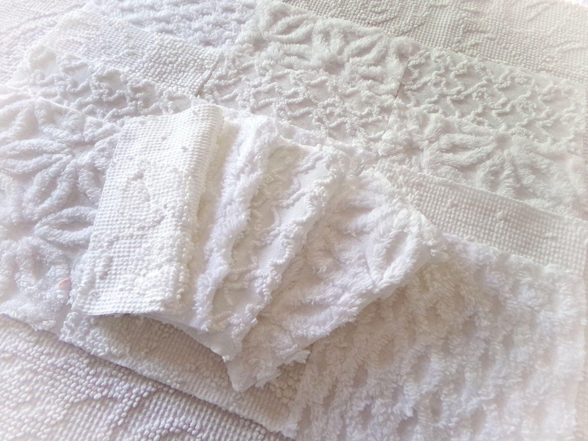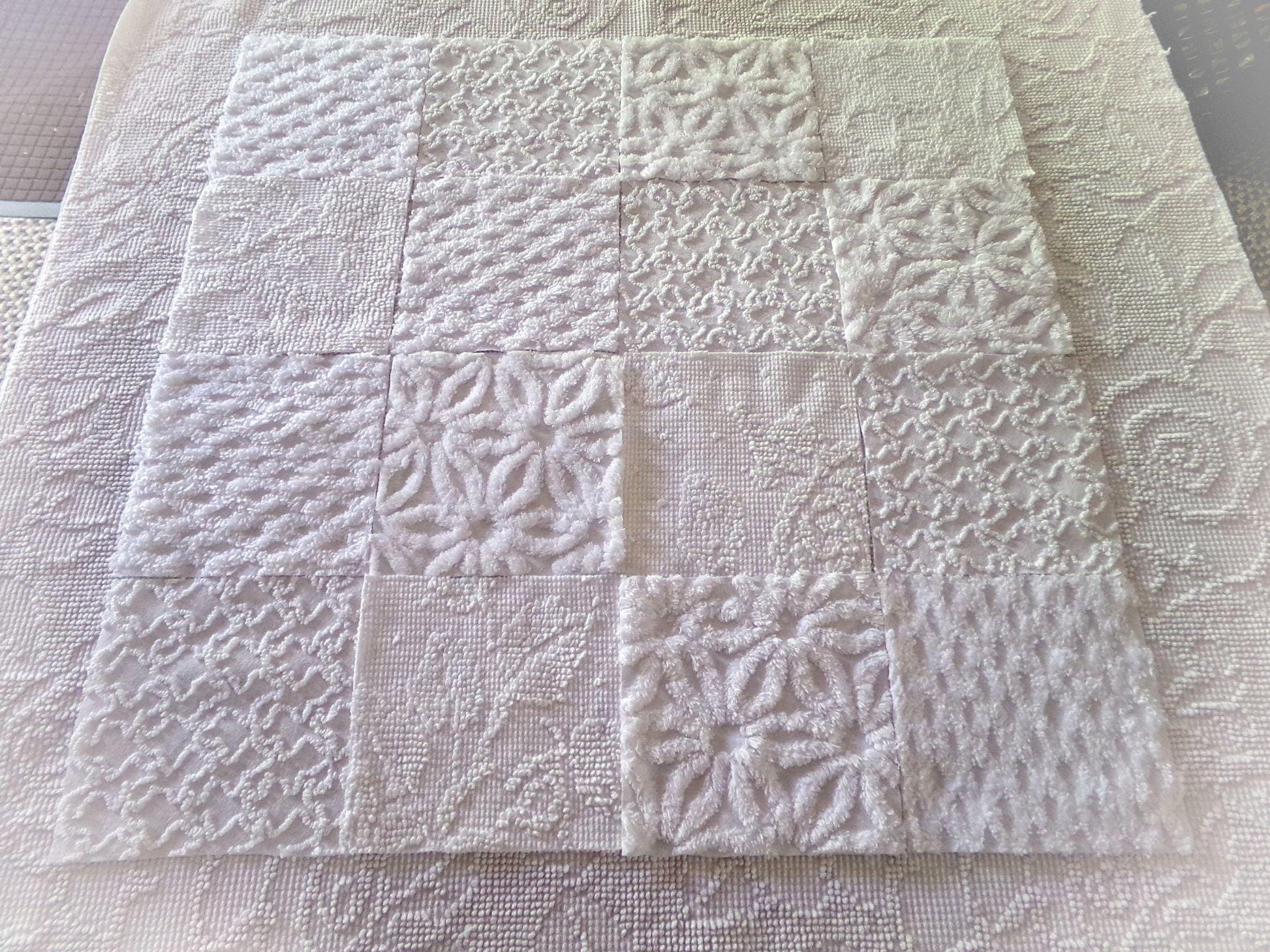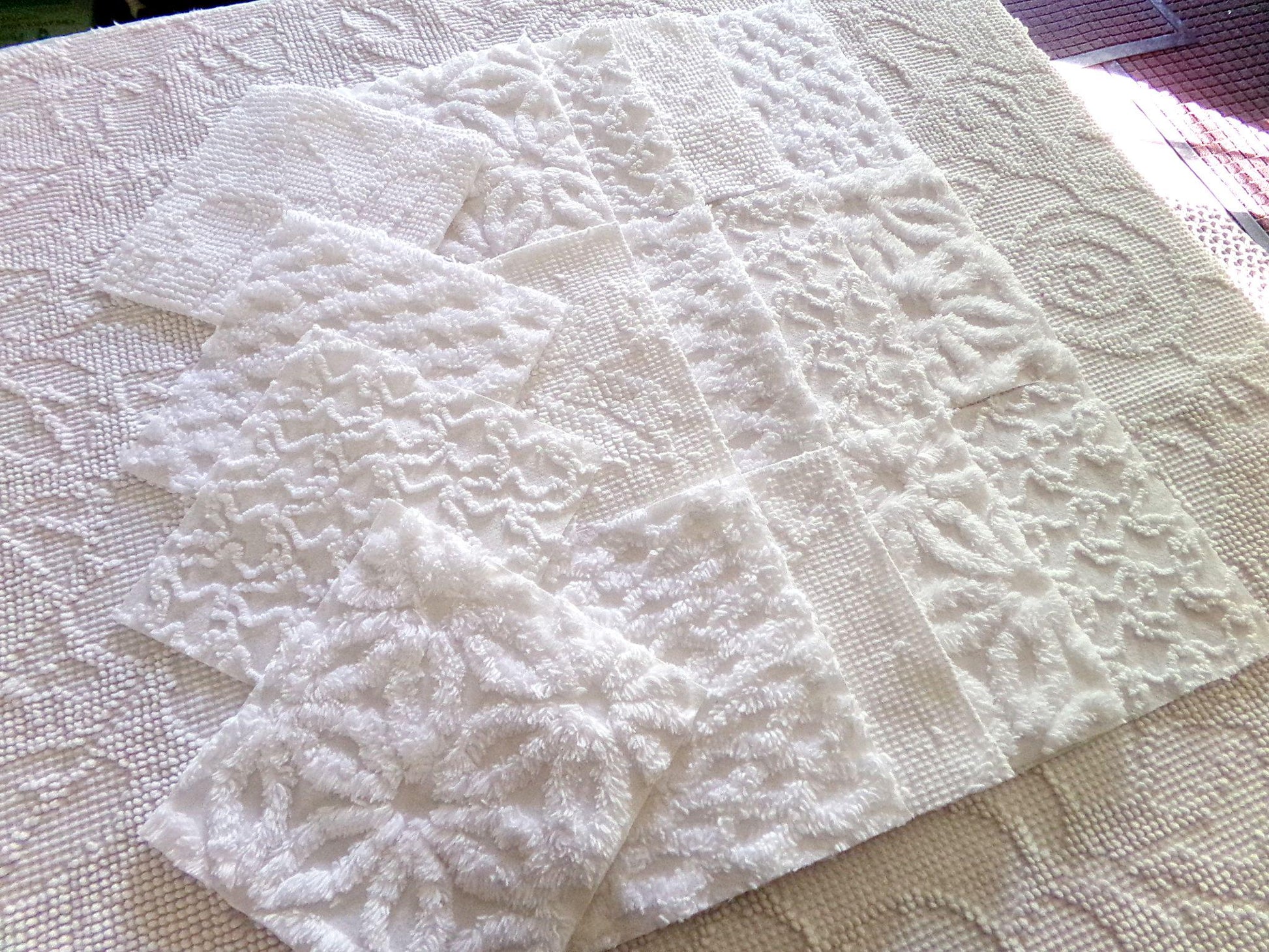 Here is a set of fresh "snow baby" white vintage chenille fabric squares in great textures to inspire or enhance your next creative design. Neutral, versatile & classically elegant.::total qty: 16 chenille quilt squares