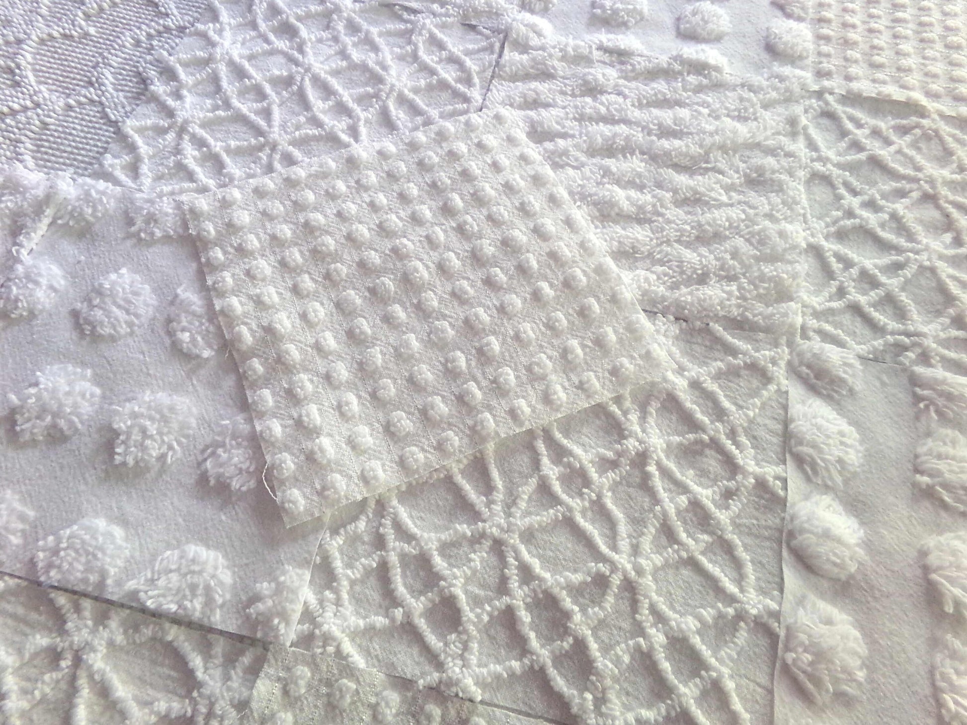 Snow White Serene...a set of 16 texturized fabric squares in classic white to inspire or enhance designs from vintage style to modern chic.You'll receive 4 each of the following patterns: coin dot, diamond lattice, little pops with shimmer silver lurex, and petite needletuft eternity links.