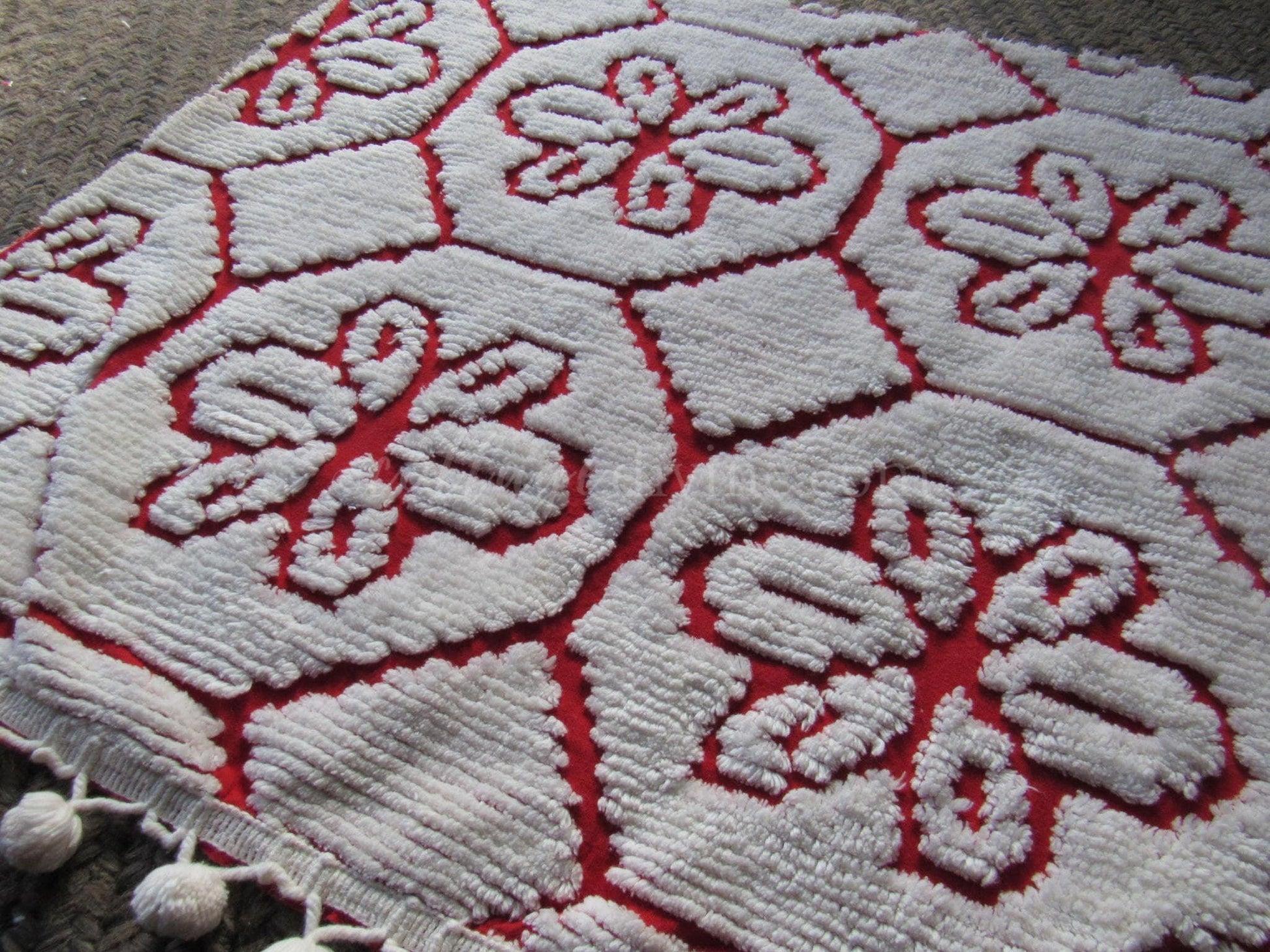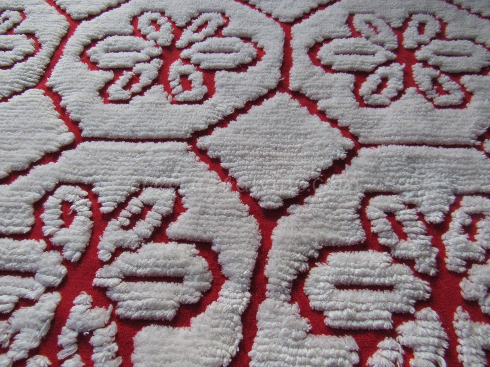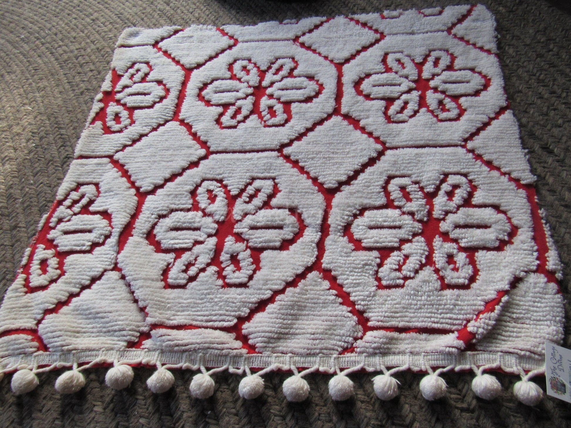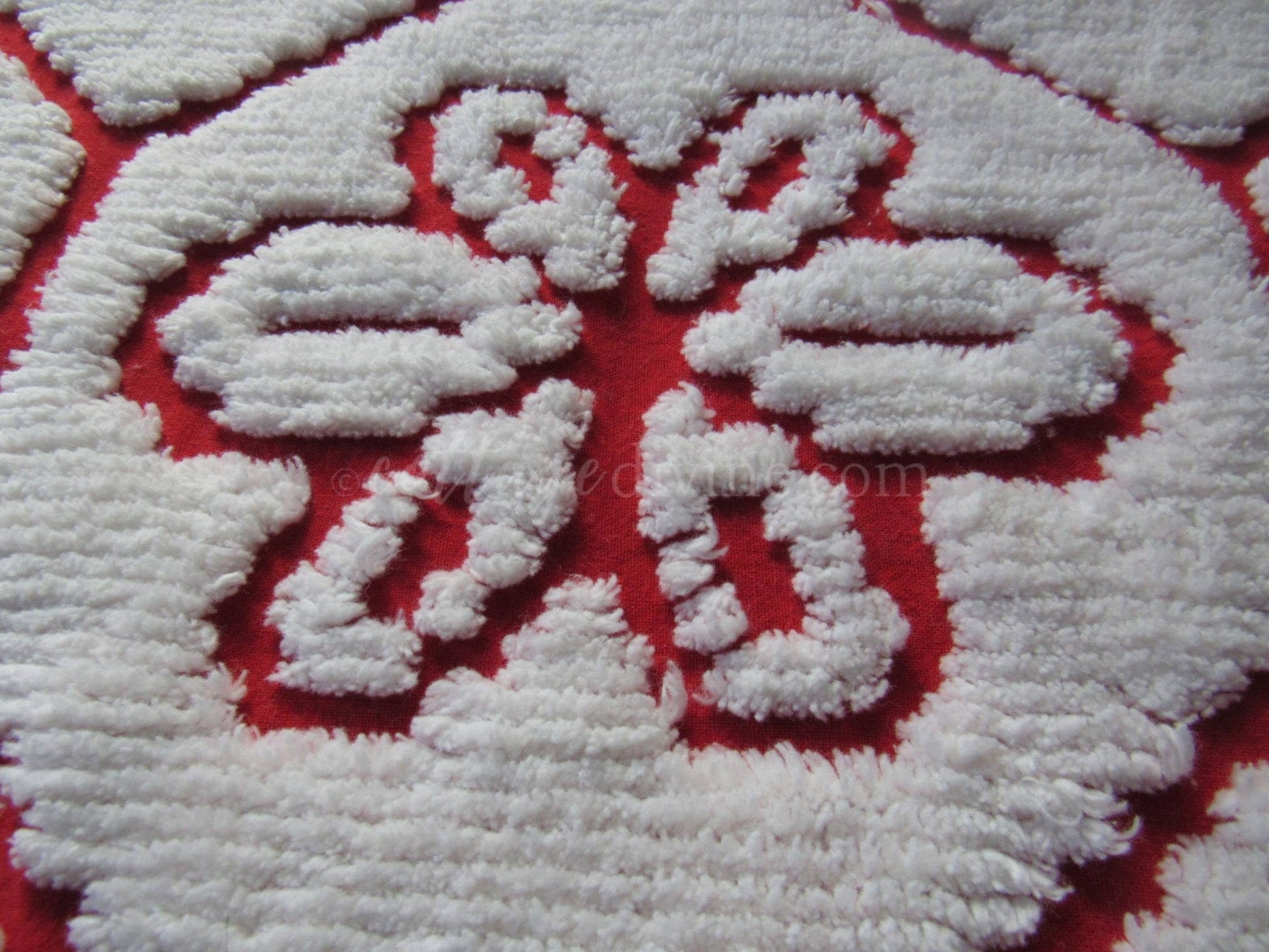 see more, cottagedivine.comLove the fun colorway on this piece of vintage chenille fabric, in a lively red tufted with snowy white geometric daisy designs. Ideal for any project that could use bold color and a unique textured design.
