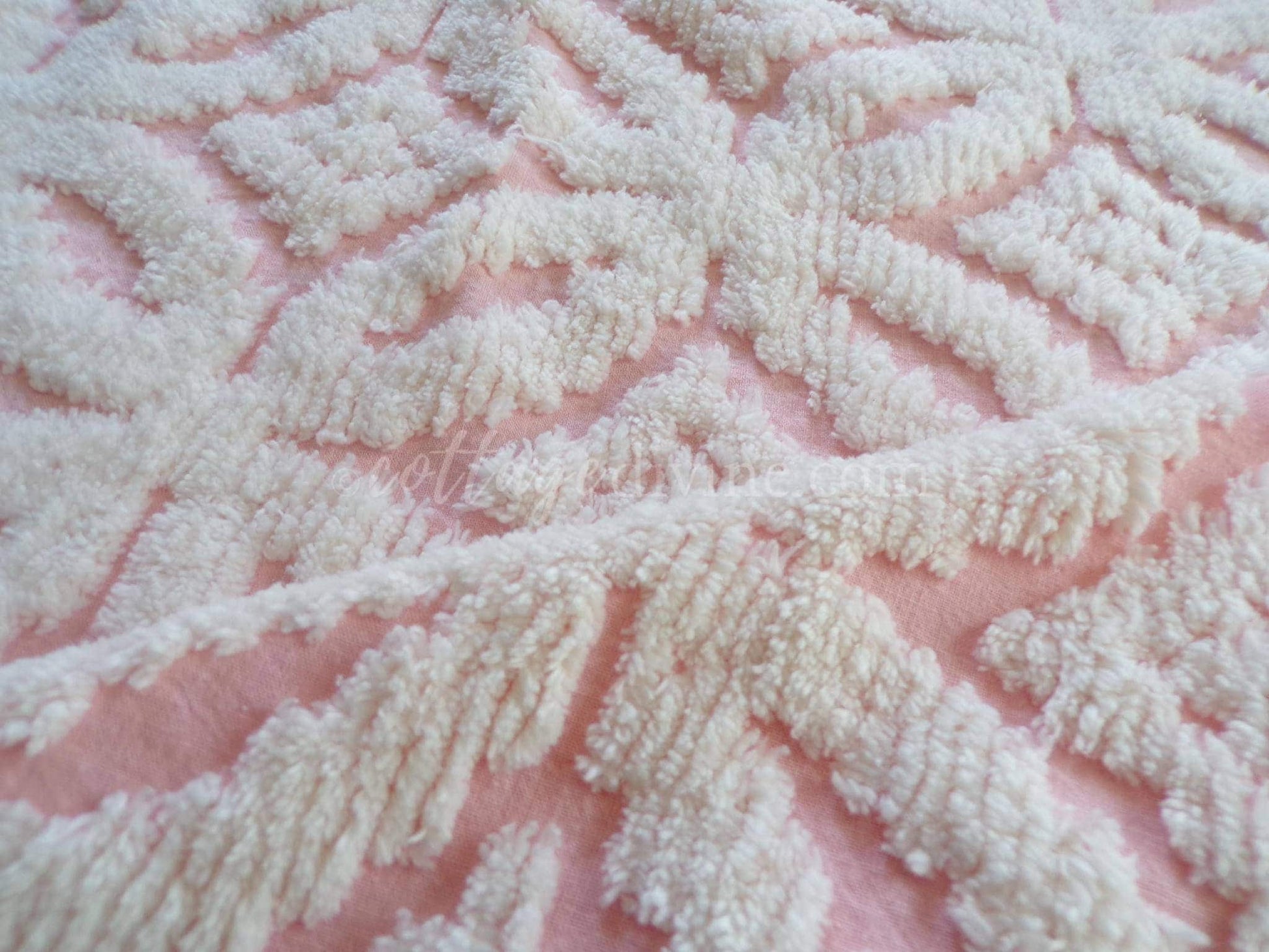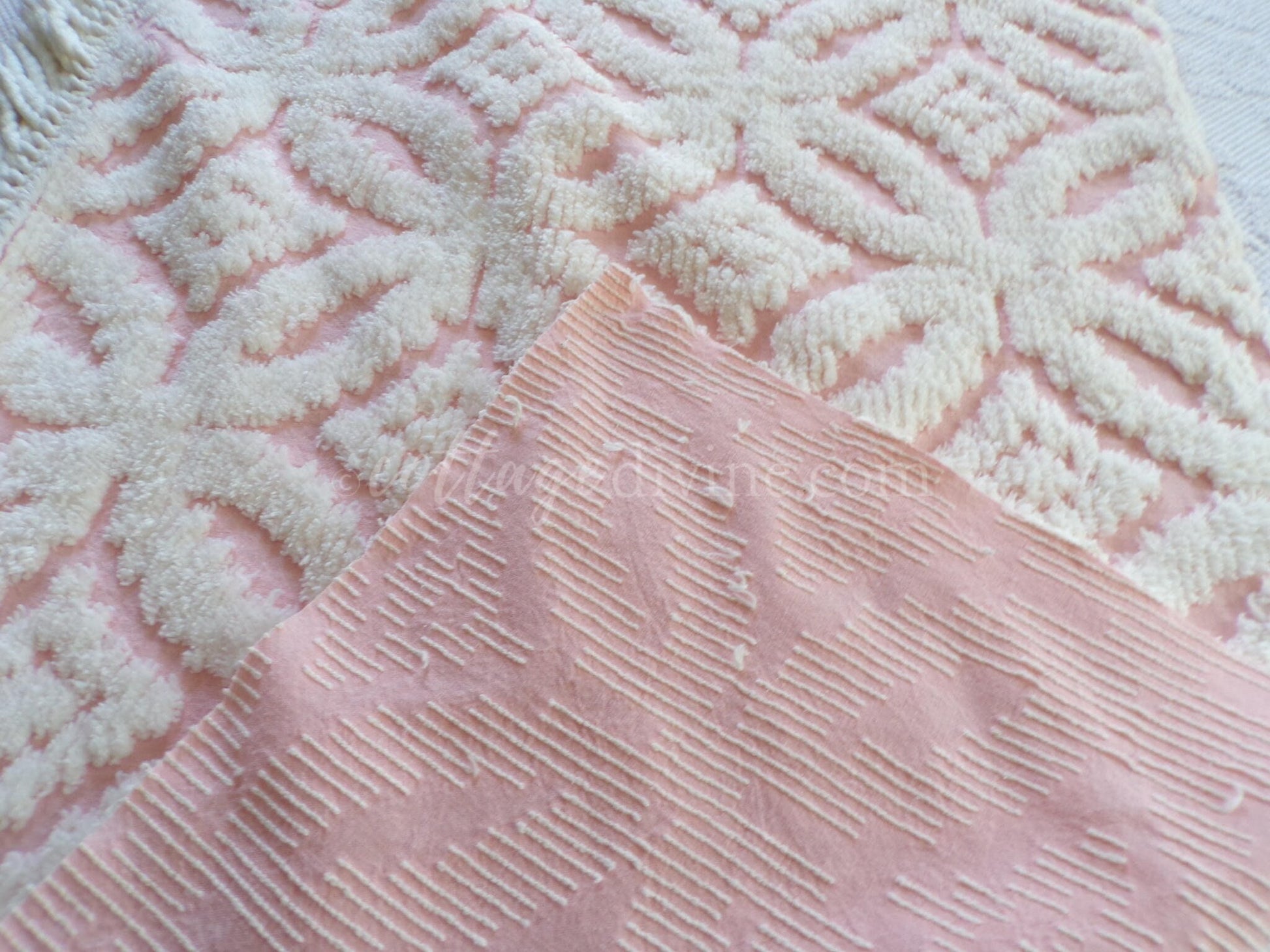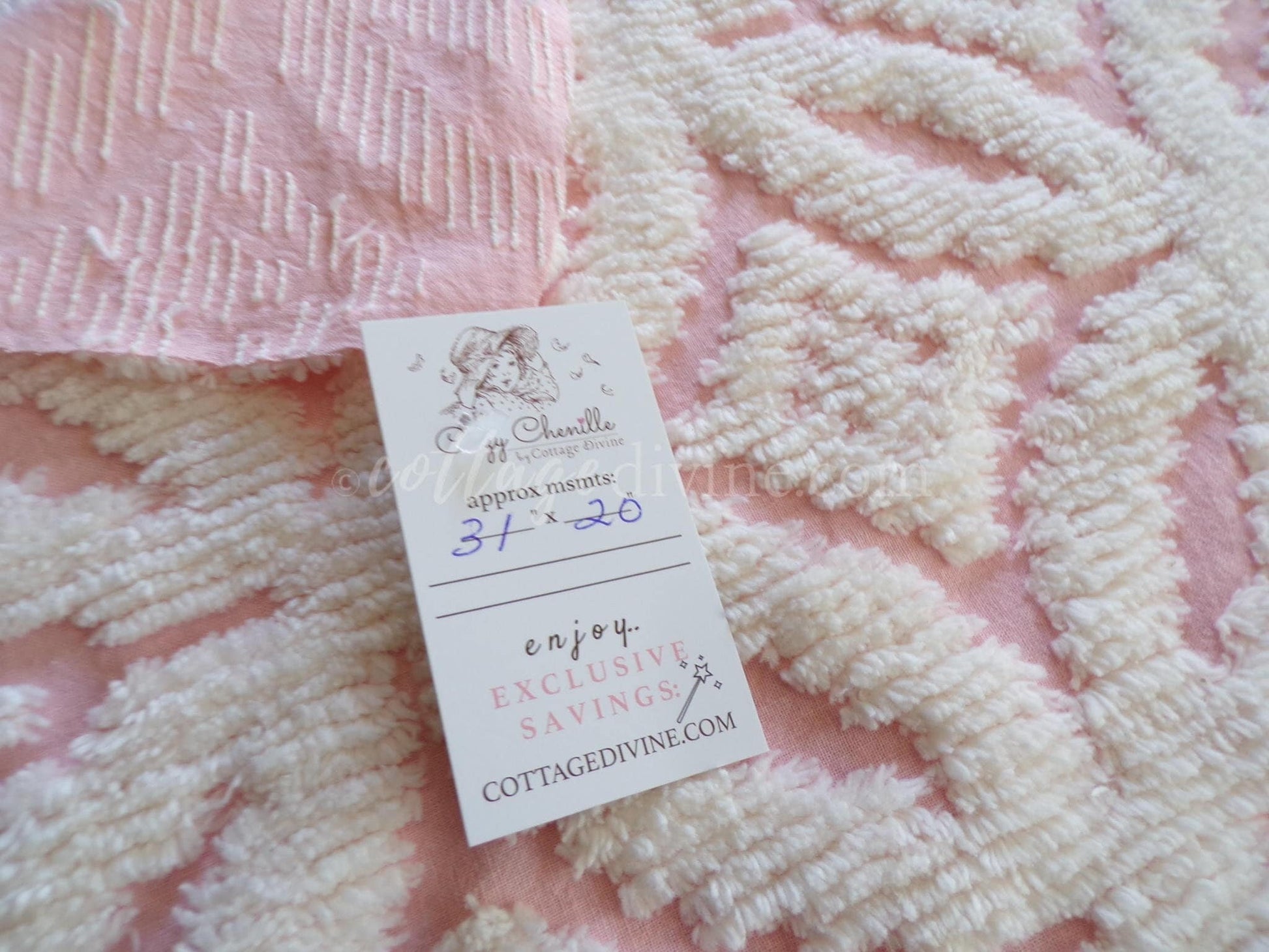 Wonderfully fluffy pretty-in-pink vintage chenille material in a plush sculpted white wedding ring design. Beautifully feminine colorway and a classic pattern make this fabric versatile enough to incorporate into a range of design concepts, from cozy cottage charming to modern chicApprox 20" x 31" piece. Soft cotton.w h a t - t o - k n o w