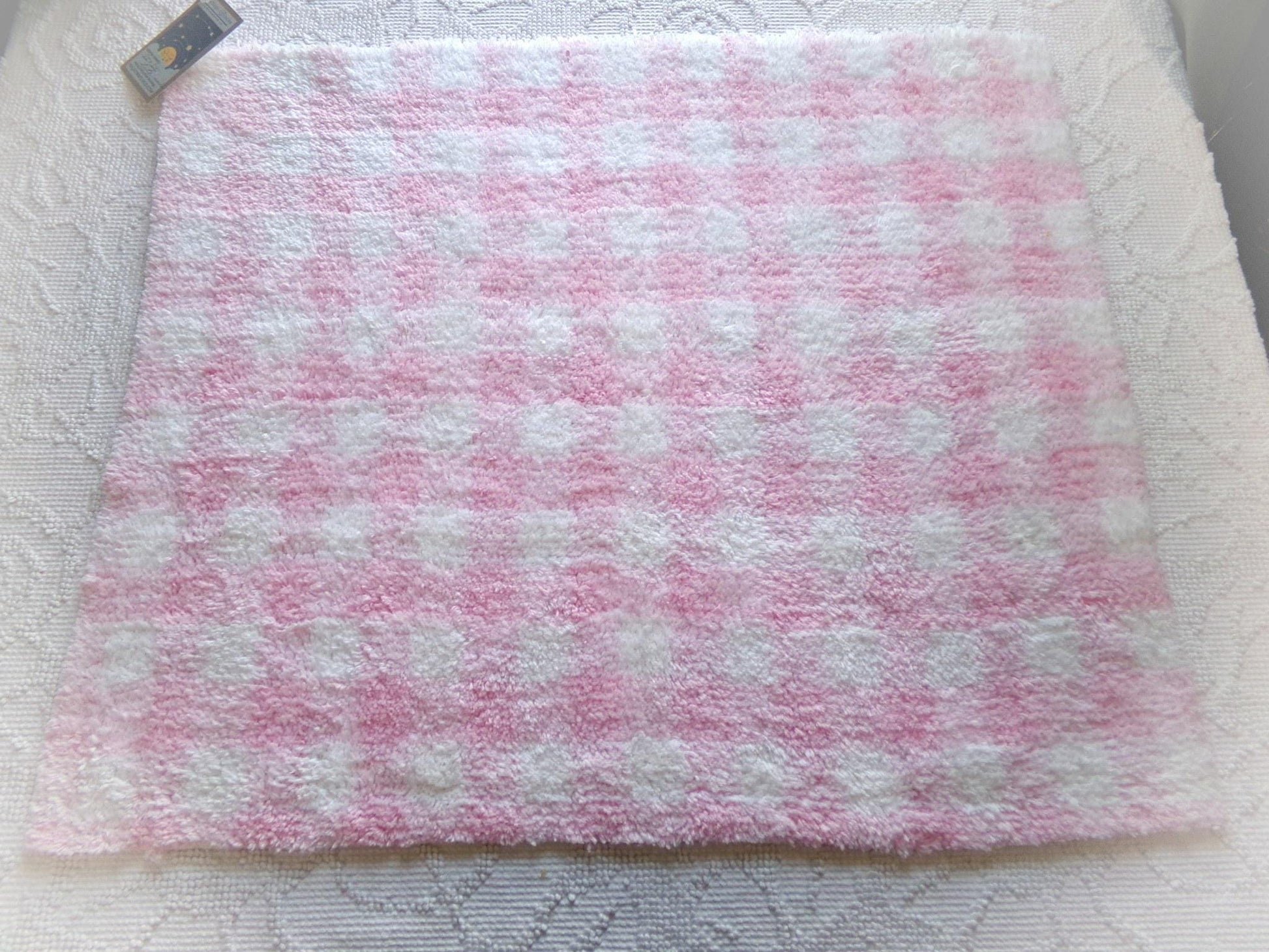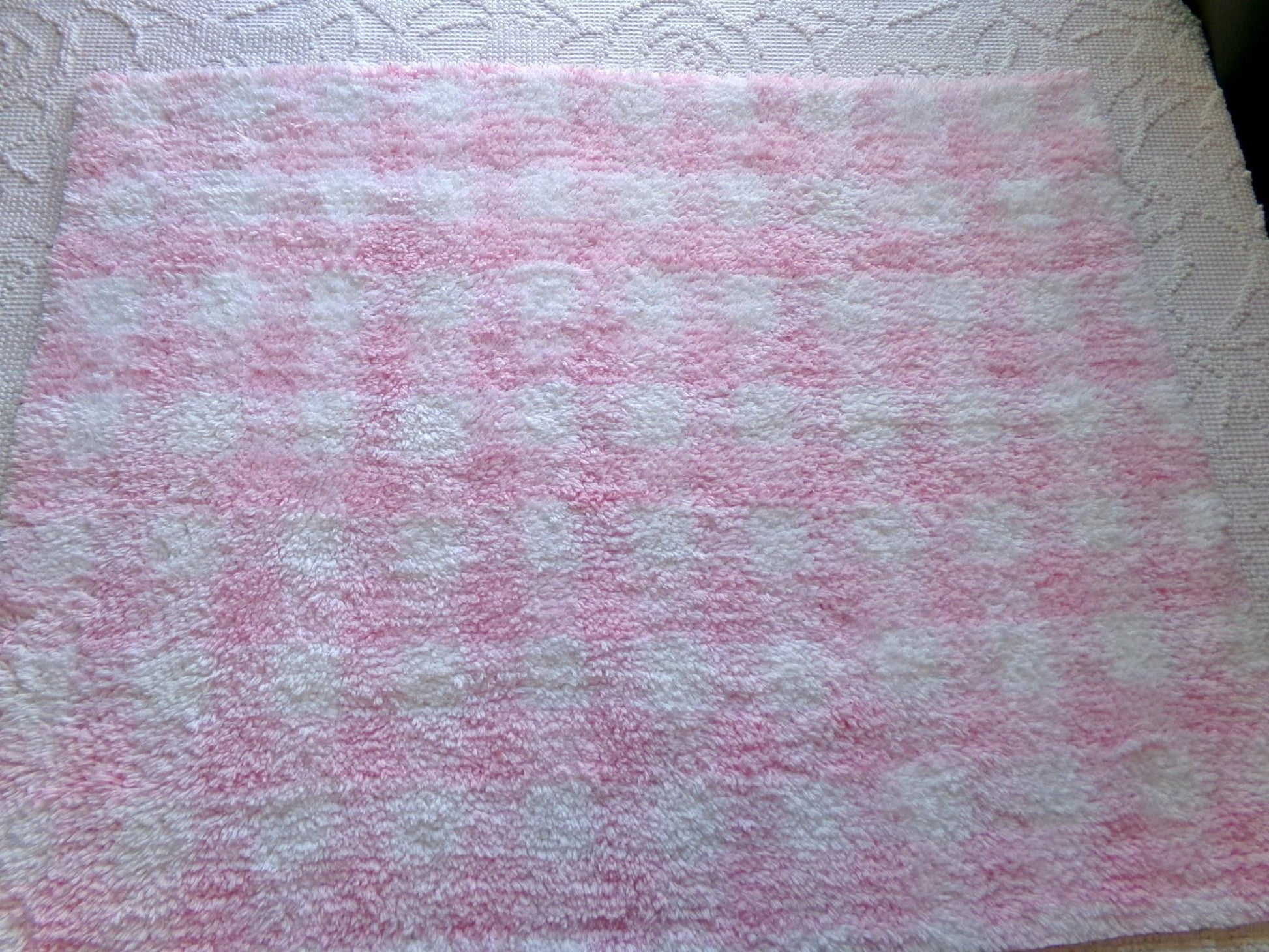 This is some of my favorite chenille fabric because it's just so pretty and snuggly soft. It features a wideset pink and white gingham pattern, thickly tufted and oh so cuddly.Piece measures about 18" x 24" inches. Chenille terry cotton blend. NOS original fabric from a hobby & craft store that closed in the 90s. This piece has some age marks from long-term storage, as seen final img.