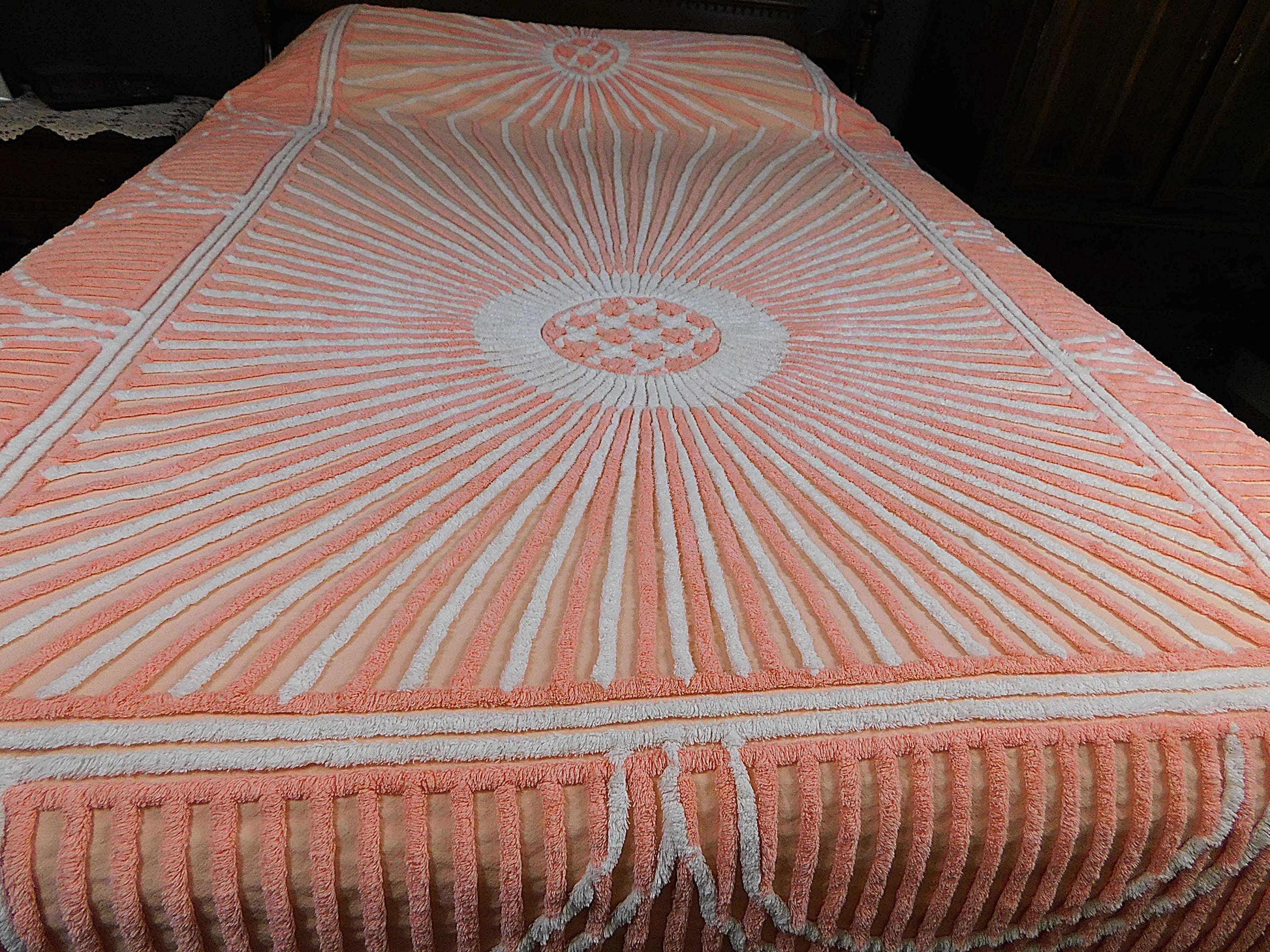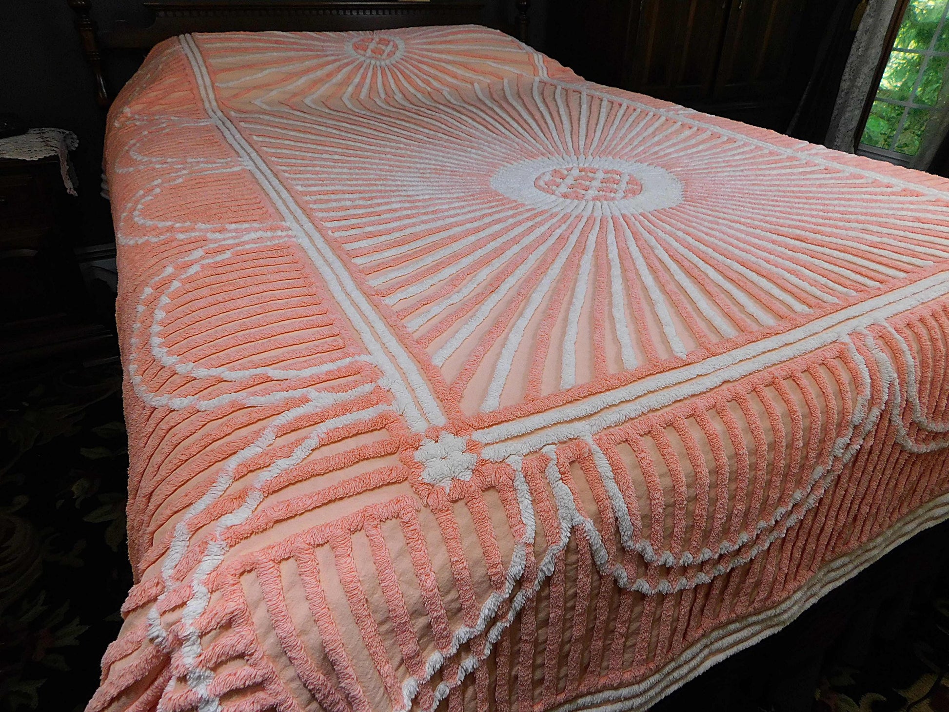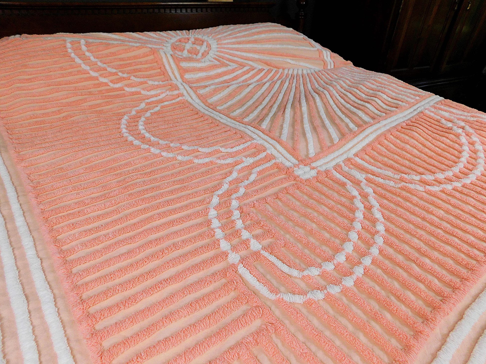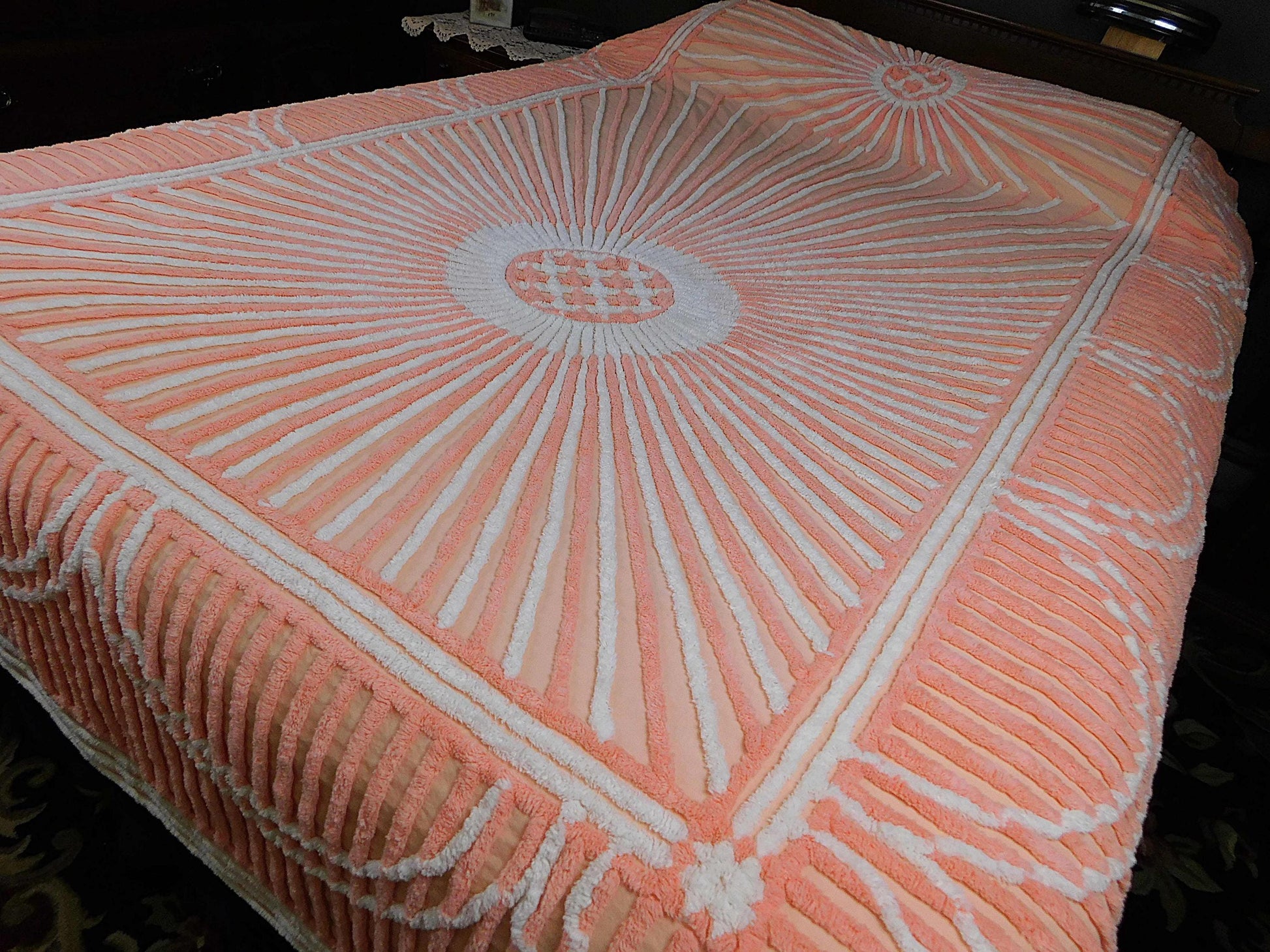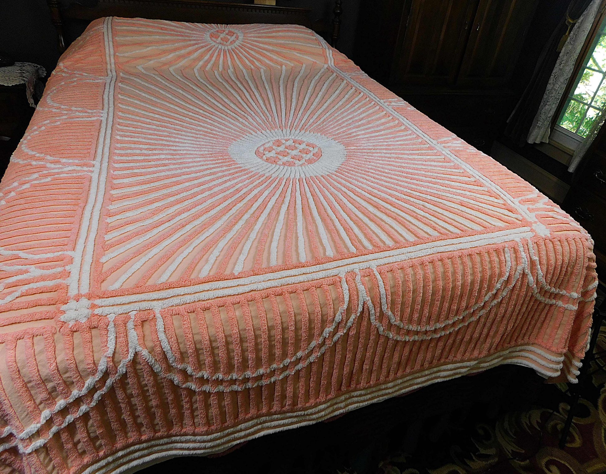 Add a burst of Midcentury Modern style to your bedroom with this spectacular starburst vintage full sized chenille bedspread. A radiating sun motif prominent at the center features an ultra plush design and rich colorway. Contrast shades of peach creamsicle and white create a captivating visual appeal.The radiant design on this chenille spread is loaded with lush, lux tufting. Measures approximately 88"W x 100"L, making it a standard full/double size. 100% cotton. An original vintage textile from the mid 1950s era.