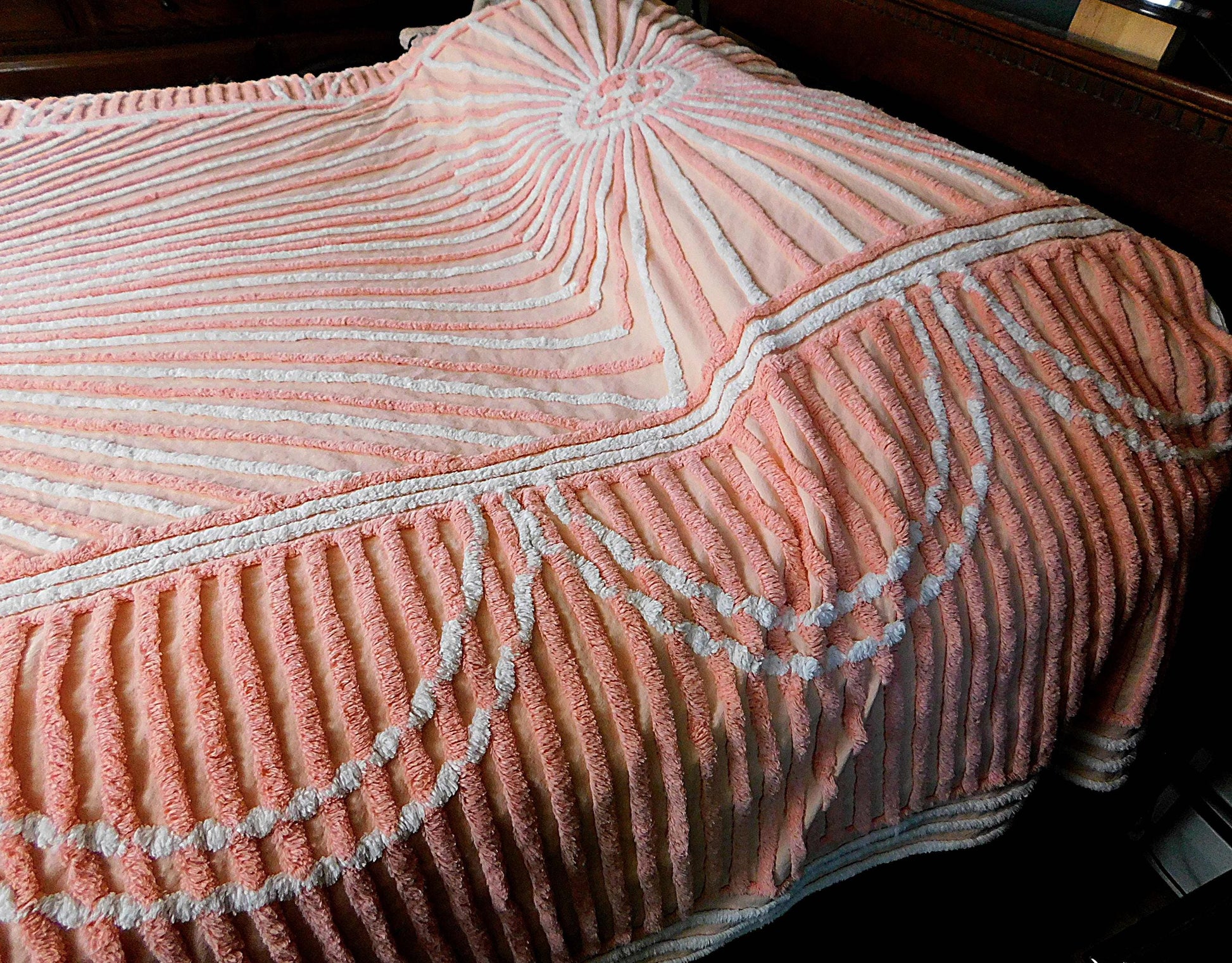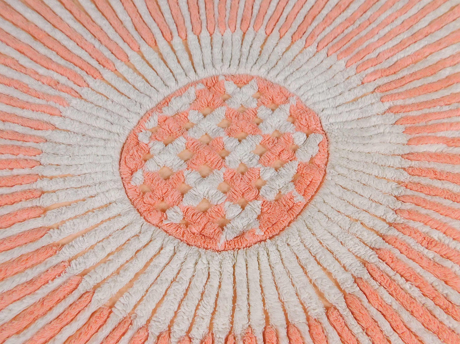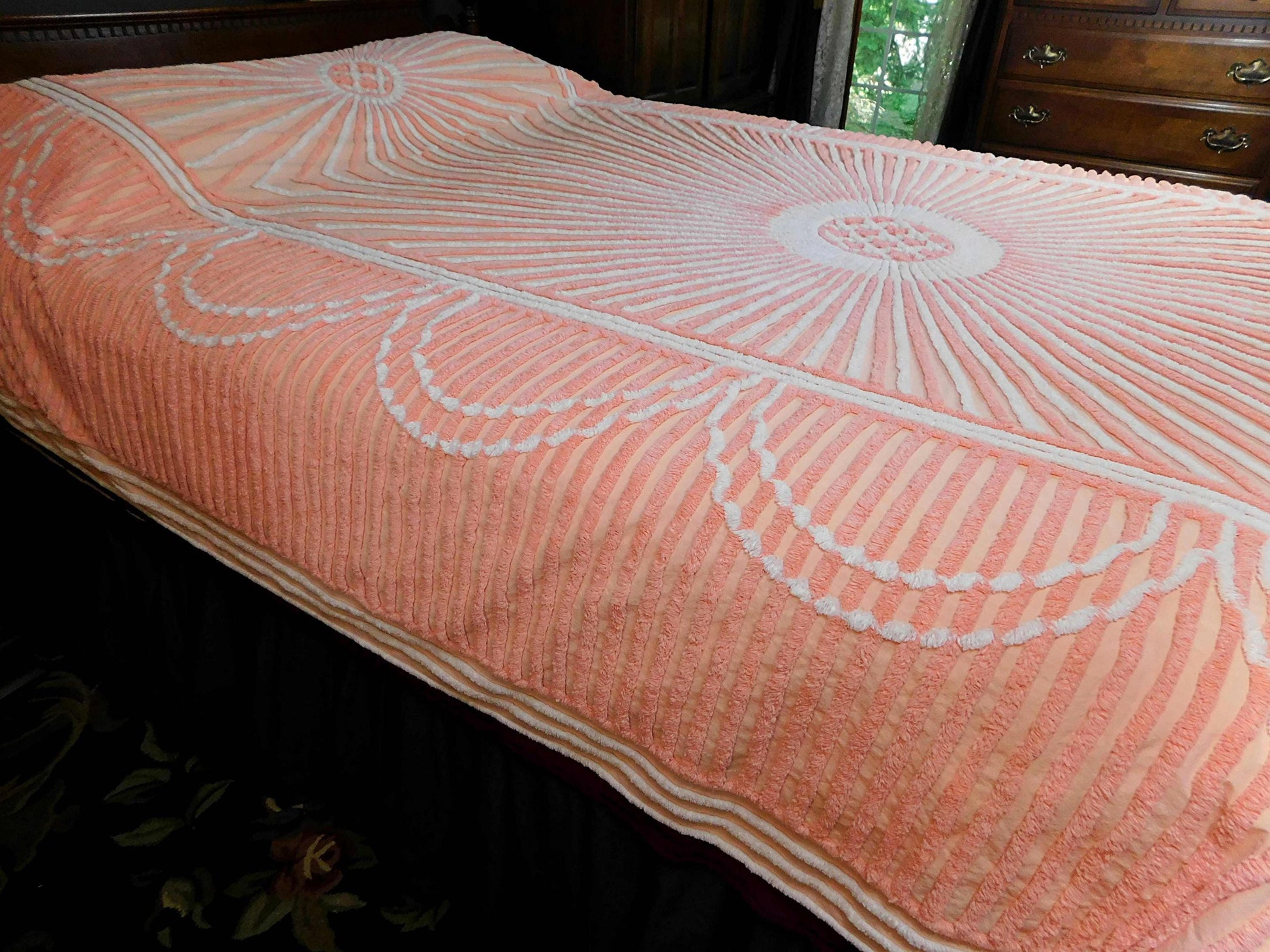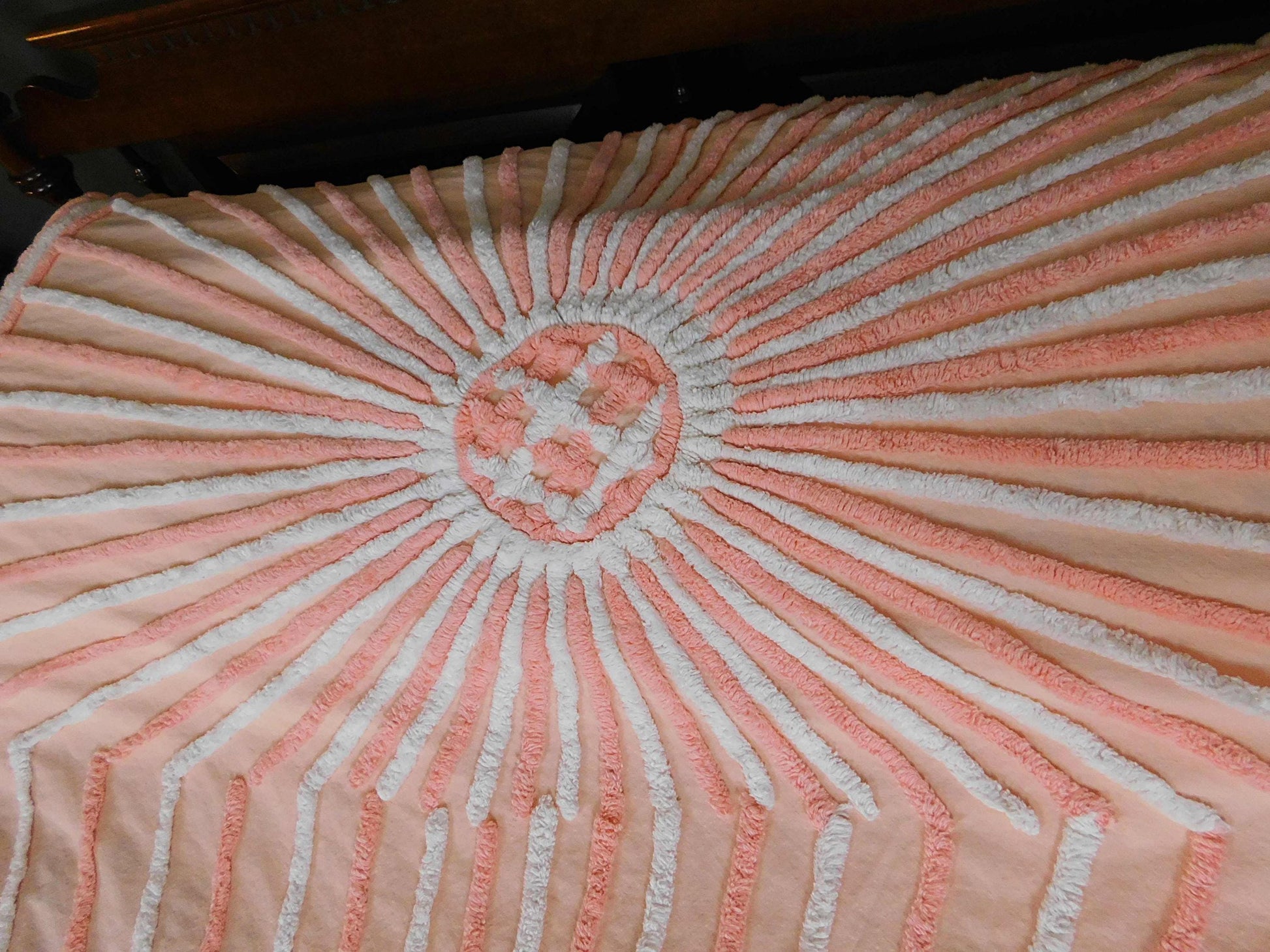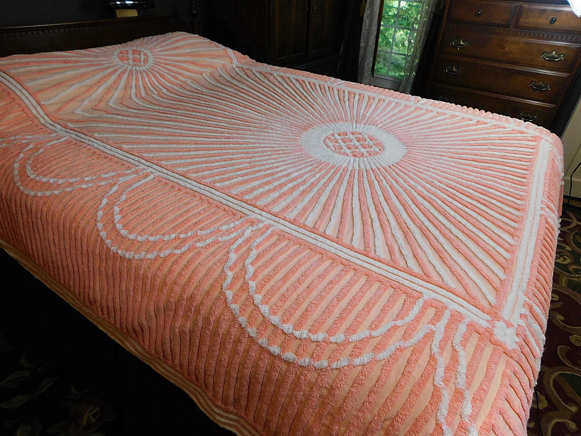 Add a burst of Midcentury Modern style to your bedroom with this spectacular starburst vintage full sized chenille bedspread. A radiating sun motif prominent at the center features an ultra plush design and rich colorway. Contrast shades of peach creamsicle and white create a captivating visual appeal.The radiant design on this chenille spread is loaded with lush, lux tufting. Measures approximately 88"W x 100"L, making it a standard full/double size. 100% cotton. An original vintage textile from the mid 1950s era.