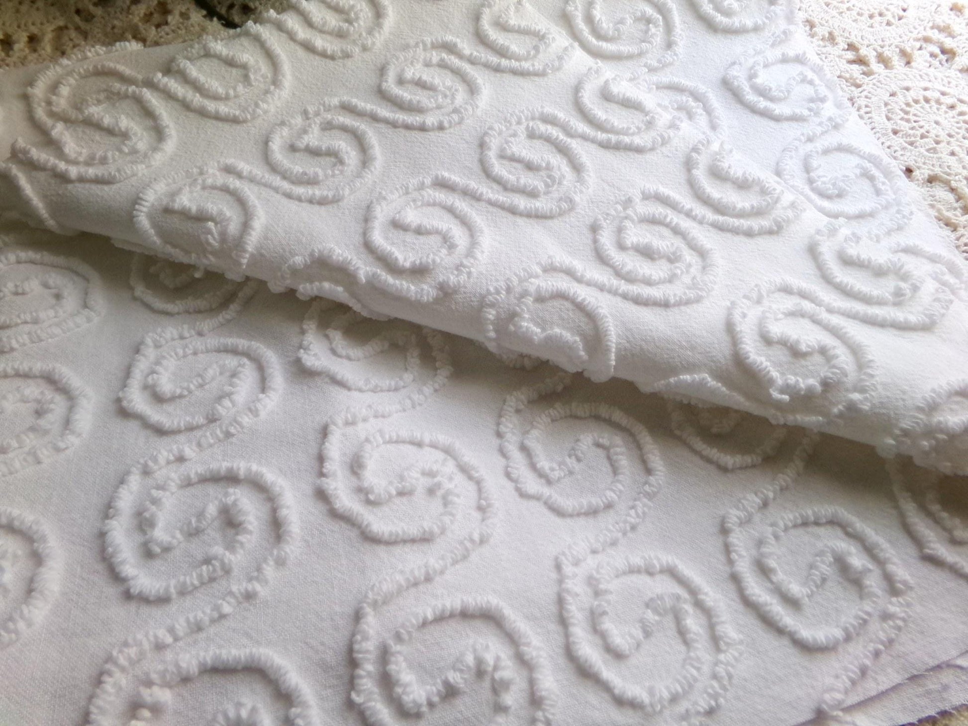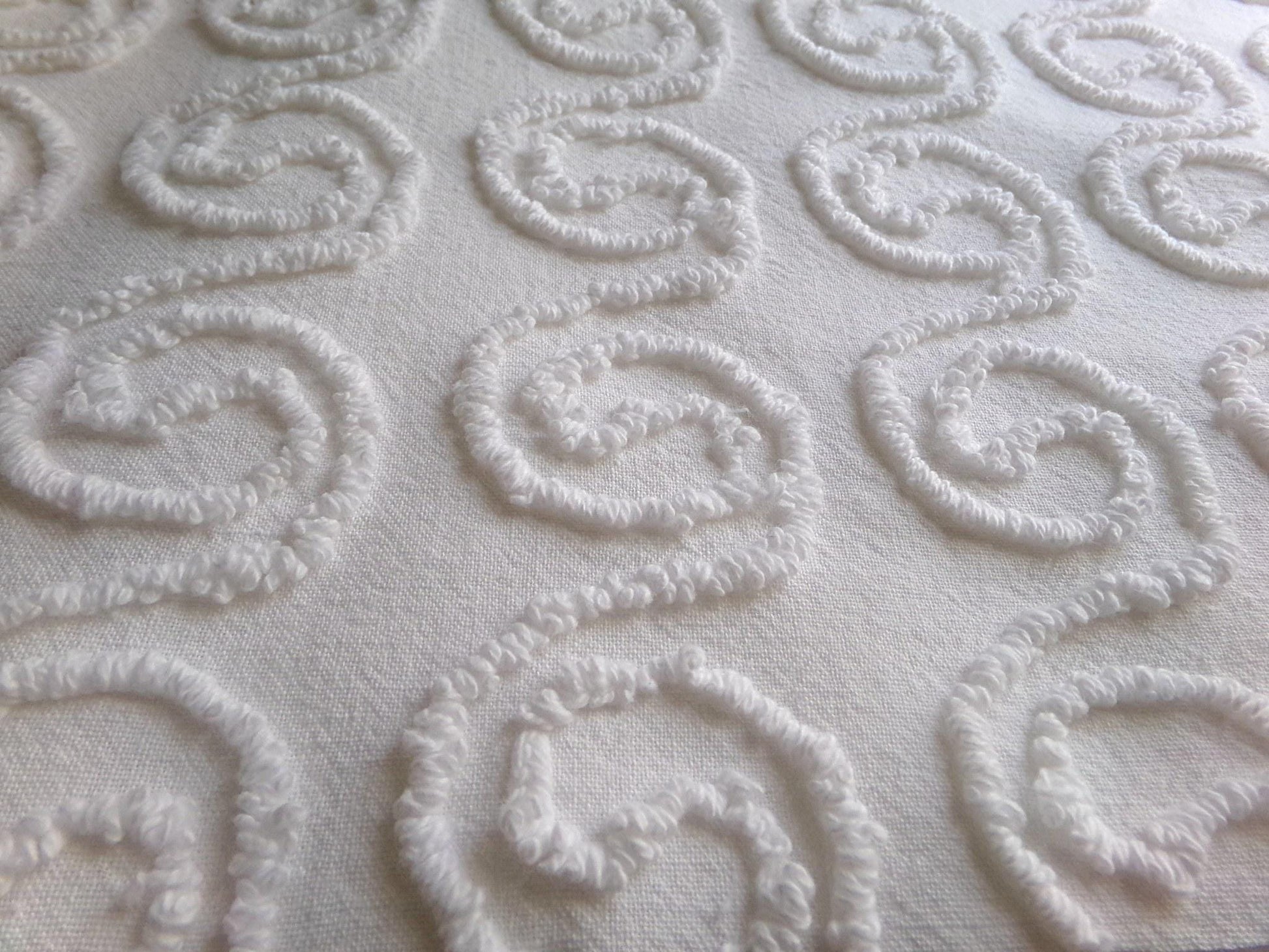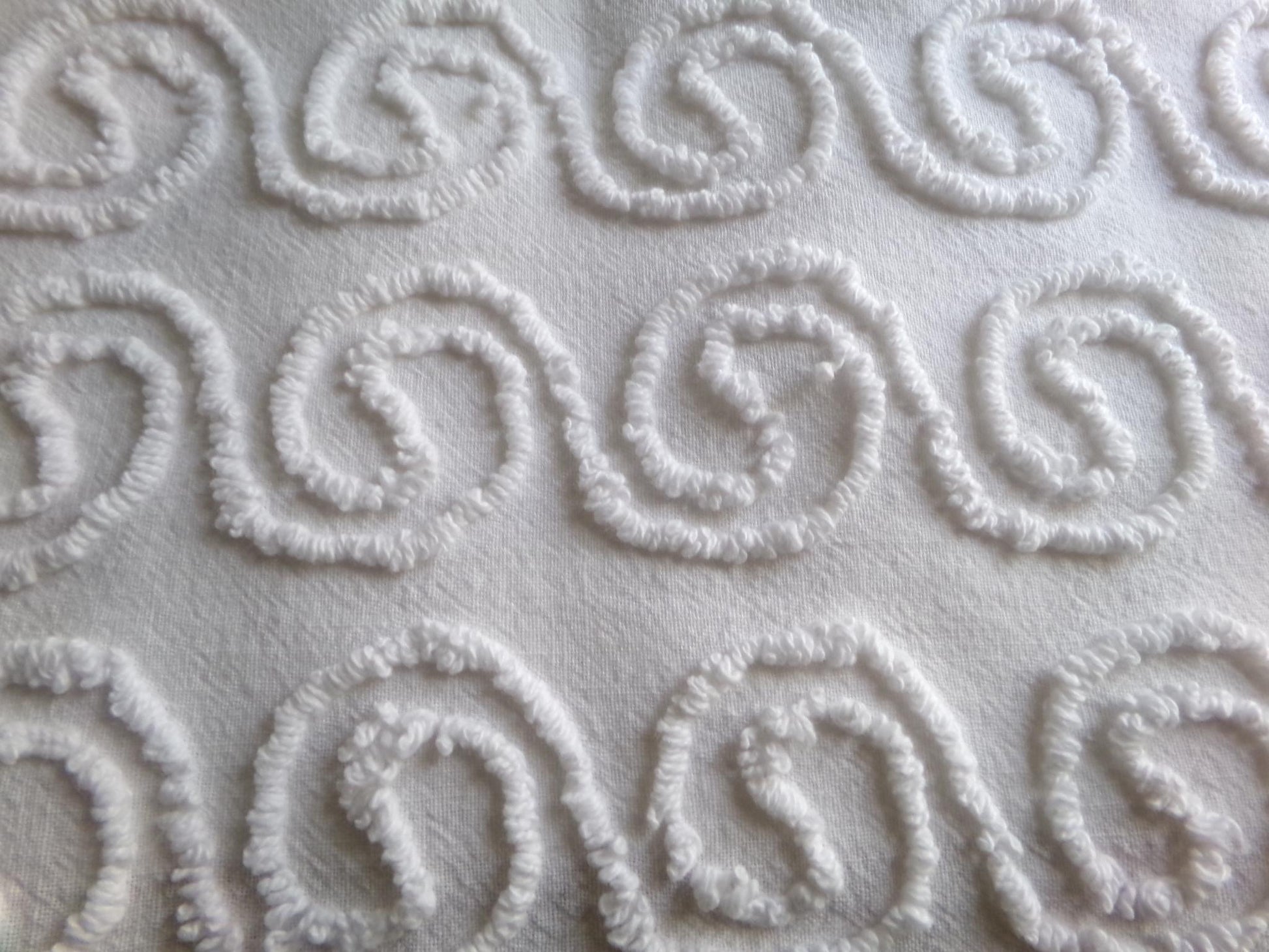 Aren't these just the cutest little spiral squiggles? This simple white on white vintage chenille fabric features a repeating pattern of spiraling curls which make a very memorable presentation in any design.100% cotton, very thin/lightweight. Measures approx 20" x 24" inches. Sourced from a 1960s vintage Cabin Craft chenille bedspread.