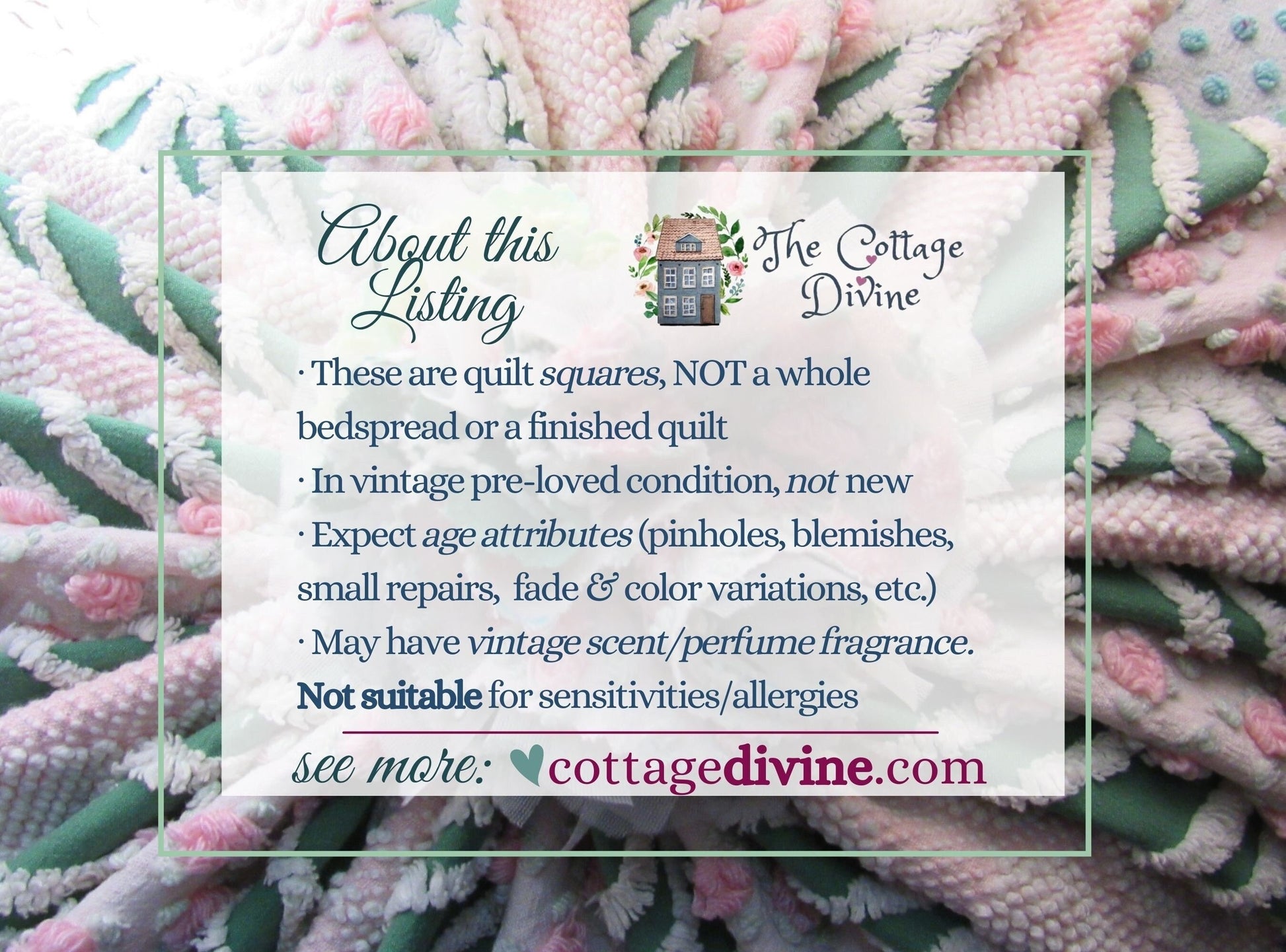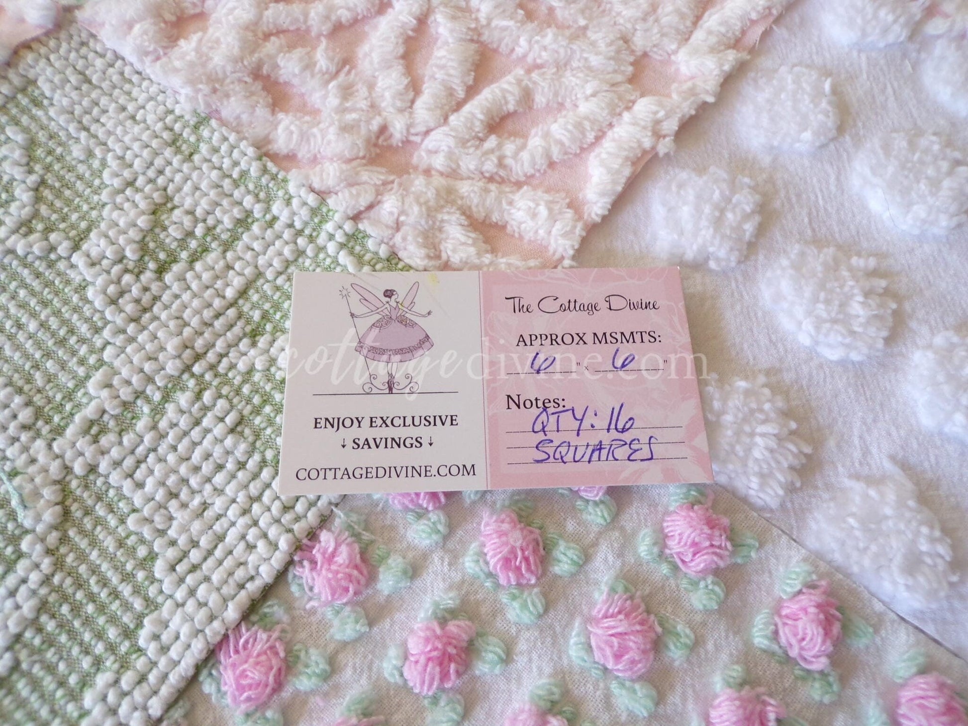 Spring Blossoms, a beautiful assorted mix of 16 vintage chenille quilt squares from The Cottage Divine..::total qty: 16 individual chenille quilt squares::size: 6" x 6" rotary cut