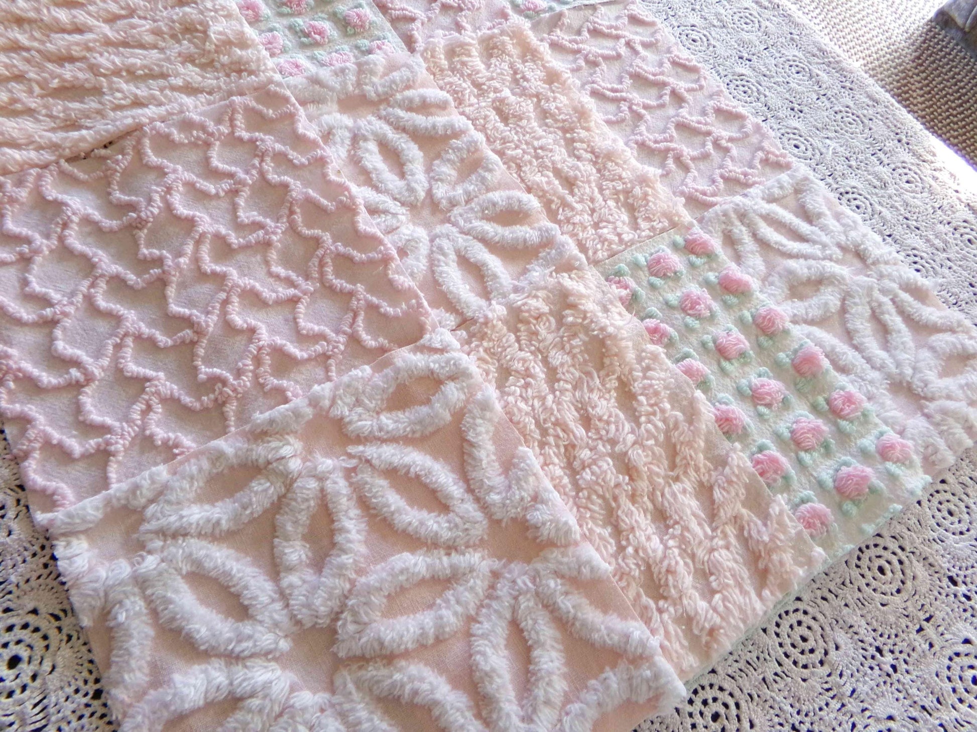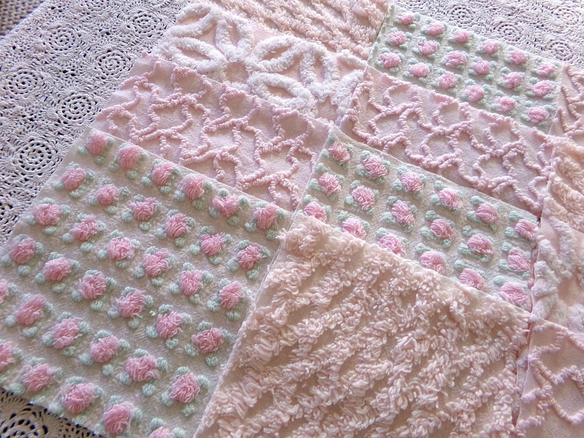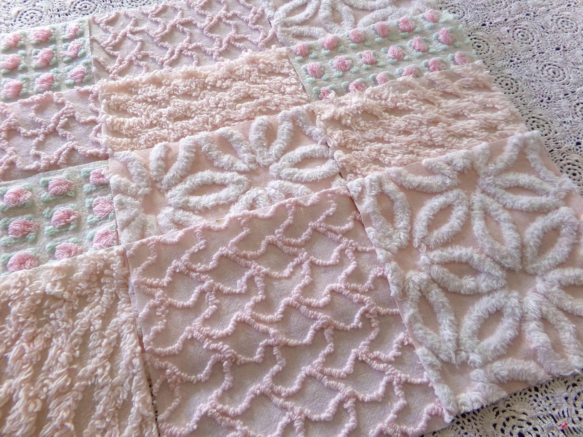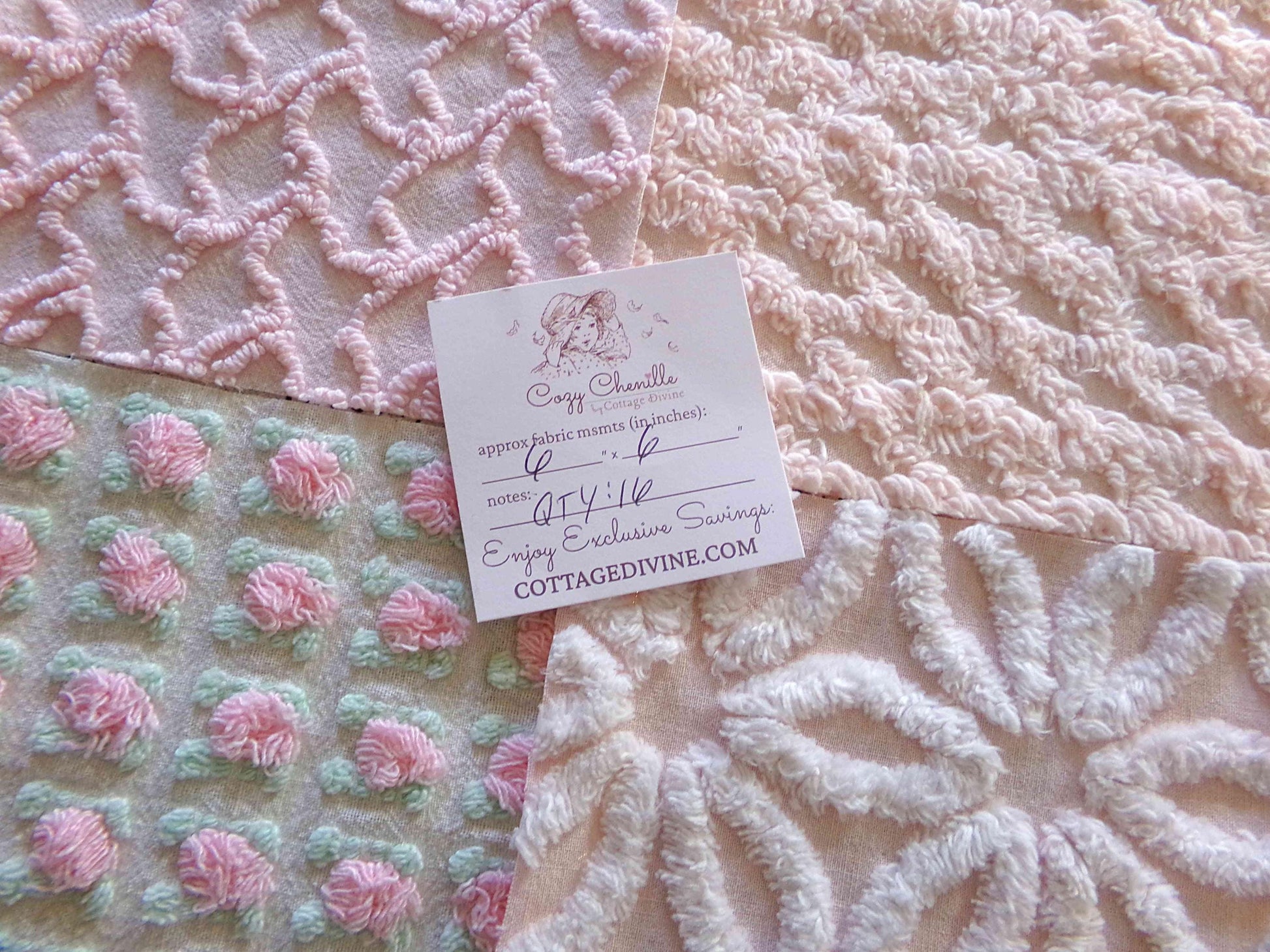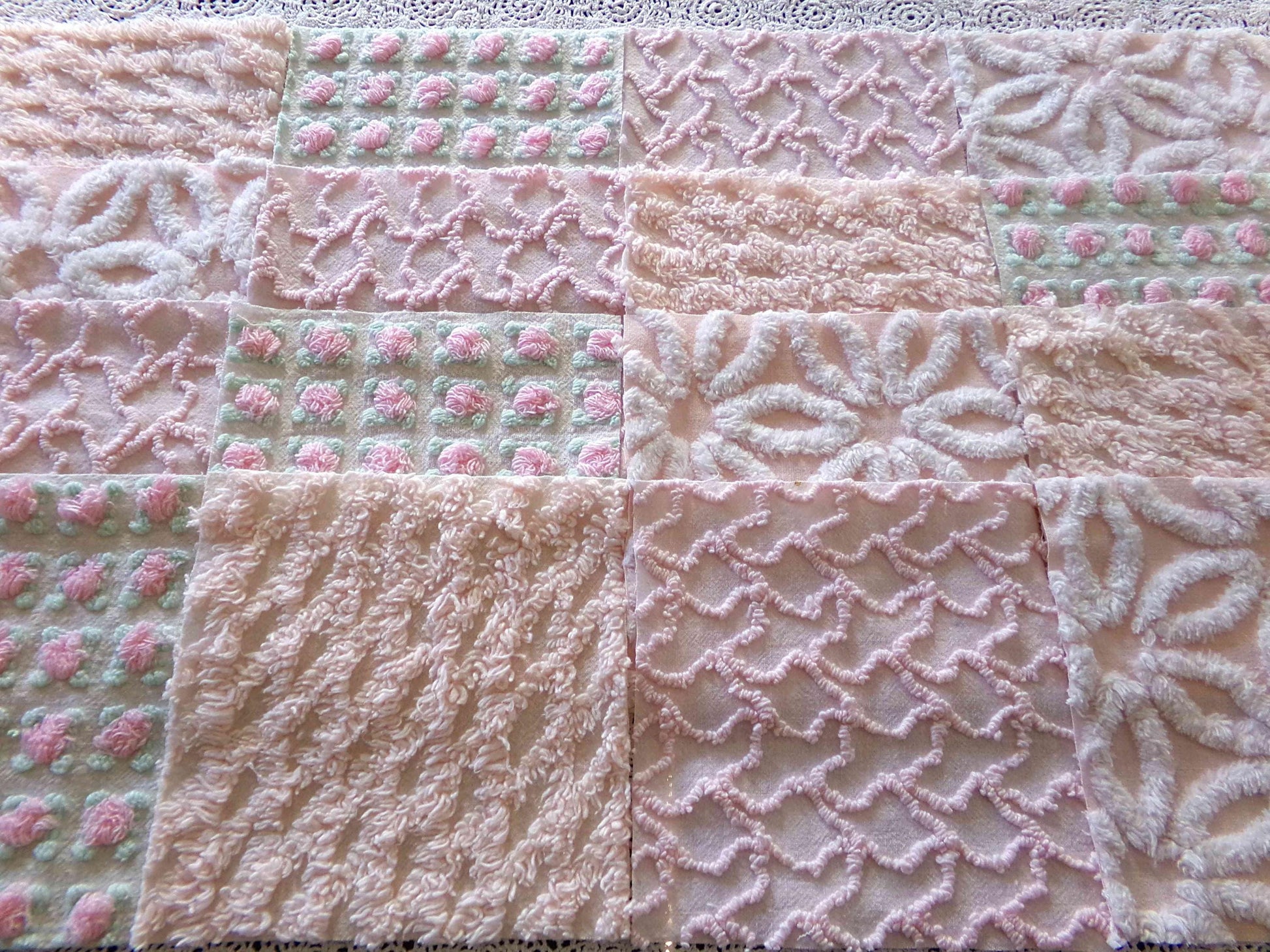 Ever so pretty, this is a set of 16 vintage chenille fabric squares in soothing shades of peach, pink & white. The peach diamond lattice squares uplift the entire set by offering a gentle "glow" that creates a radiant look.This selection includes 4 of each of the following patterns: pink & white daisy, pink rosebud, pink squiggle & peach lattice.
