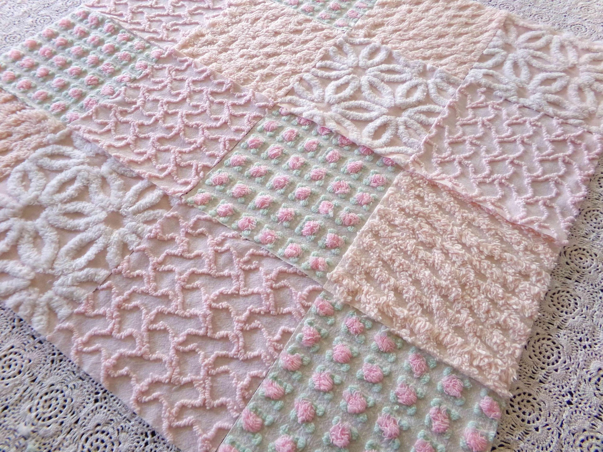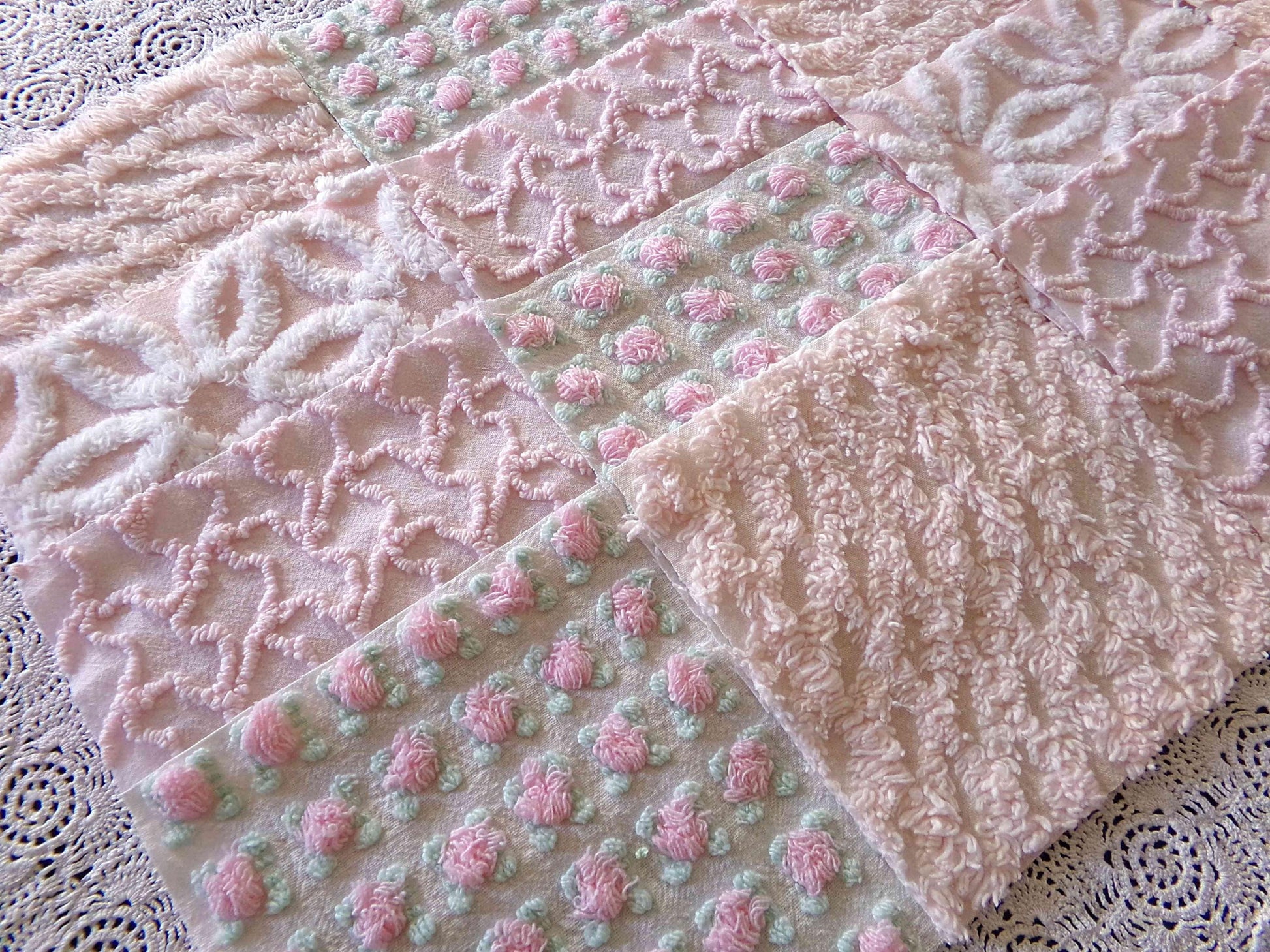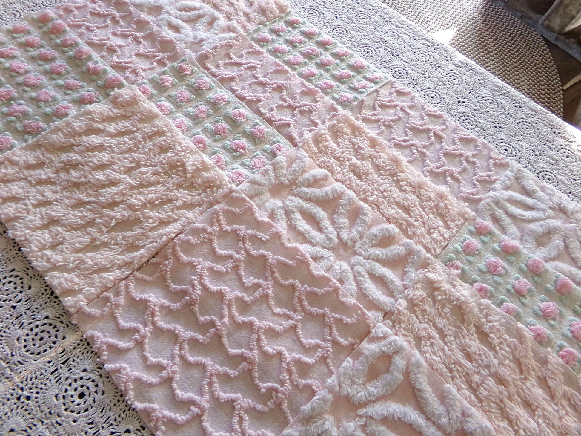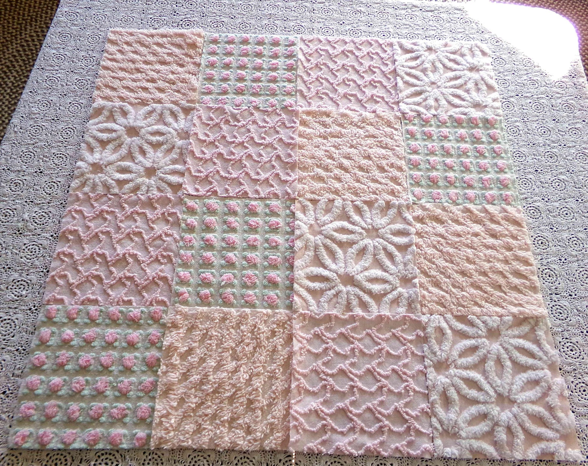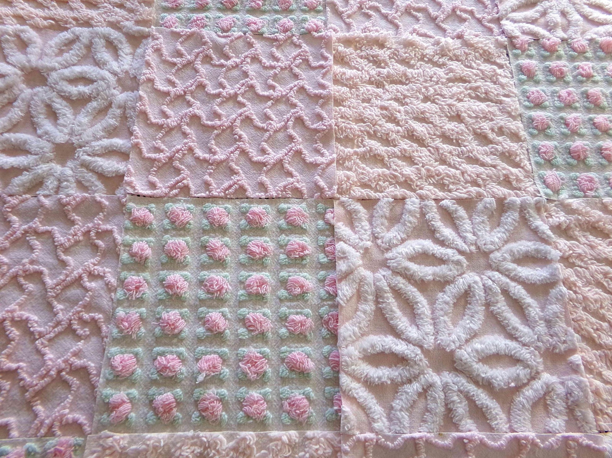 Ever so pretty, this is a set of 16 vintage chenille fabric squares in soothing shades of peach, pink & white. The peach diamond lattice squares uplift the entire set by offering a gentle "glow" that creates a radiant look.This selection includes 4 of each of the following patterns: pink & white daisy, pink rosebud, pink squiggle & peach lattice.