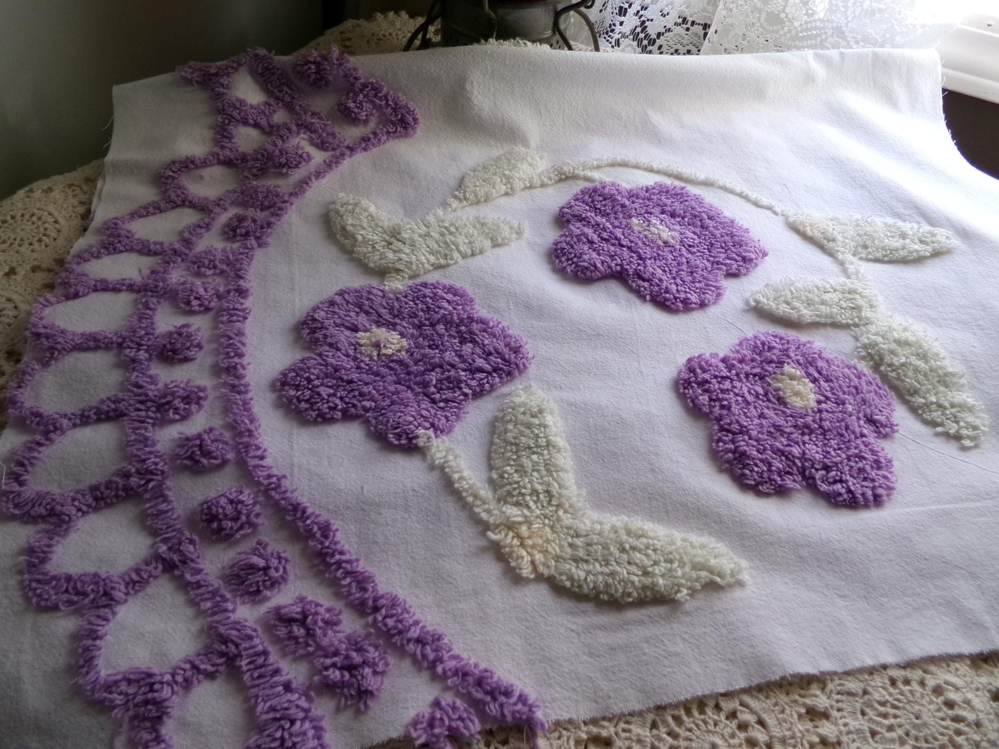 Add some sweet 'n shabby spring charm to your project with this vintage style chenille fabric piece, featuring a pair of lilac floral wreaths situated on a white bkgd. Accented by lavender chenille tufting that resembles ruffles.Measures 20" x 28" inches. Lightweight cotton chenille with plush tufting. Few shabby attributes such as a minor pinhole.