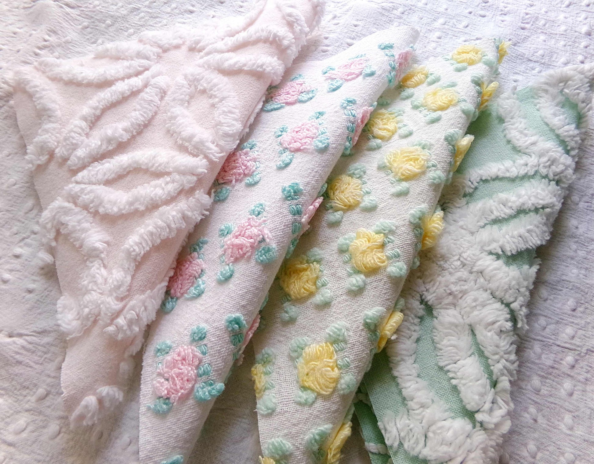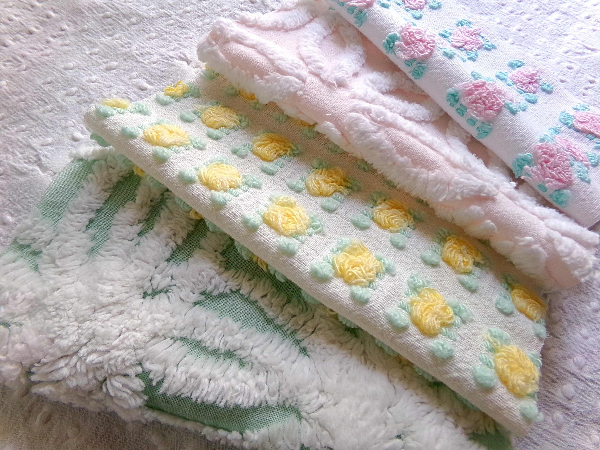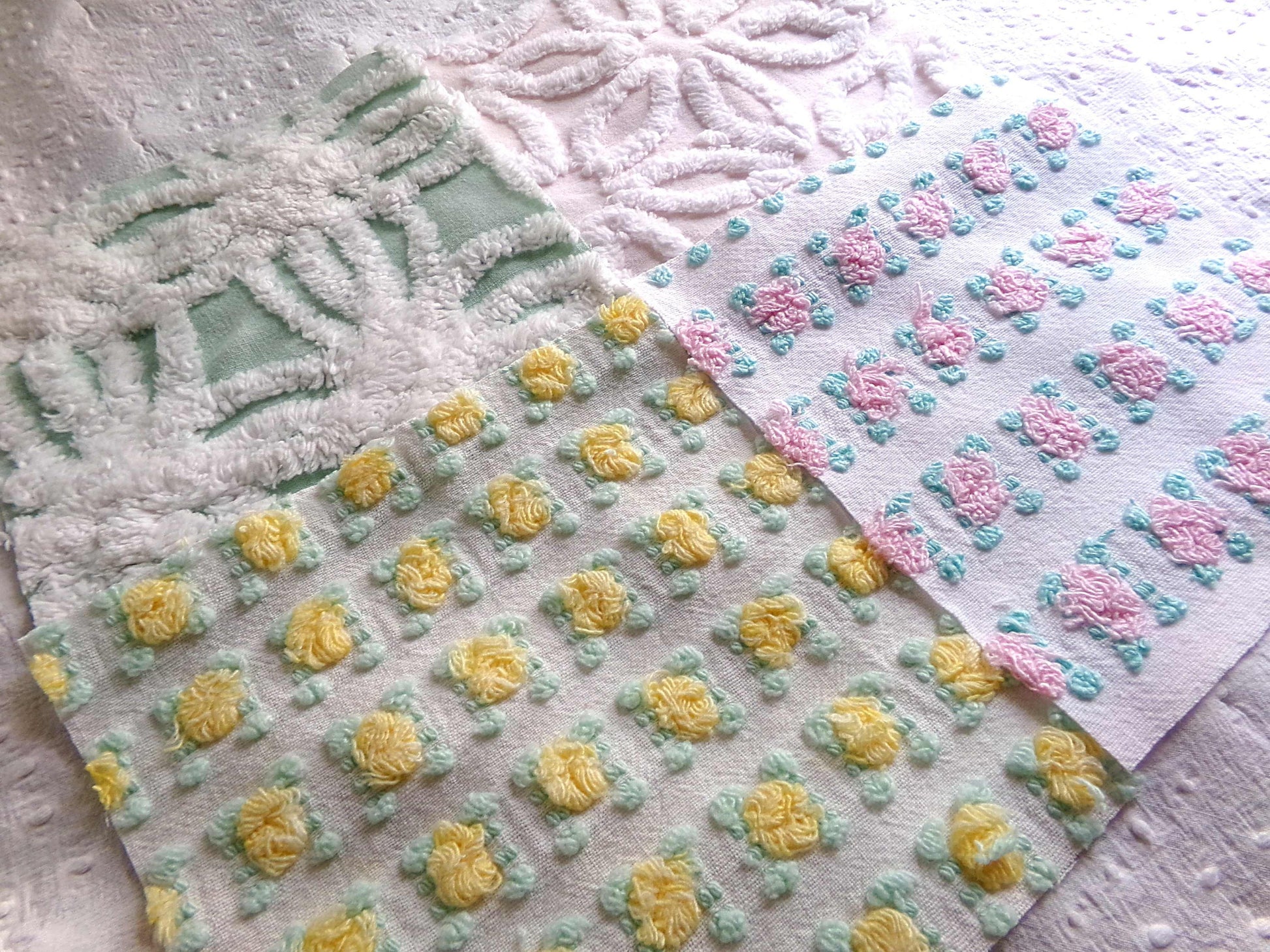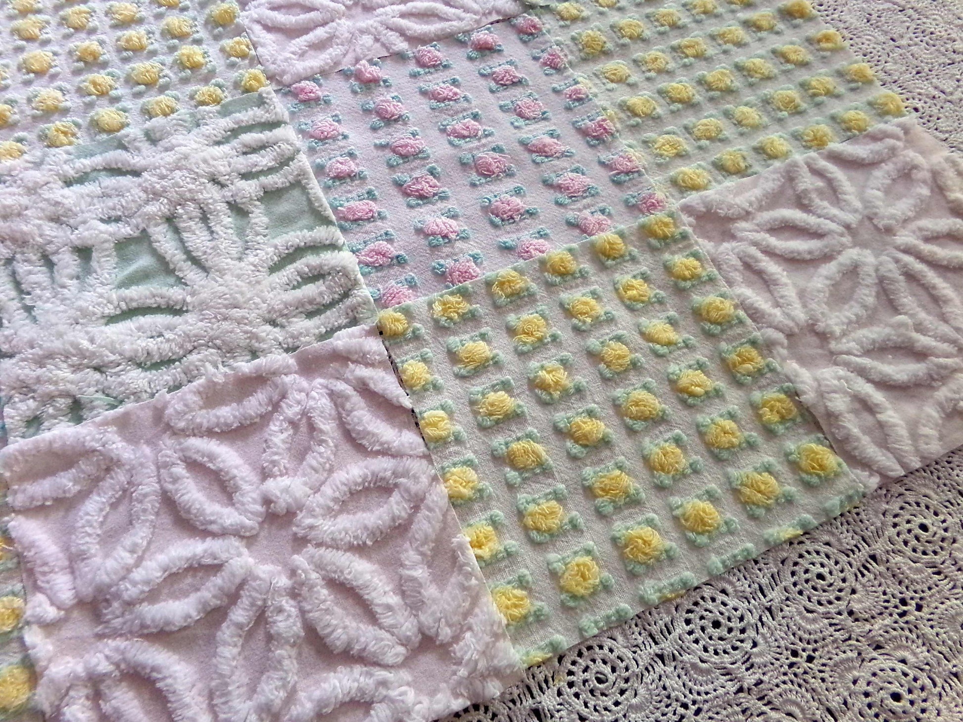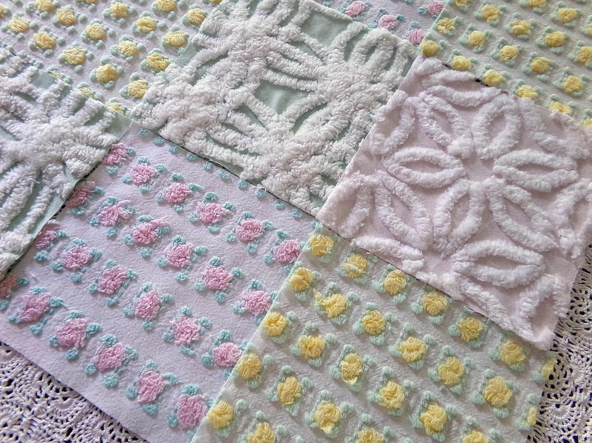 This pretty set of vintage chenille fabric squares offers a spring medley of pink, white, yellow & mint green...you'll receive a total of 16 separate, rotary cut quilt squares measuring 6" x 6" inches each.4 each of: petal pink rosebuds, lemon yellow rosebuds, plush white & mint green, white daisy on pastel pink