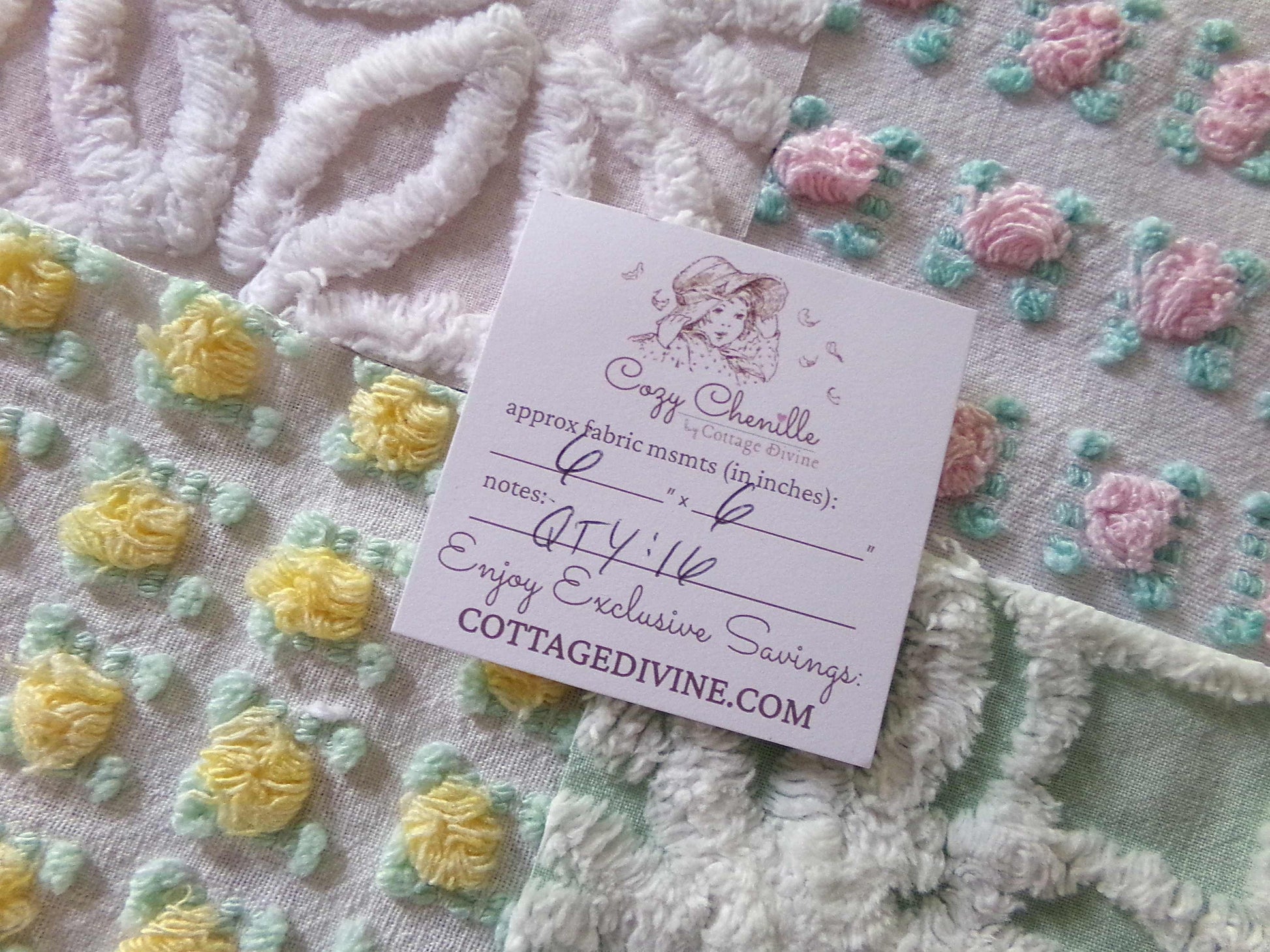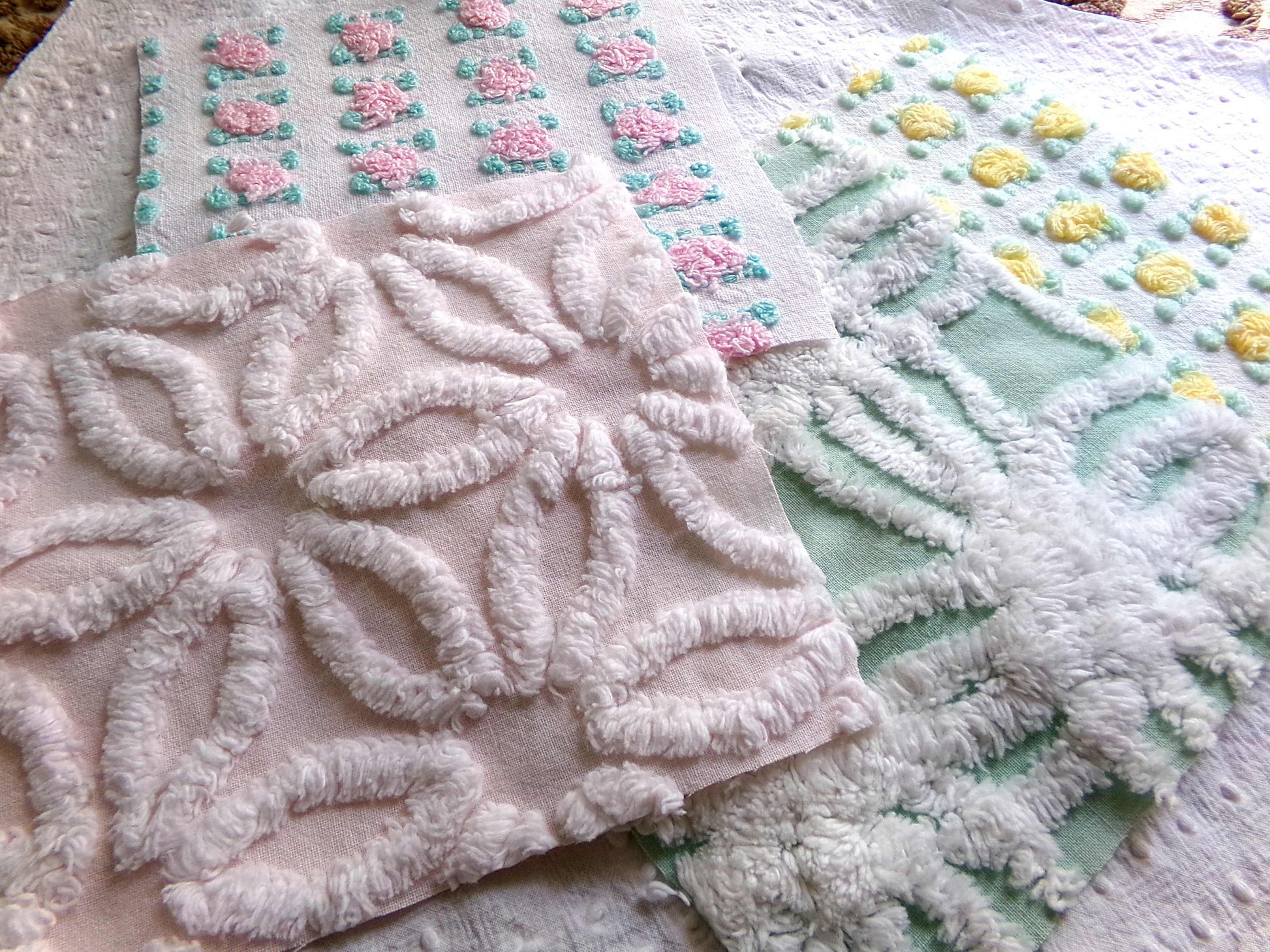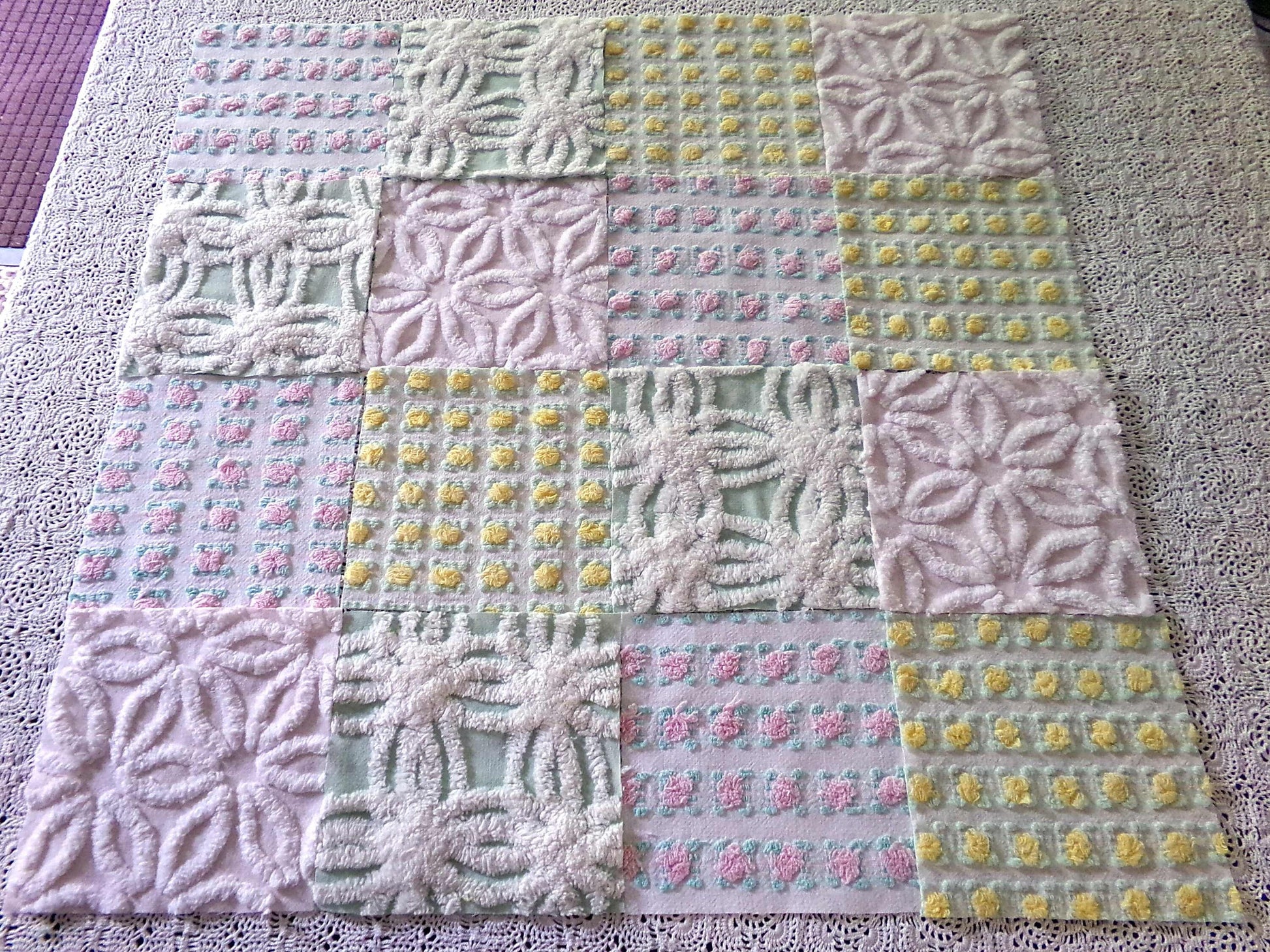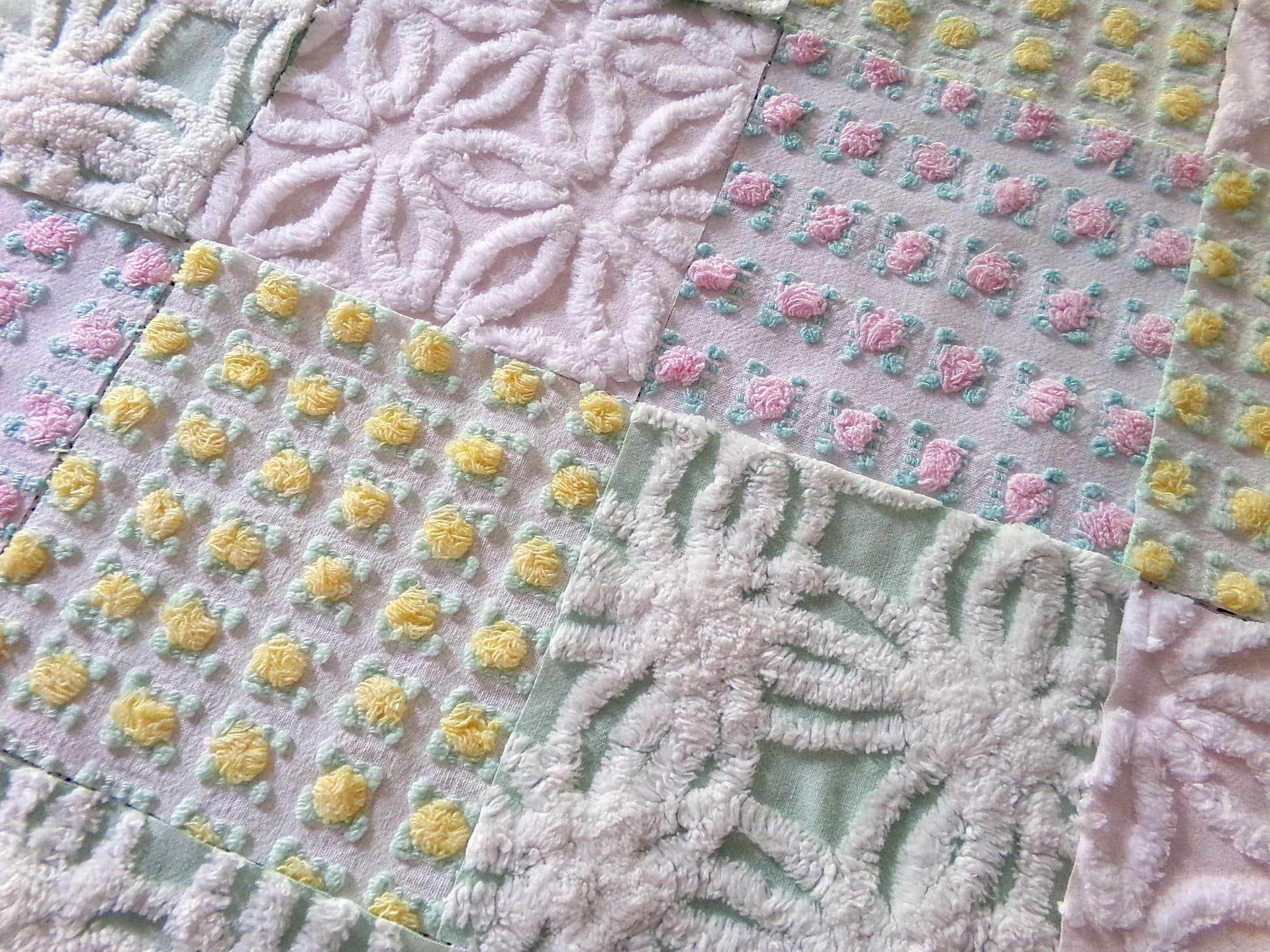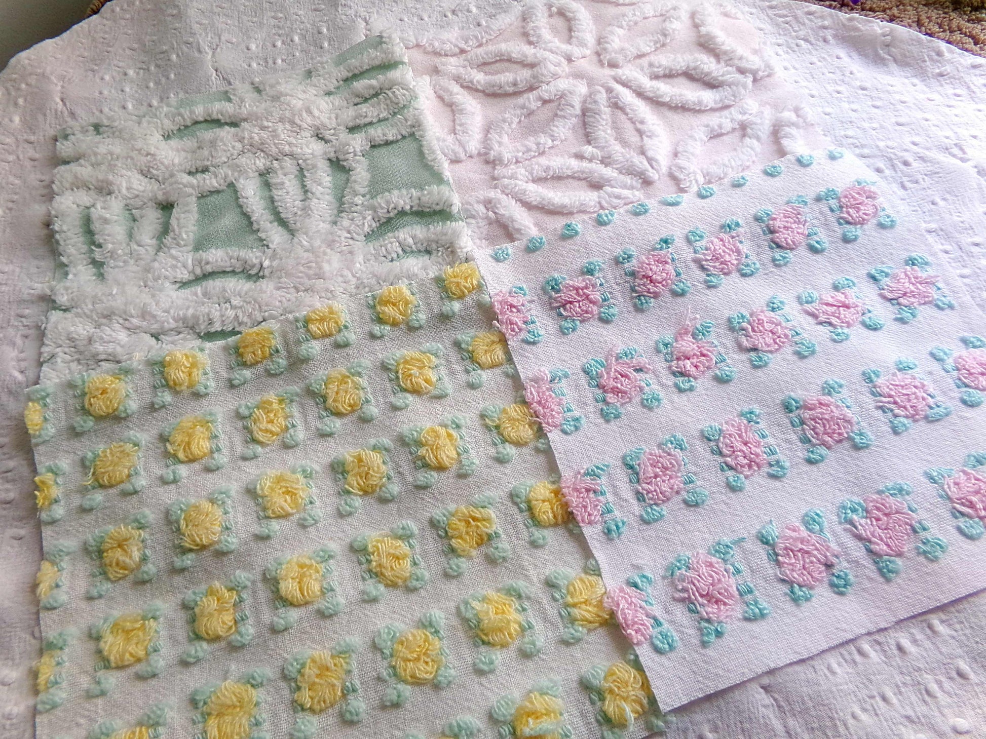 This pretty set of vintage chenille fabric squares offers a spring medley of pink, white, yellow & mint green...you'll receive a total of 16 separate, rotary cut quilt squares measuring 6" x 6" inches each.4 each of: petal pink rosebuds, lemon yellow rosebuds, plush white & mint green, white daisy on pastel pink