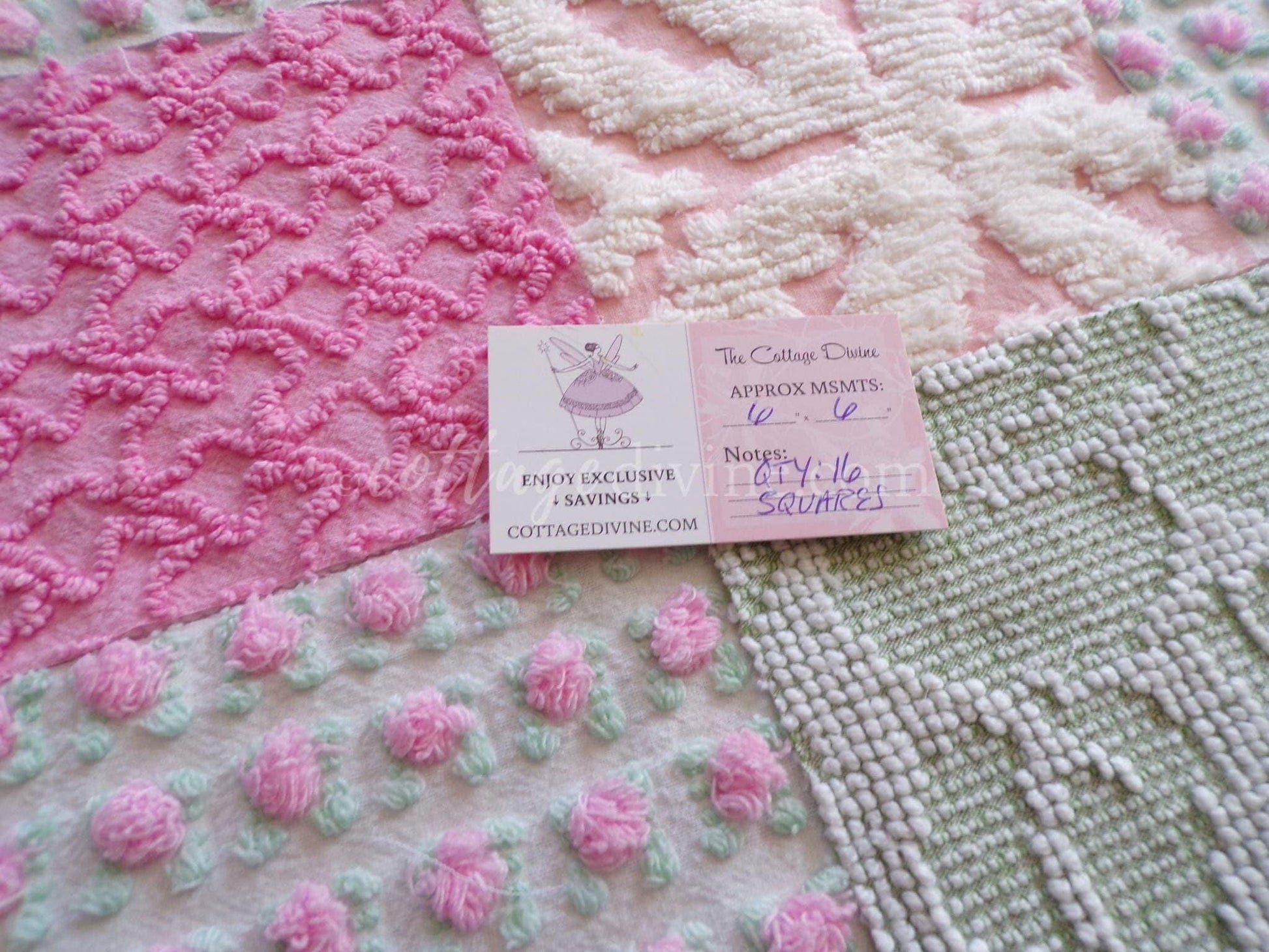 Spring Medley, a beautiful assorted mix of 16 vintage chenille quilt squares from The Cottage Divine..::total qty: 16 individual chenille quilt squares::size: 6" x 6" rotary cut