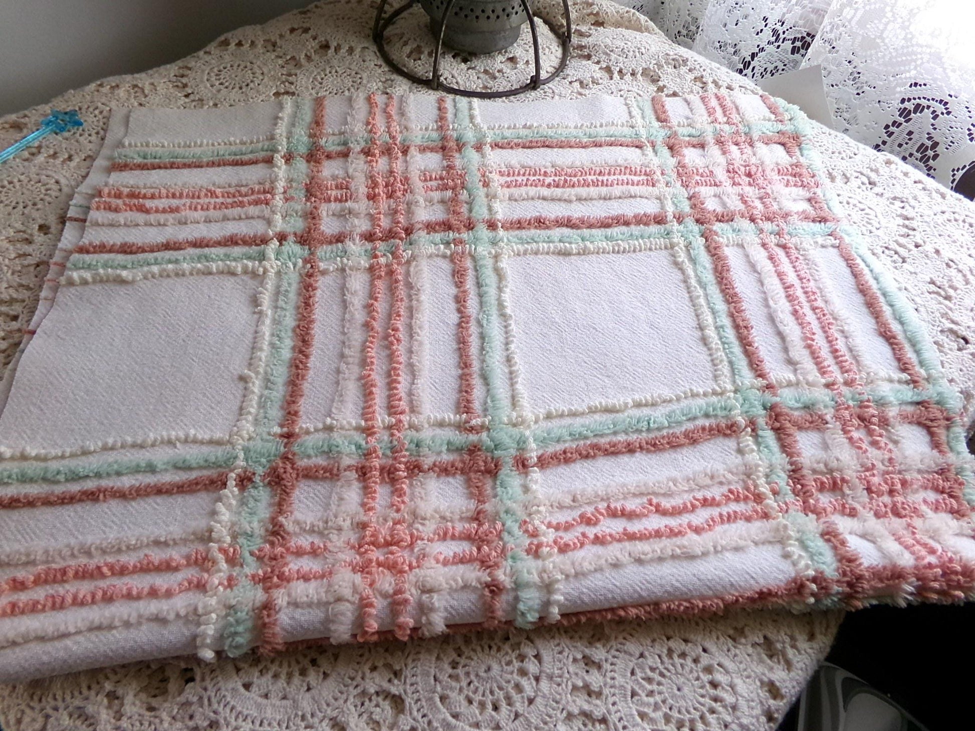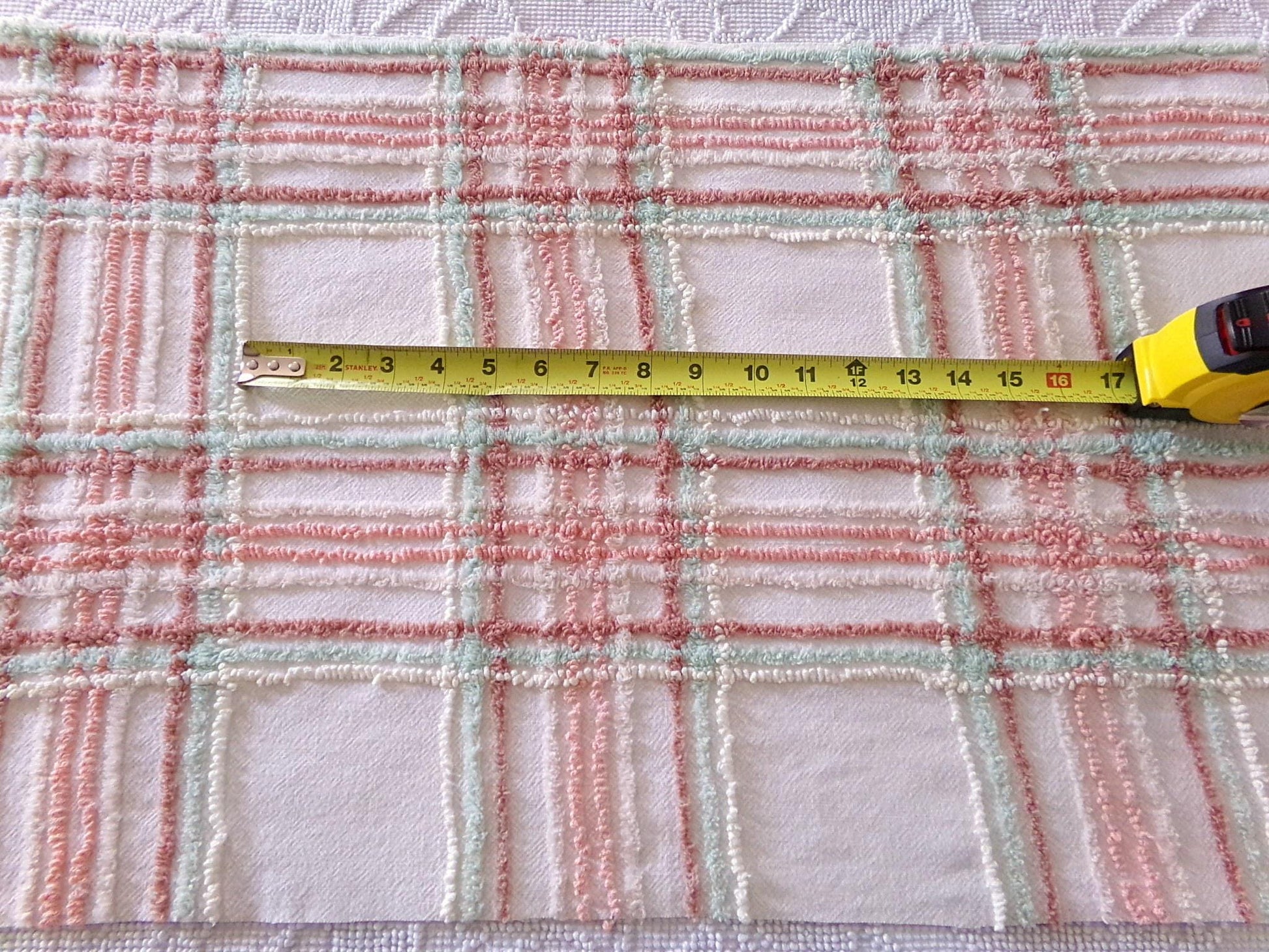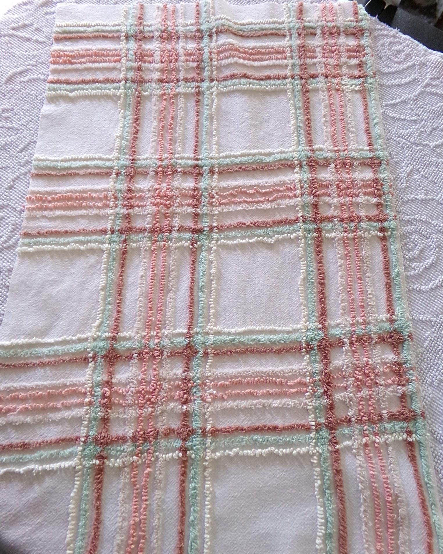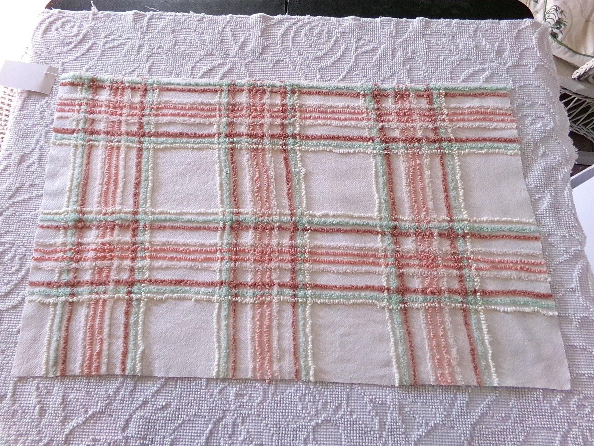 Love the simple, old-fashioned country picnic look of this great fabric. Skinny needletufted chenille lines form a wideset plaid pattern, in warm springy tones set on a creamy off white.Measures approx 17" x 27" inches. 100% cotton with lovely needletufting. Original to the 1950s era in a Cabin Crafts design. You may spot a few lite marks & tuft pulls, common to the fabric.