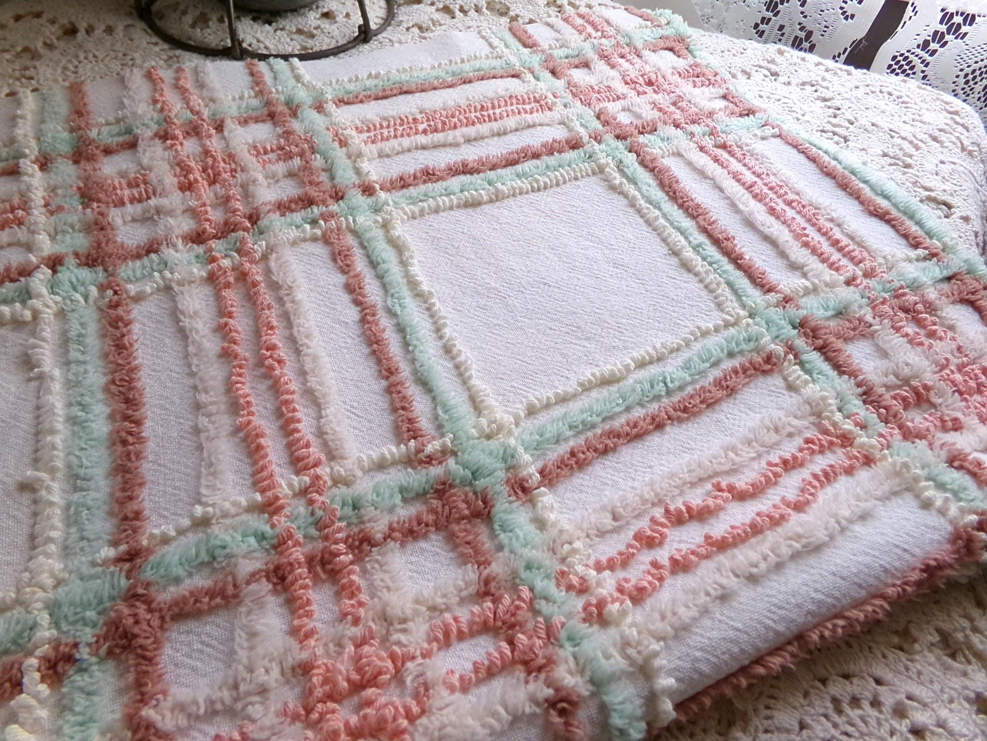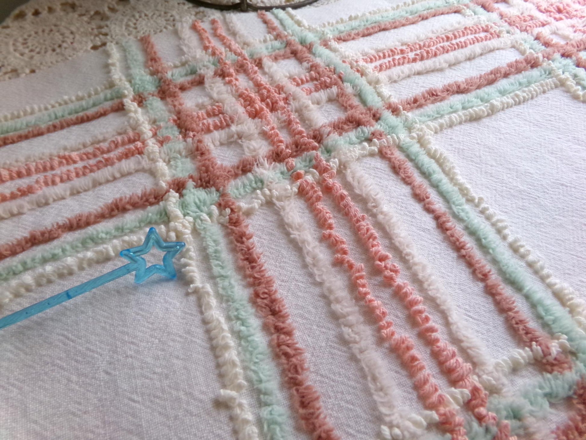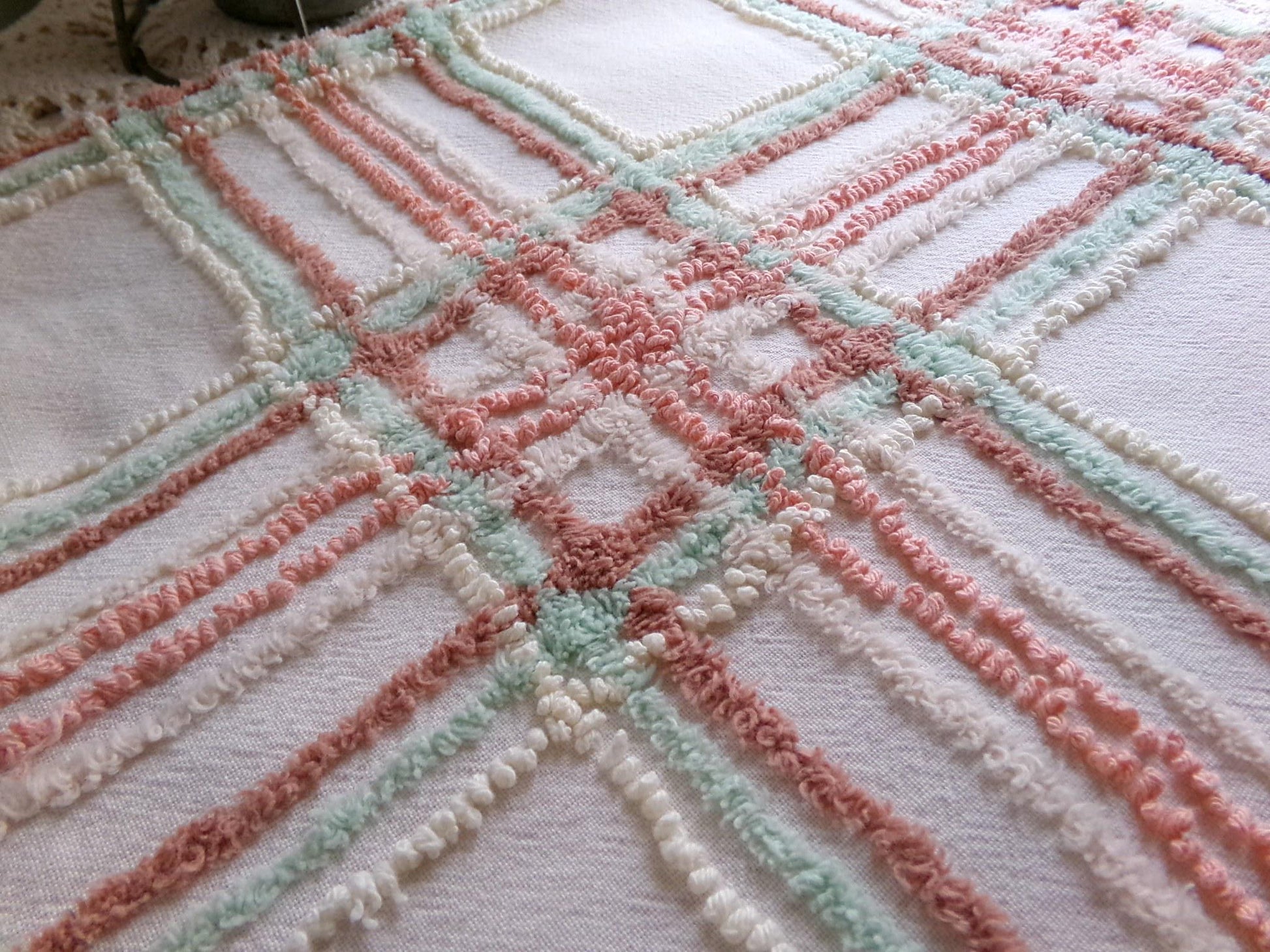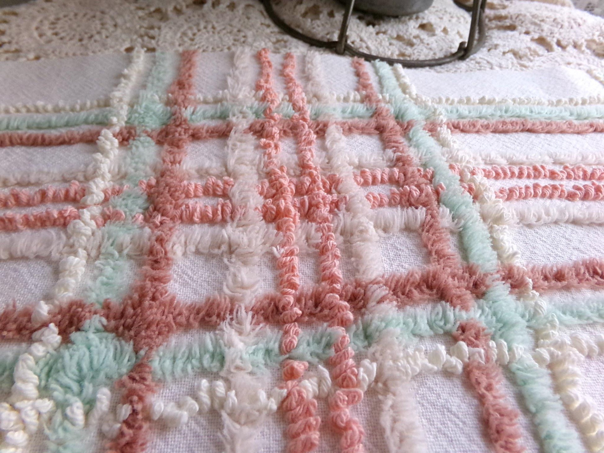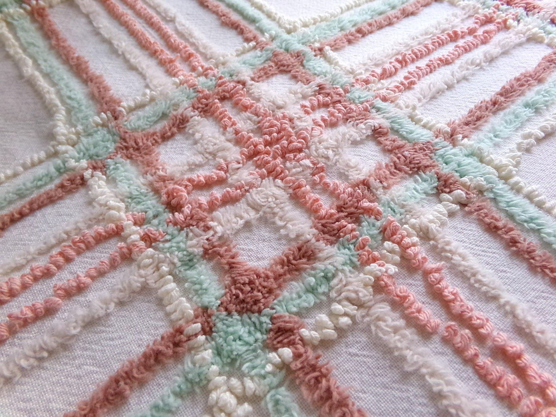 Love the simple, old-fashioned country picnic look of this great fabric. Skinny needletufted chenille lines form a wideset plaid pattern, in warm springy tones set on a creamy off white.Measures approx 17" x 27" inches. 100% cotton with lovely needletufting. Original to the 1950s era in a Cabin Crafts design. You may spot a few lite marks & tuft pulls, common to the fabric.