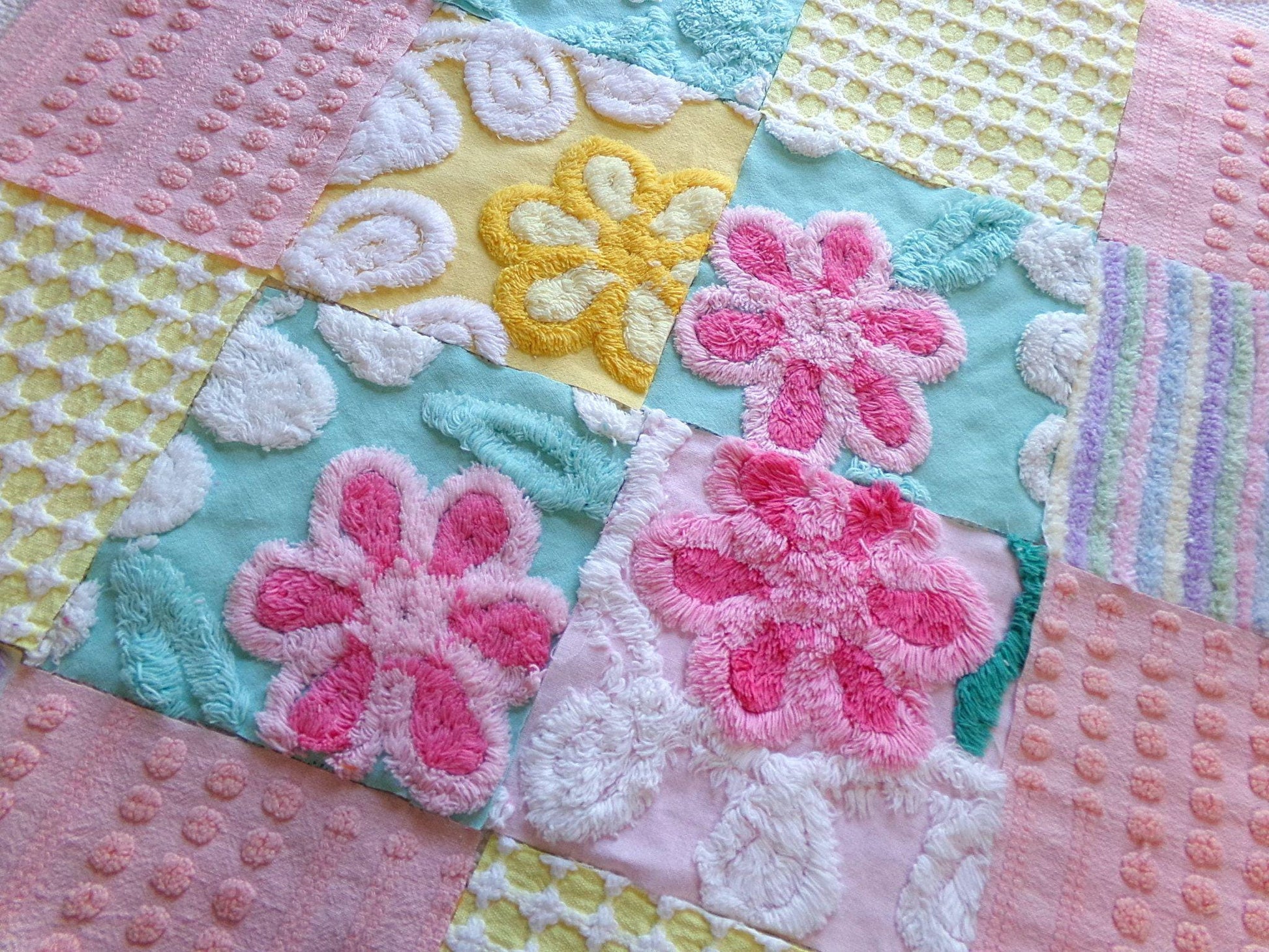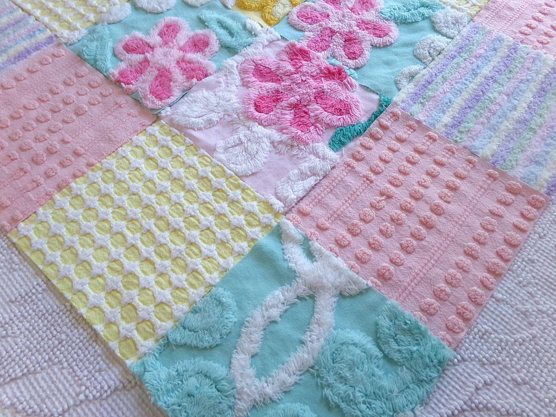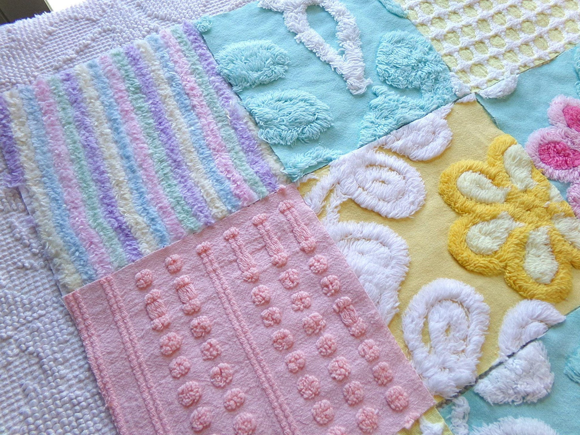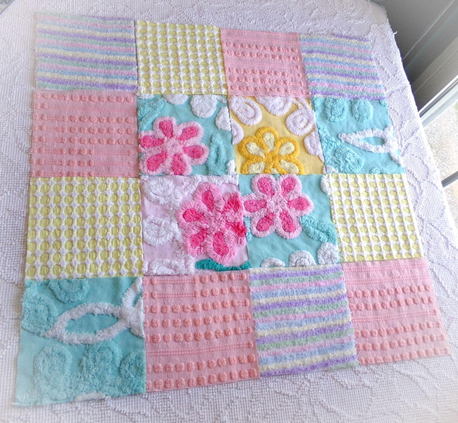 "Spring Spirit" ... Here is a pretty set of 16 vintage chenille fabric squares in wonderful springtime colors, emphasizing pink, yellow, aqua and even the colors of the rainbow thanks to a few pretty pastel striped squares. Three woven yellow & white blocks give a pop of sunshine.::total qty: 16 chenille quilt squares
