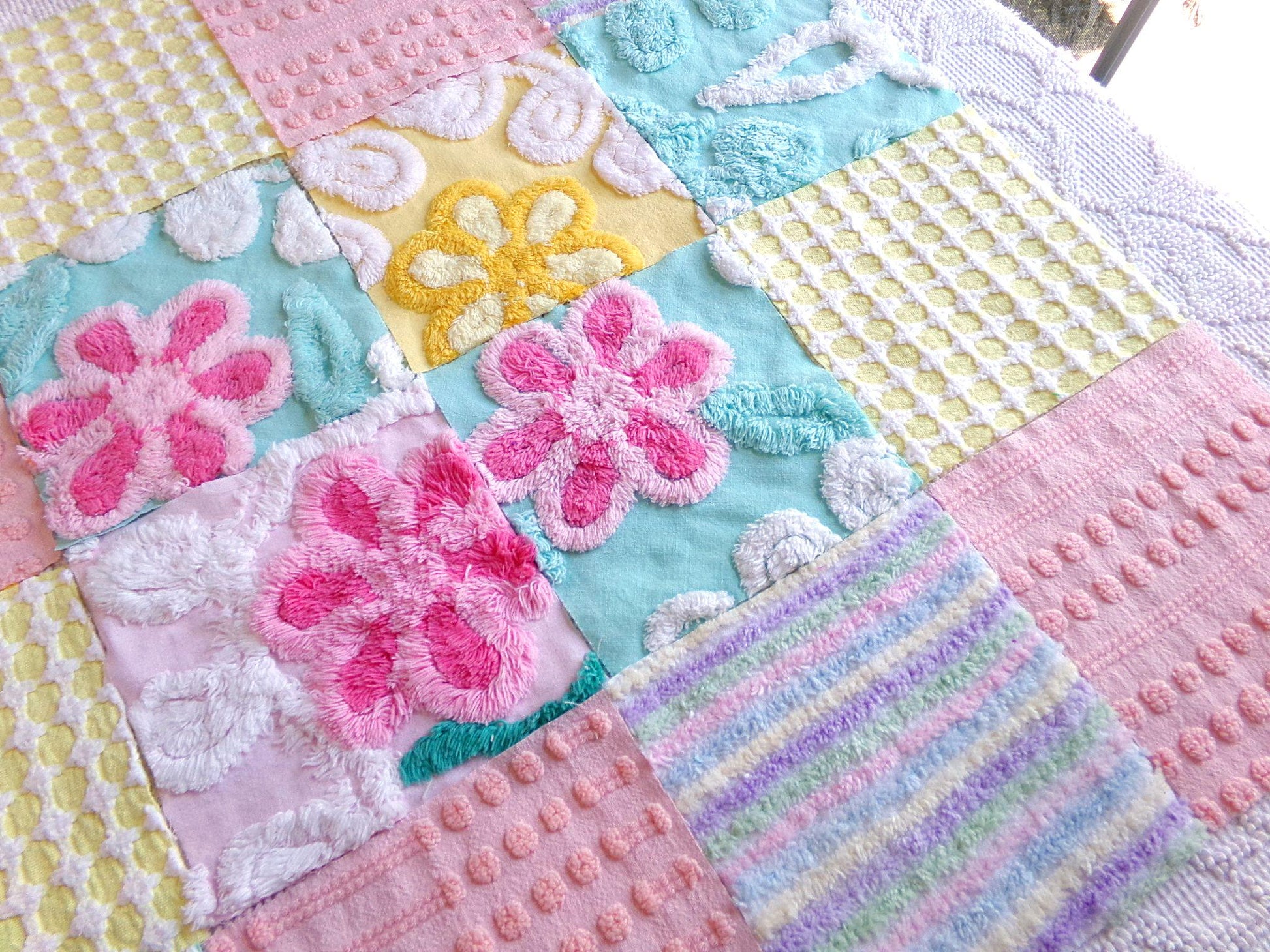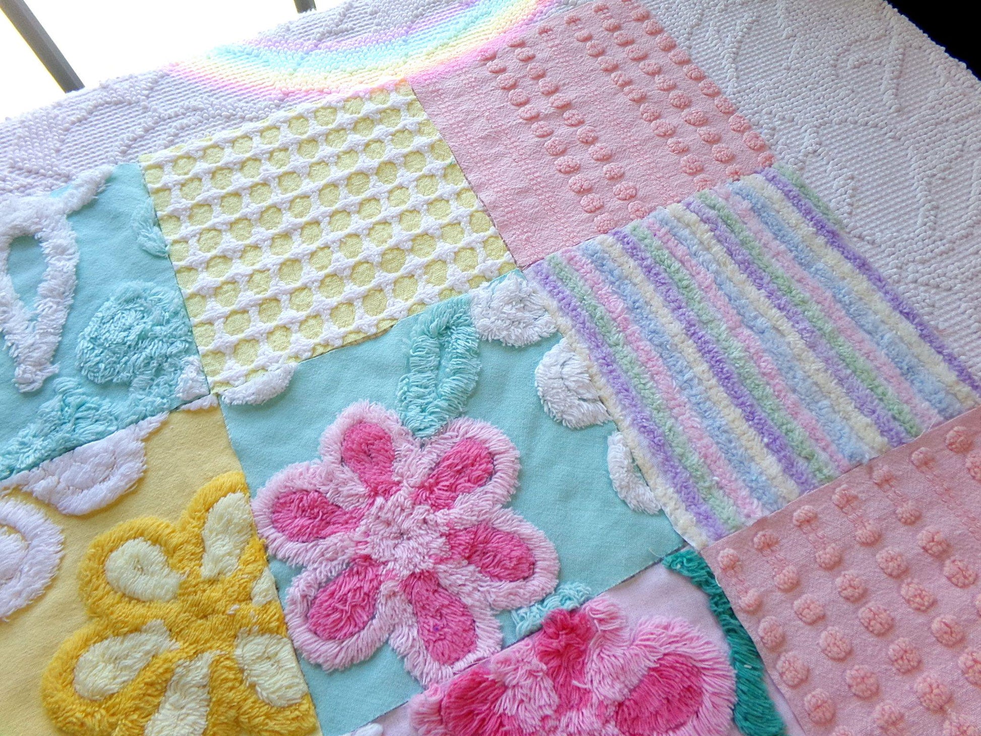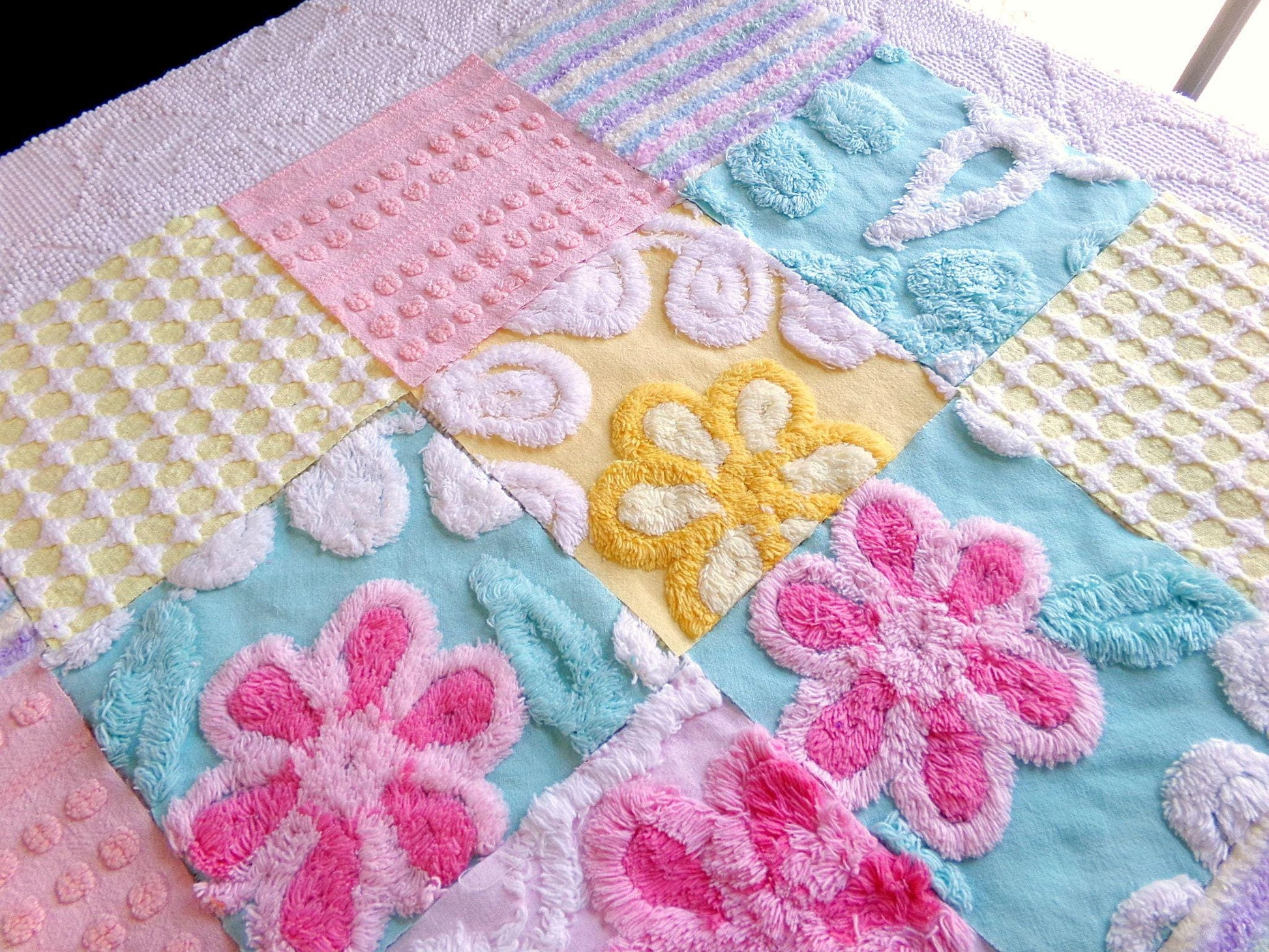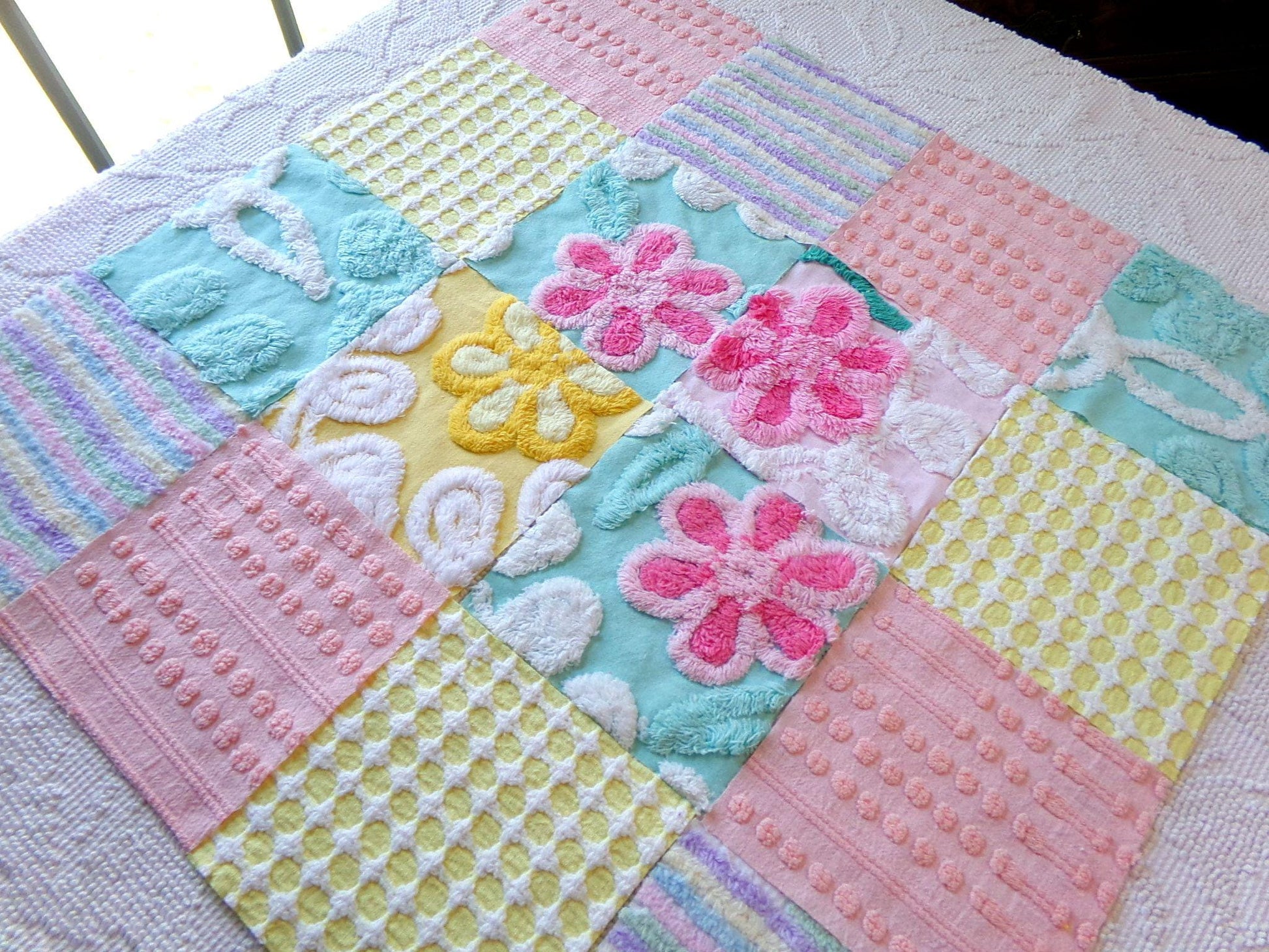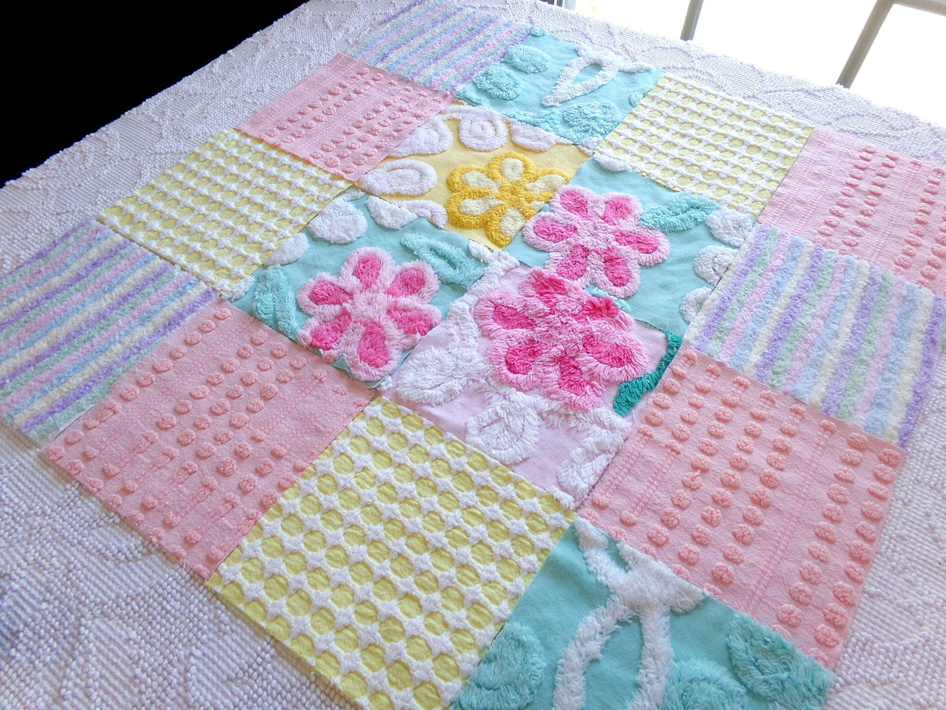 "Spring Spirit" ... Here is a pretty set of 16 vintage chenille fabric squares in wonderful springtime colors, emphasizing pink, yellow, aqua and even the colors of the rainbow thanks to a few pretty pastel striped squares. Three woven yellow & white blocks give a pop of sunshine.::total qty: 16 chenille quilt squares