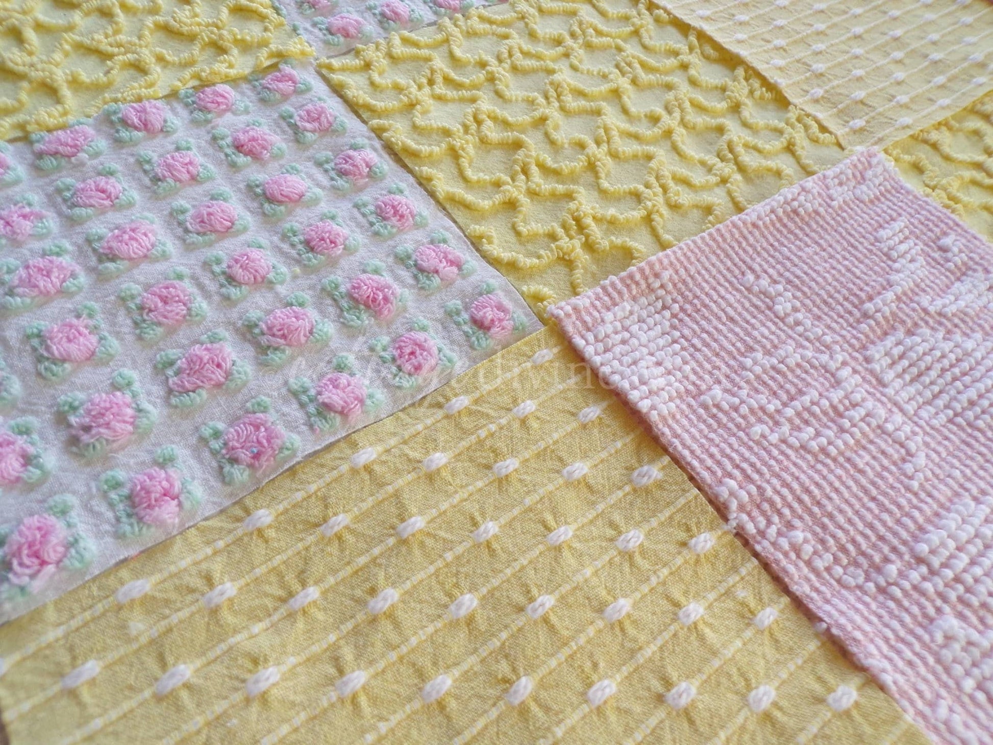 ::joyful yellow squiggles, lovely rosebuds, woven Bates "rain" in yellow & white, pastel pink & white hobnail