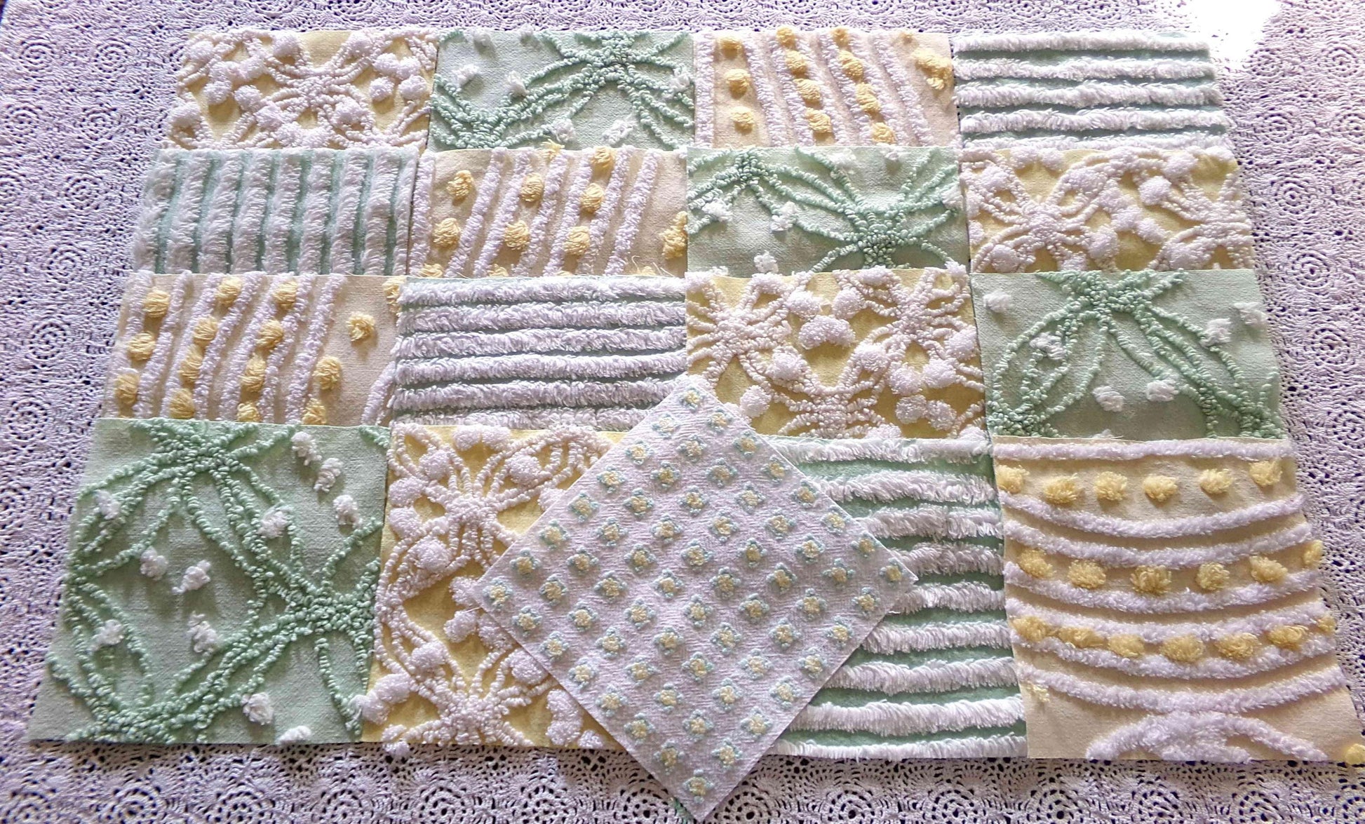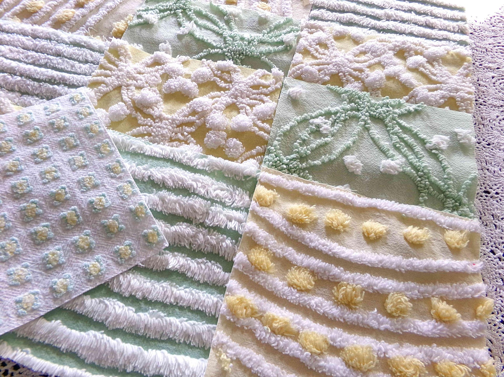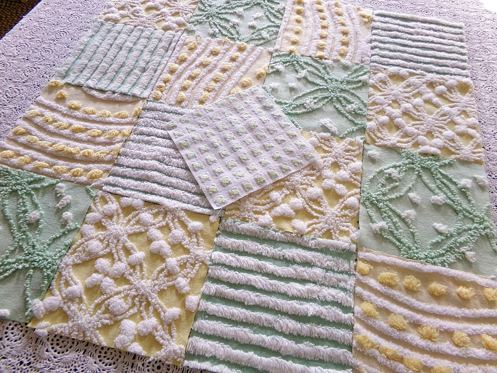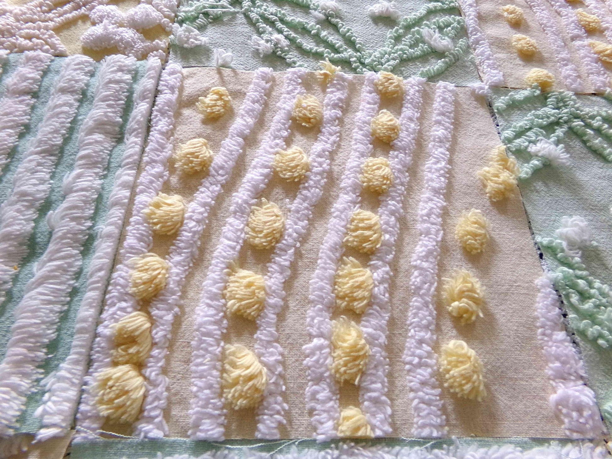 Reminiscent of a fresh springtime morning, this is a set of 17 vintage chenille fabric squares in uplifting shades of green, yellow and white.This selection includes 4 of each of the following patterns: jade green wedding ring, yellow dots/lines, white & yellow spider tuft pops & green/white stripe. Plus one (1) miniature yellow rosebud square.