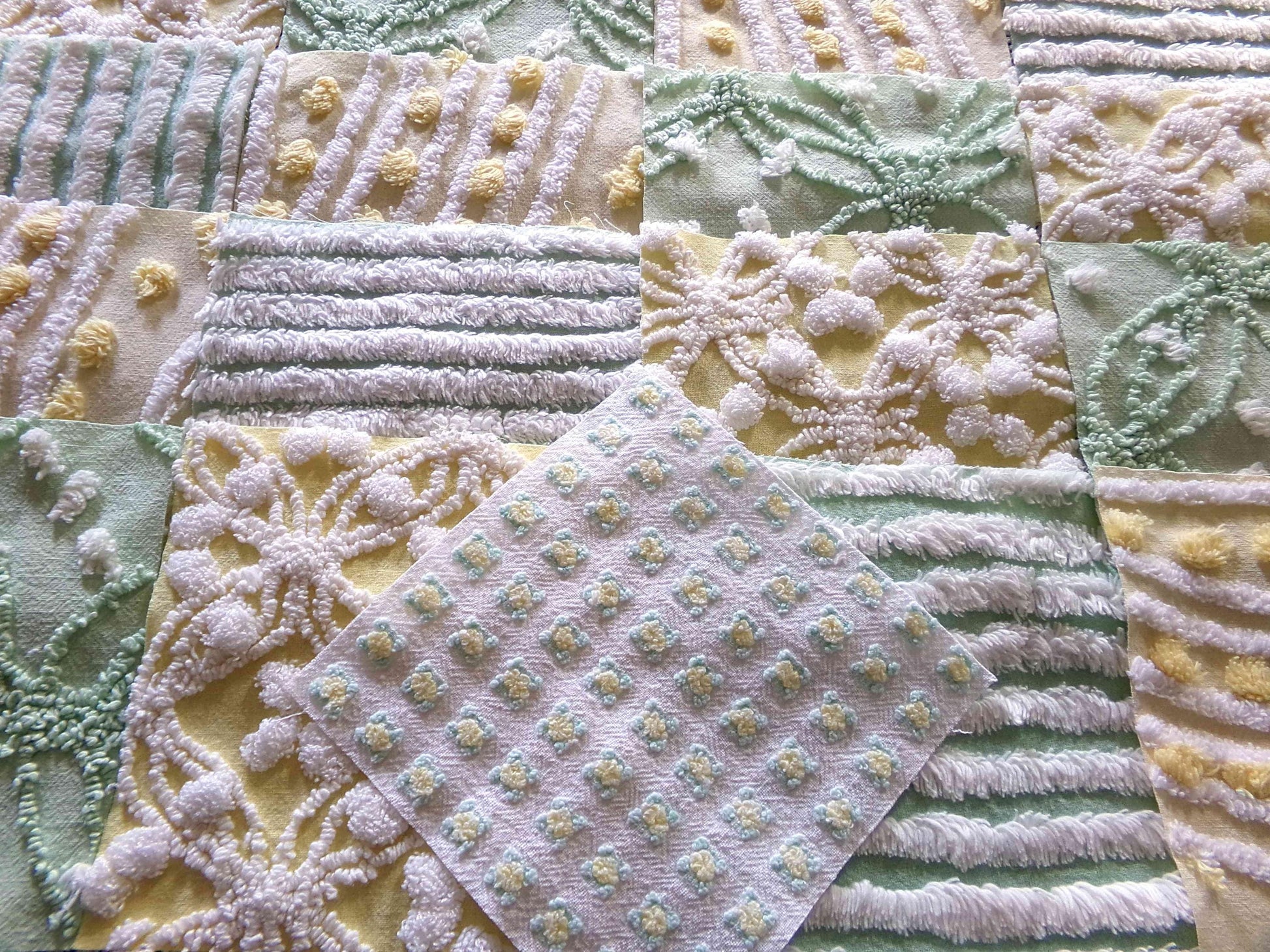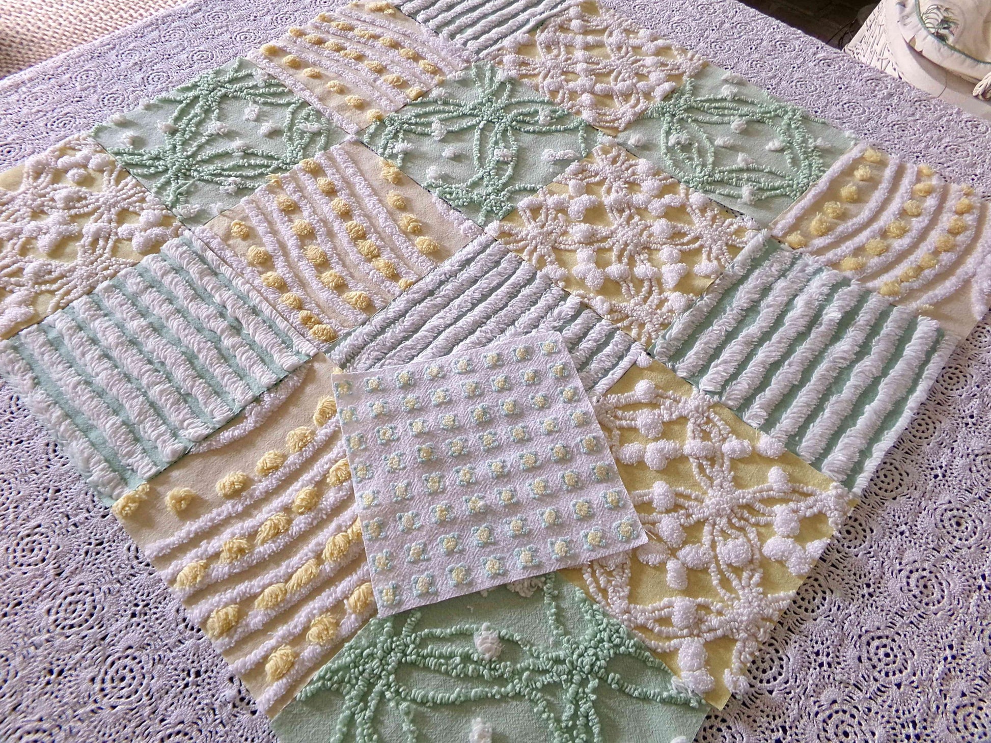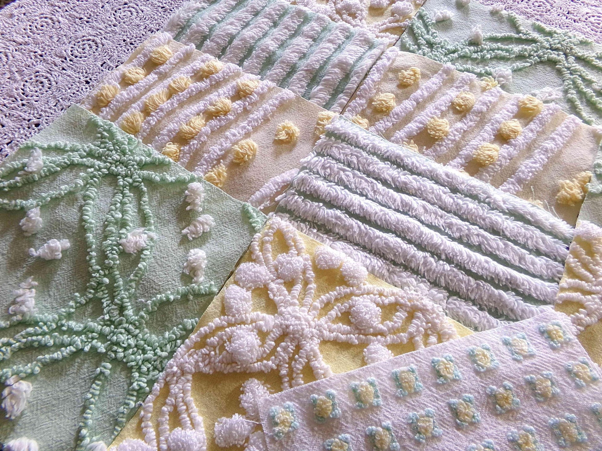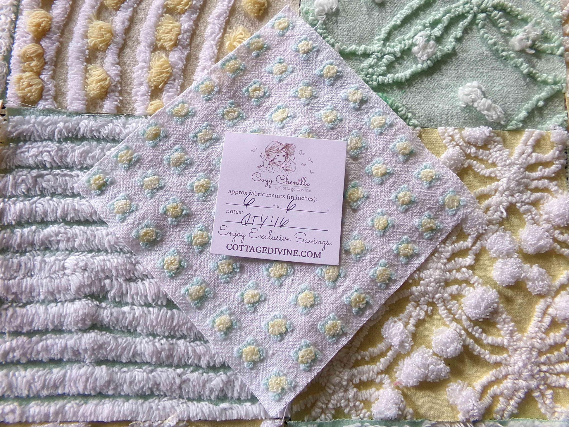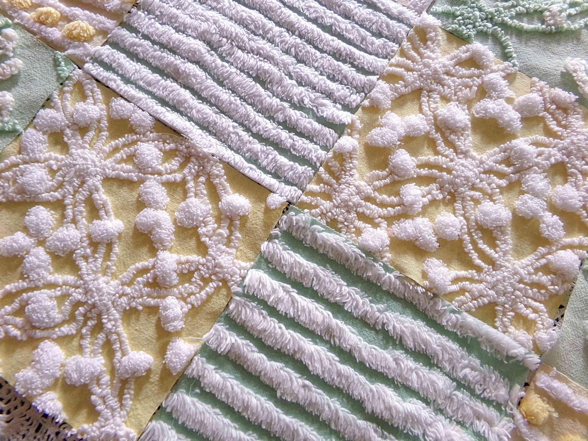 Reminiscent of a fresh springtime morning, this is a set of 17 vintage chenille fabric squares in uplifting shades of green, yellow and white.This selection includes 4 of each of the following patterns: jade green wedding ring, yellow dots/lines, white & yellow spider tuft pops & green/white stripe. Plus one (1) miniature yellow rosebud square.
