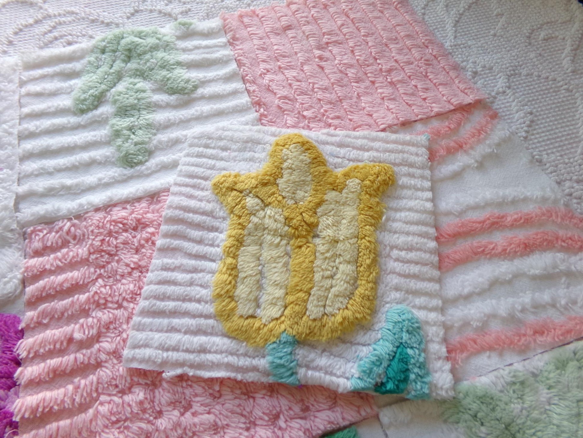 "Springtime Mix" is a lovely set of 17 vintage chenille squares in a fun variety of springtime colors and cute textures that compliment each other well. Also included is a cute little yellow tulip block...because it's just so cute. 🌷You'll receive a total of 17 fabric squares measuring 6" x 6" each. It is the only set I have available like this.