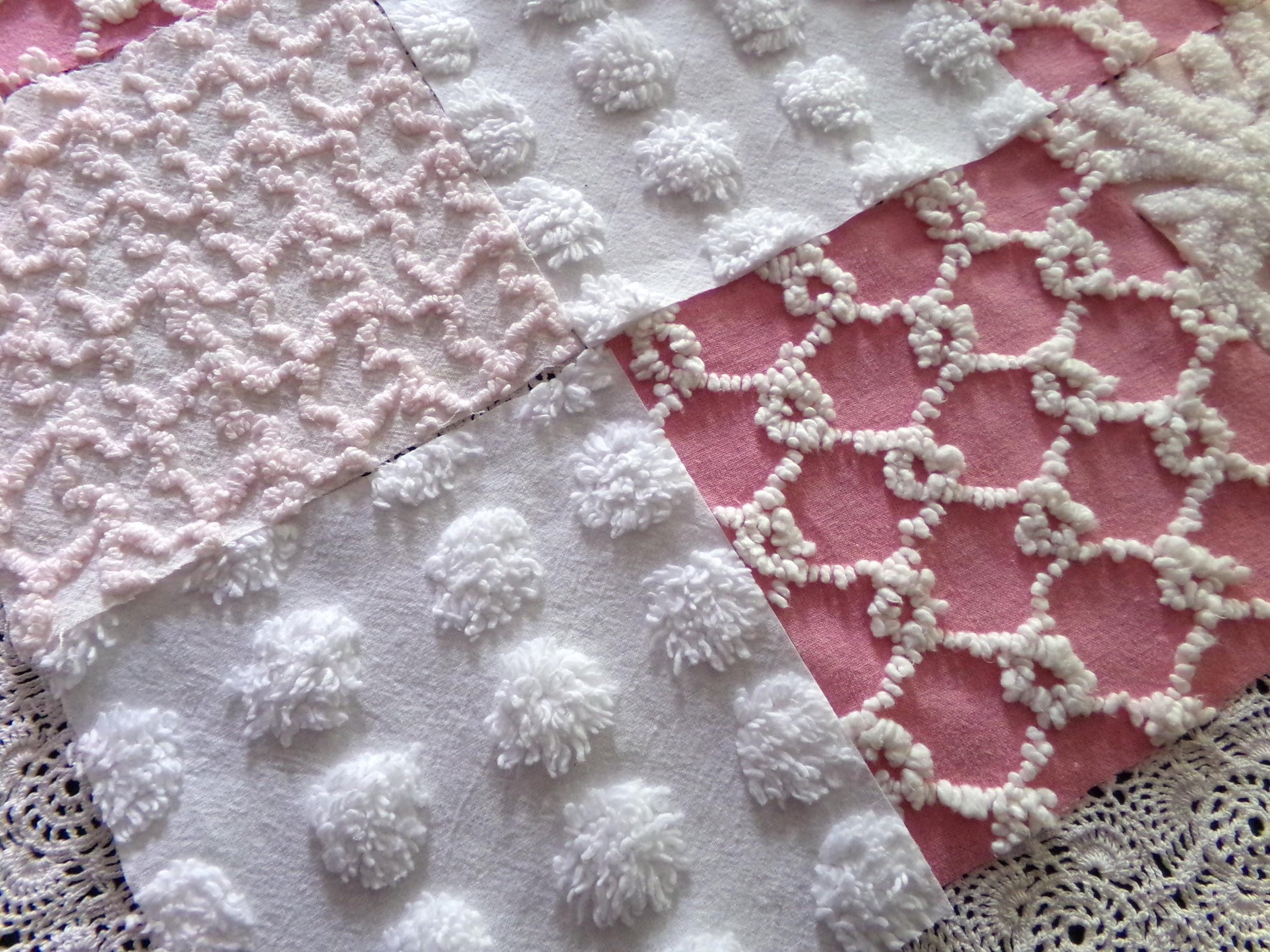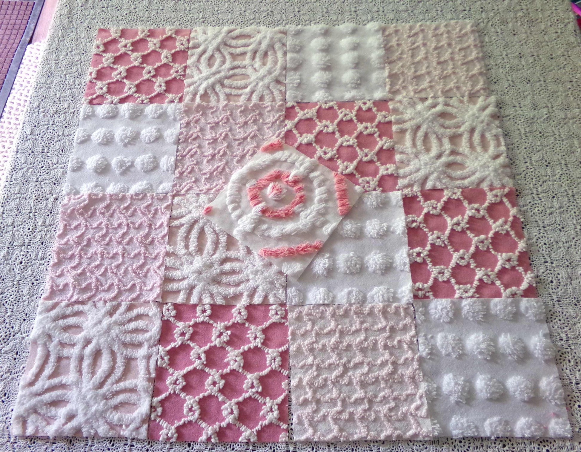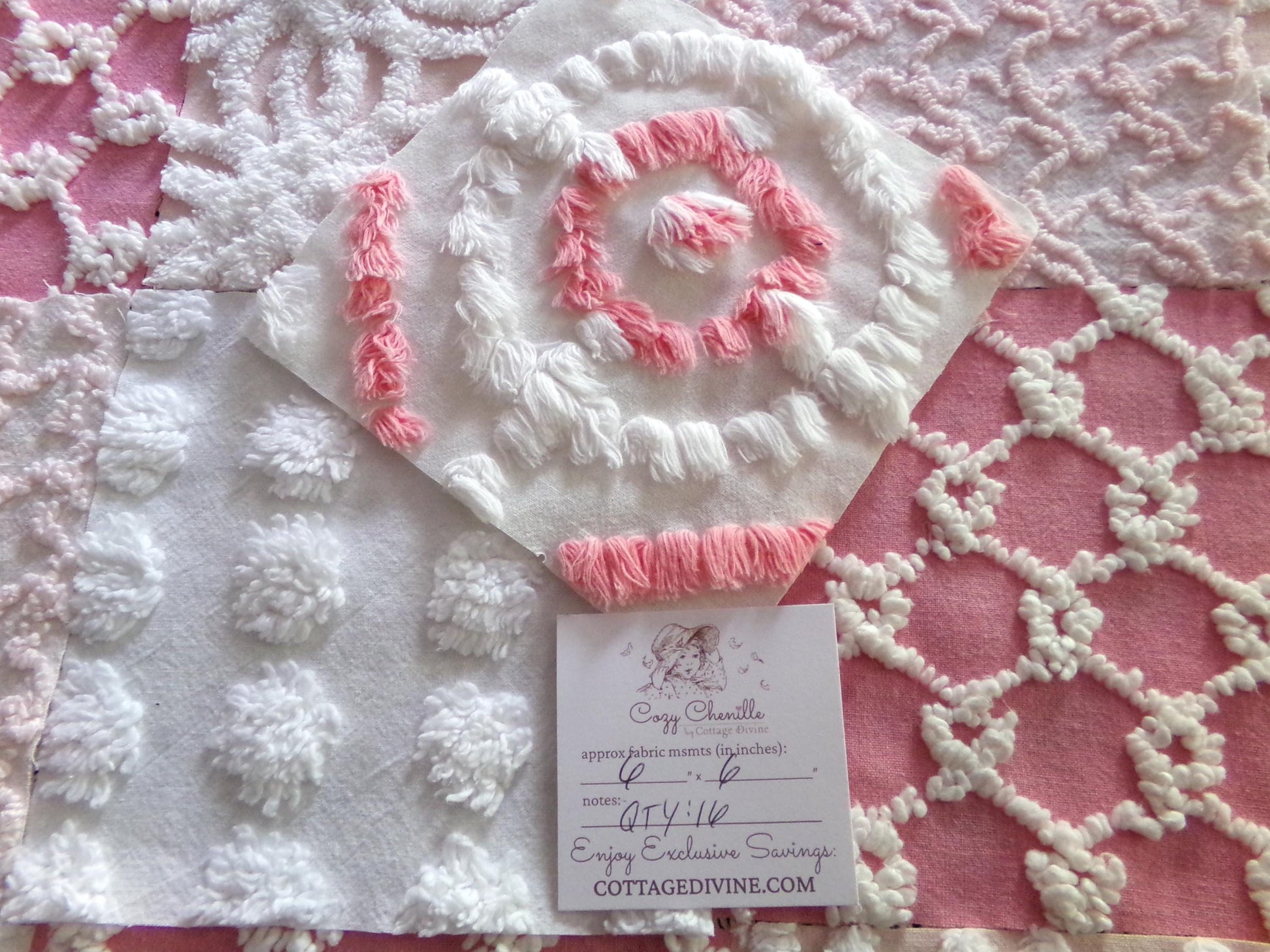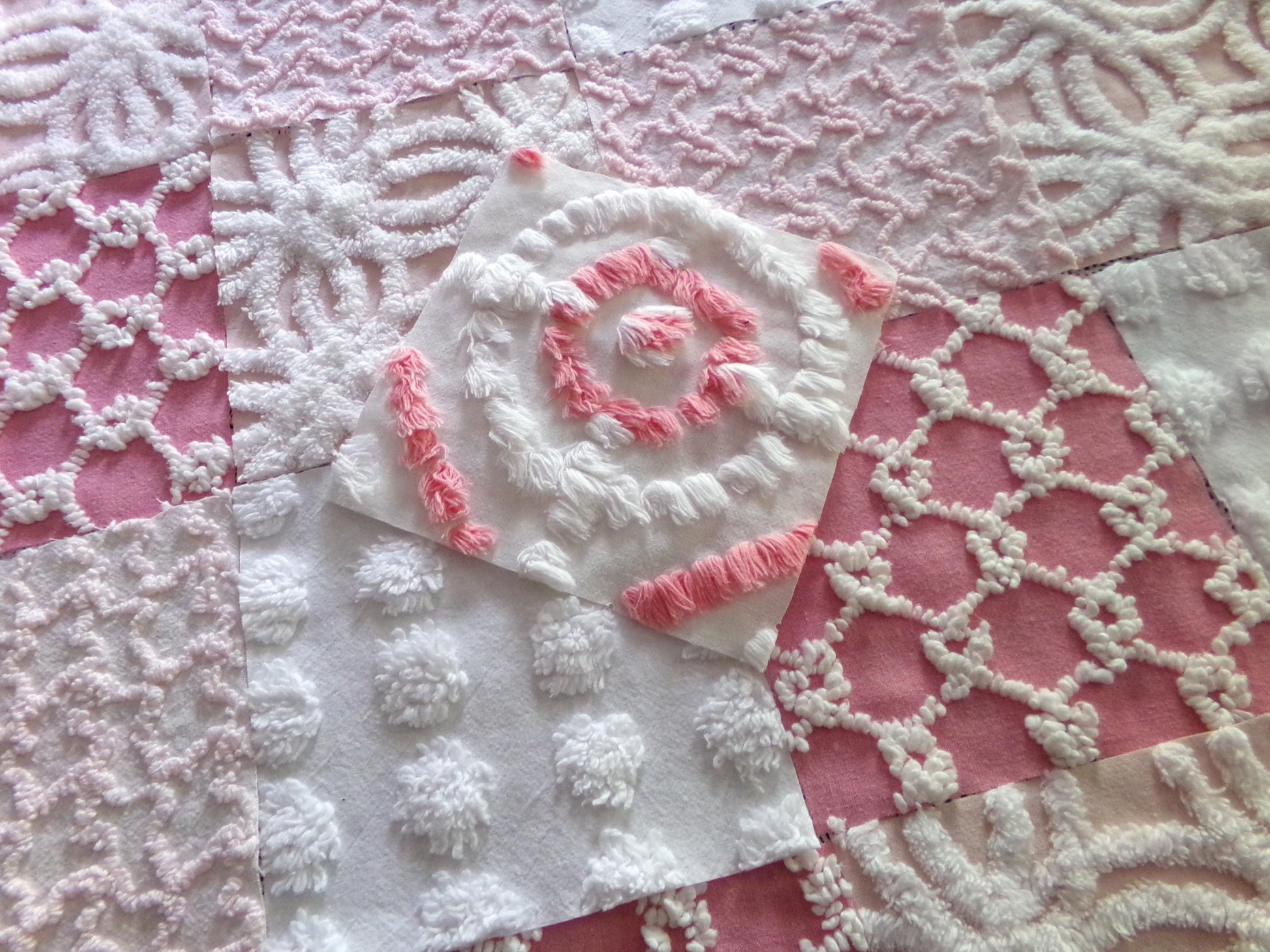 Enhance or inspire your next project with this spunky set of fabric squares in shades of pink & white. A great range of colors and textures to add visual interest. This set includes one pink & white bullseye handtufted antique block.::total qty: 17 chenille quilt squares