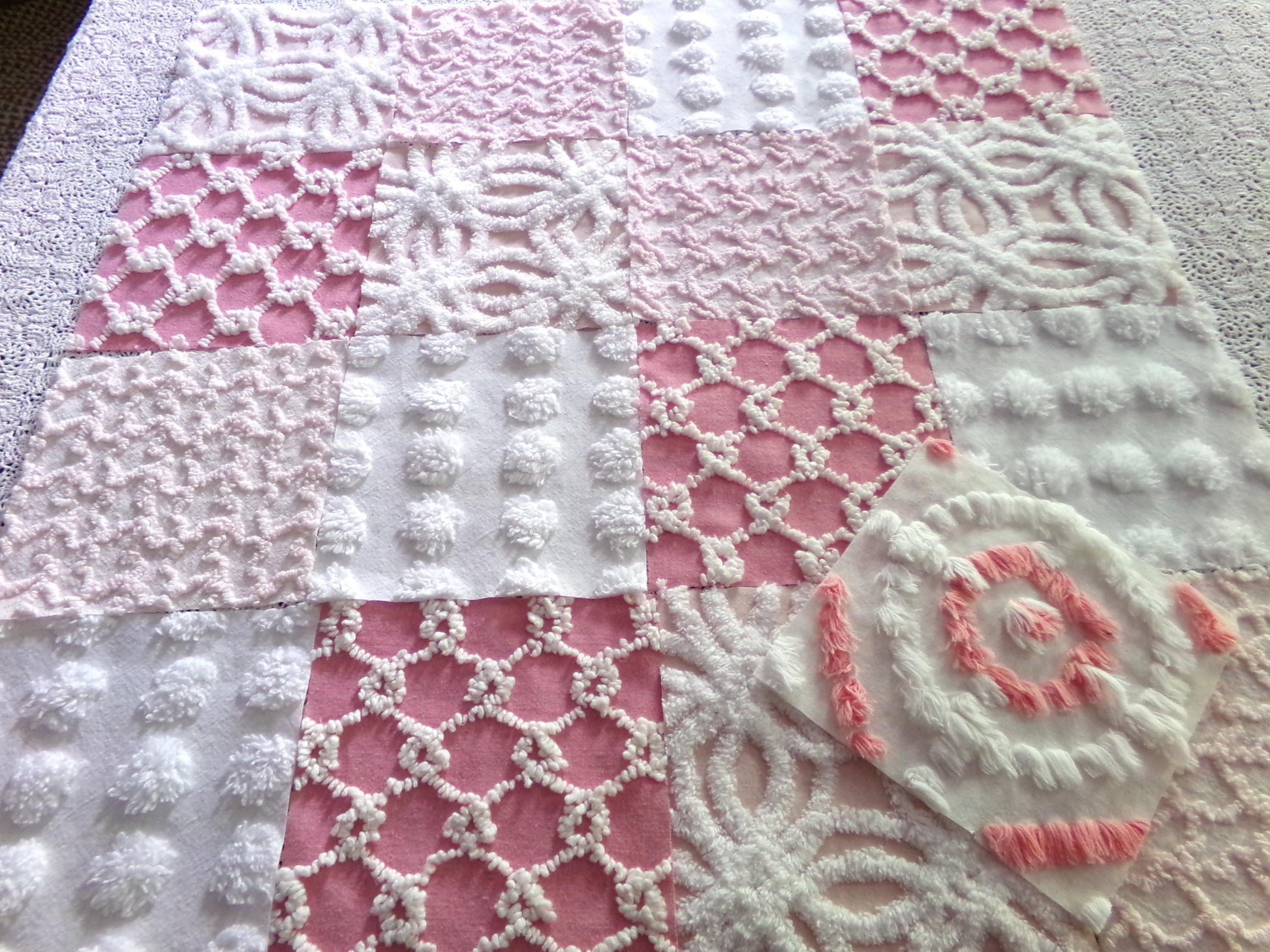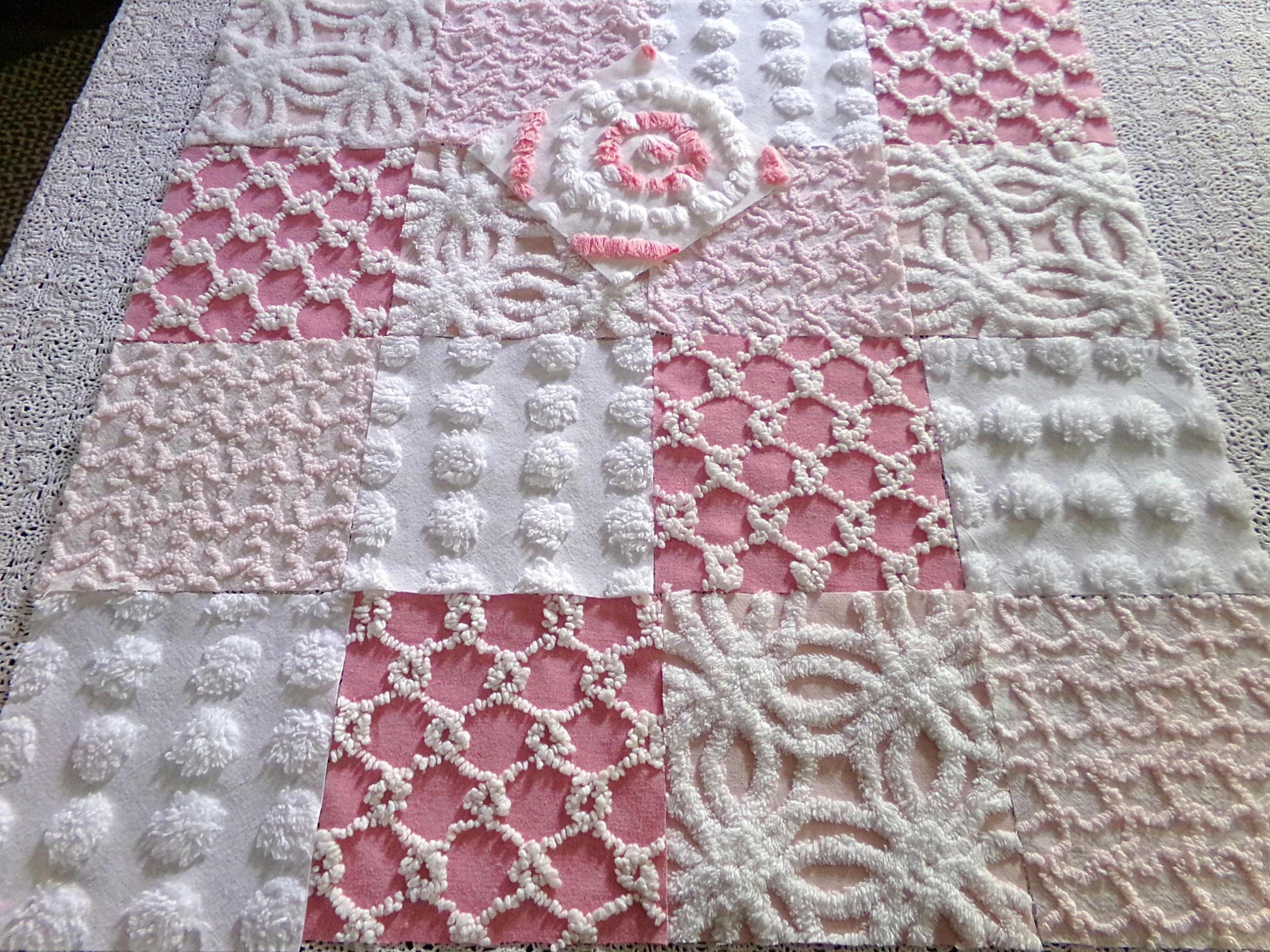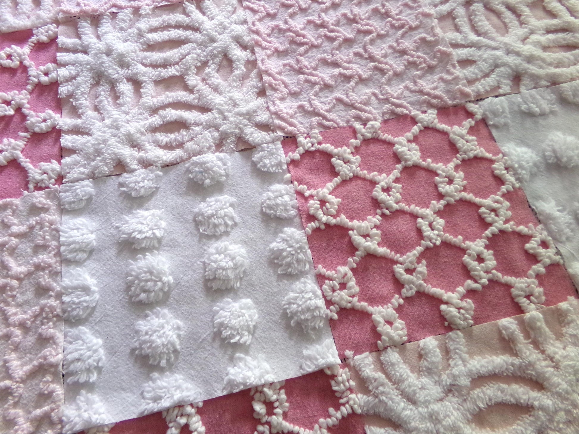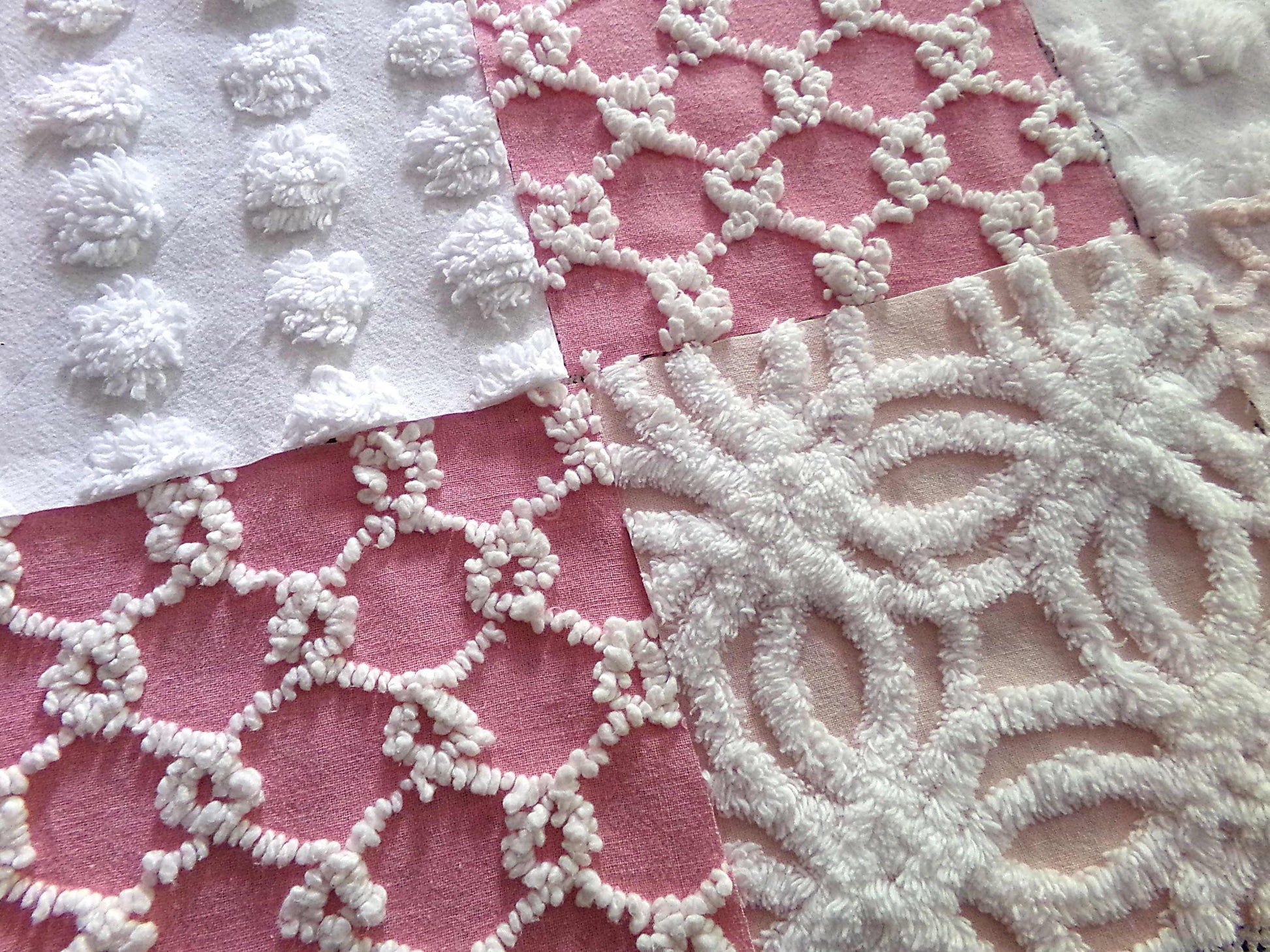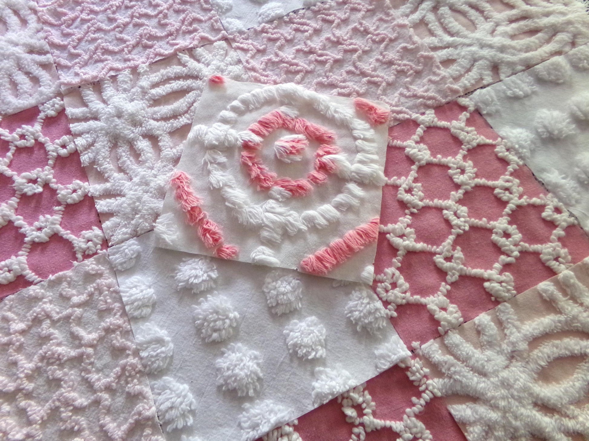Enhance or inspire your next project with this spunky set of fabric squares in shades of pink & white. A great range of colors and textures to add visual interest. This set includes one pink & white bullseye handtufted antique block.::total qty: 17 chenille quilt squares