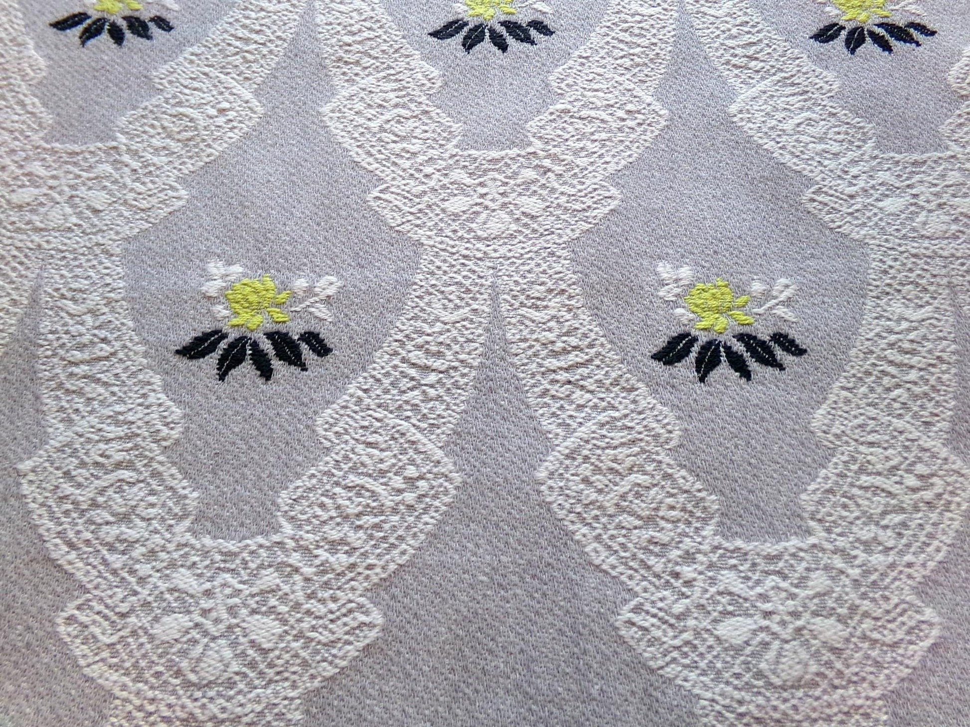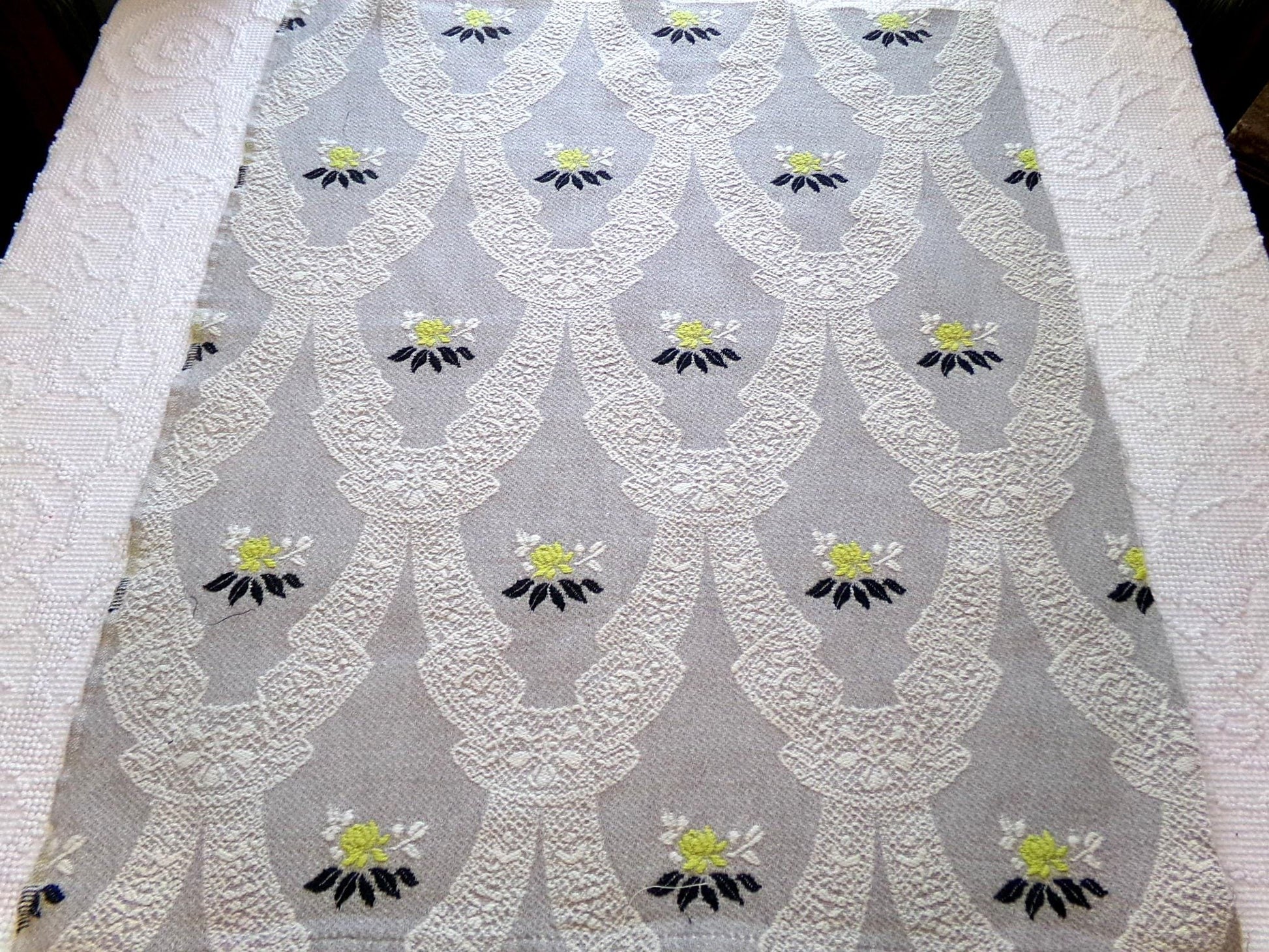 This beautiful, reversible shabby chic woven fabric piece features single petite chartreuse rose florals situated in elongated lace swags. Photo #6 shows reverse side.Sourced from a Bates vintage bedspread in one of their rarest colorways - a silvery-grey bkgd with black accents. (This is woven, not chenille fabric.)