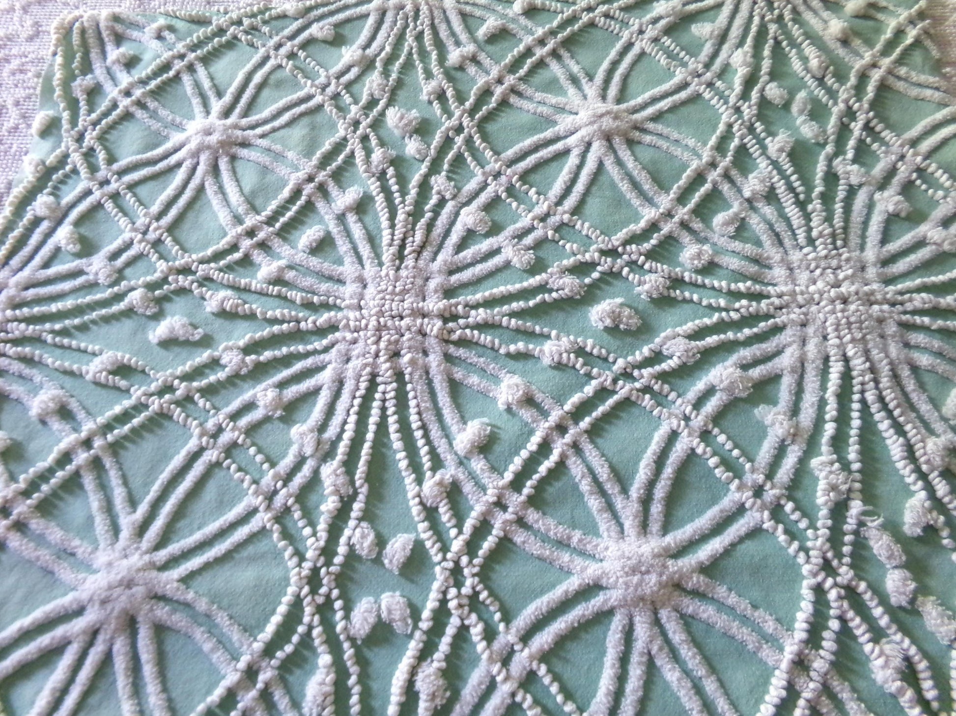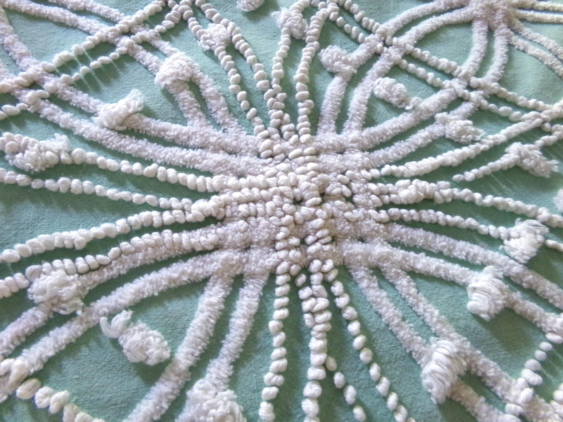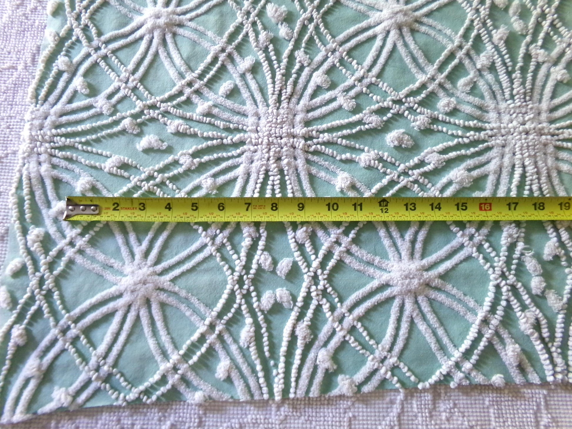 This striking fabric cut from a vintage chenille bedspread features a white spider tuft design set on creamy mint green. The fabric delivers outstanding visual and textural interest to any creation.Measures approx 19" x 23" inches. 100% midcentury cotton. A seldom seen design by vintage maker, Cabin Crafts.